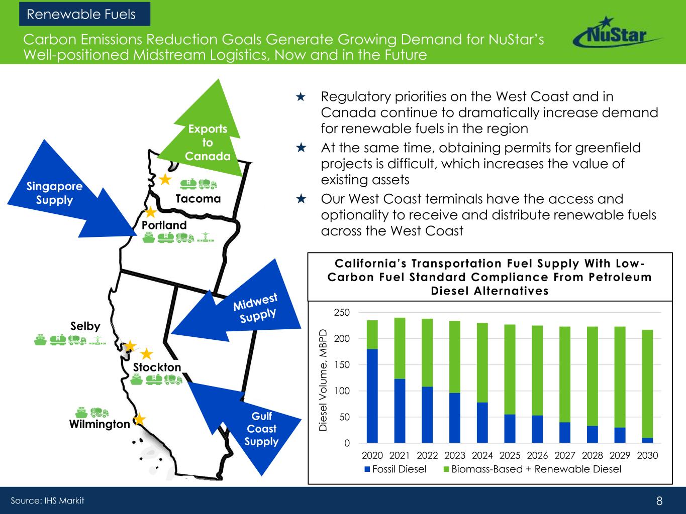 8 Carbon Emissions Reduction Goals Generate Growing Demand for NuStar’s Well-positioned Midstream Logistics, Now and in the Future Stockton Selby Wilmington Gulf Coast Supply Singapore Supply Exports to Canada Tacoma Portland ★ Regulatory priorities on the West Coast and in Canada continue to dramatically increase demand for renewable fuels in the region ★ At the same time, obtaining permits for greenfield projects is difficult, which increases the value of existing assets ★ Our West Coast terminals have the access and optionality to receive and distribute renewable fuels across the West Coast 0 50 100 150 200 250 2020 2021 2022 2023 2024 2025 2026 2027 2028 2029 2030 D ie se l V o lu m e , M B P D Fossil Diesel Biomass-Based + Renewable Diesel Source: IHS Markit California’s Transportation Fuel Supply With Low- Carbon Fuel Standard Compliance From Petroleum Diesel Alternatives Renewable Fuels