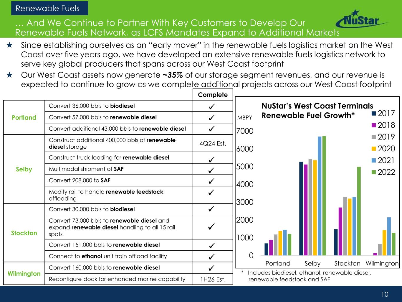 9 ★ We expect our EBITDA to increase in 2023, along with associated market share, as we complete additional projects presently in planning or under construction • We intend to continue converting tankage to renewable fuels as the market demands ★ Our facilities are positioned to benefit from new production and conversion projects for renewable diesel, sustainable aviation fuel (SAF), ethanol and other renewable fuels across the region BIODIESEL ETHANOL RENEWABLE DIESEL 5% 10% 18% NuStar’s Proportionate Share of California’s Renewable Fuels Market (Total Volume for the Four Quarters Ended September 30, 20221) Source: California Air Resource Board (CARB) 1 – Most recent data available We Have Captured a Significant (and Still Growing) Proportion of the Region’s Renewable Fuels Supply… SUSTAINABLE AVIATION FUEL 80% Renewable Fuels