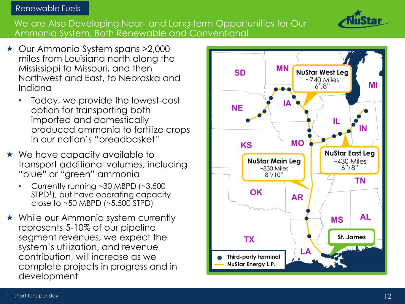 12 Our Ammonia System spans >2,000 miles from Louisiana north along the Mississippi to Missouri, and then Northwest and East, to Nebraska and Indiana • Today, we provide the lowest-cost option for transporting both imported and domestically produced ammonia to fertilize crops in our nation’s “breadbasket” We have capacity available to transport additional volumes, including “blue” or “green” ammonia • Currently running ~30 MBPD (~3,500 STPD1), but have operating capacity close to ~50 MBPD (~5,500 STPD) While our Ammonia system currently represents 5-10% of our pipeline segment revenues, we expect the system’s utilization, and revenue contribution, will increase as we complete projects in progress and in development We are Also Developing Near- and Long-term Opportunities for Our Ammonia System, Both Renewable and Conventional 1 – short tons per day Renewable Fuels Third-party terminal NuStar Energy L.P. St. James