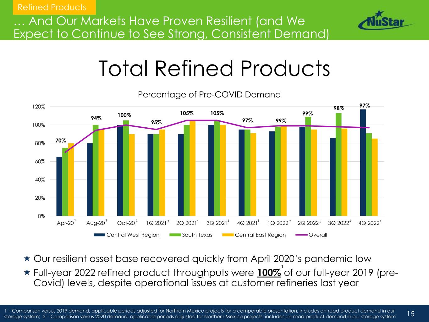 14 NuStar’s Refined Products Systems Serve Key Markets Across the Midcontinent and Texas… Midcontinent Systems- ★ CENTRAL EAST: A 2,500-mile pipeline system with multiple delivery options • East Pipeline – This system serves important markets across the Midwest/West, with flexible refined product supply from refineries in McPherson, Kansas, El Dorado, Kansas and Ponca City, Oklahoma • North Pipeline – System flows from North Dakota to the Twin Cities, serving both rural markets and large cities with refined product supply from Mandan, North Dakota refinery ★ CENTRAL WEST: Comprised of approximately 2,000 miles of structurally exclusive pipeline, supplied from the McKee, Texas refinery serving markets in Texas and nearby states South Texas Systems- ★ Around 700 miles of structurally exclusive pipeline, supplied from refineries located in Corpus Christi and Three Rivers, Texas serving markets in Texas and northern Mexico Refined Products