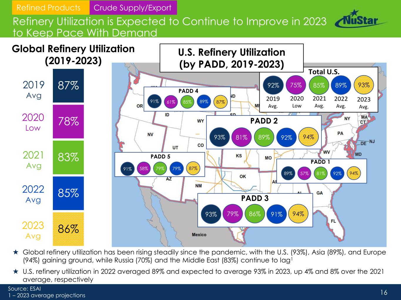 22 Our Corpus Christi Crude System’s MVCs- for Export and Local Refinery Supply- Provide Strength & Stability In-bound Capacity Storage Capacity Outbound Capacity ★ Unlike most other midstream operators in the Port of Corpus Christi, NuStar provides optionality for marine exports and extensive connectivity to local refineries ★ U.S. shale production growth and improving global demand will drive the recovery and growth in our CCCS volumes TOTAL: 3.9MMbbl • Potential expansion 0.4MMbbl TOTAL: 1.2MMBPD • South Texas Crude System 16” Pipeline - 240MBPD • Taft 30”- 720MBPD and expandable • Harvest 16” Pipeline - 240MBPD TOTAL: 1.2MMBPD • Export Docks- 750MBPD to 1.0MMBPD • Refinery Supply- 220MBPD ★ Our Corpus Christi Crude System (CCCS) is comprised of our South Texas Crude Oil Pipeline System, our 12” Three Rivers Supply Pipeline, our 30” pipeline from Taft and our North Beach Export Terminal, which also receives volumes from Harvest’s 16” Pipeline and delivers to local refineries ★ In July 2022, we extended our MVC contract with Trafigura for an additional year and a half, through December 2024 Crude Supply/Export
