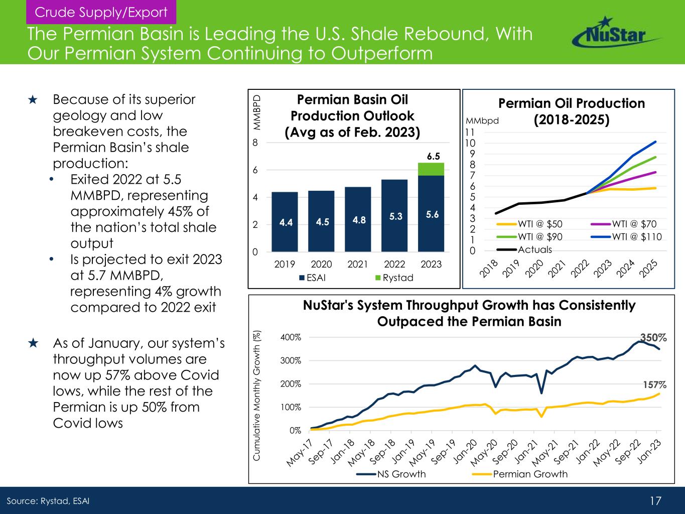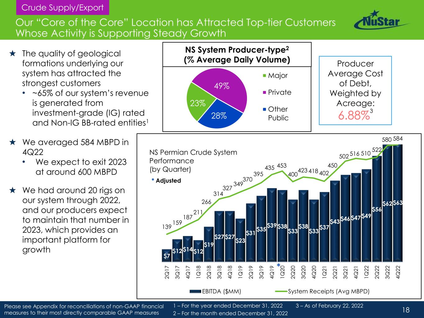 17 The Permian Basin is Leading the U.S. Shale Rebound, With Our Permian System Continuing to Outperform ★ Because of its superior geology and low breakeven costs, the Permian Basin’s shale production: • Exited 2022 at 5.5 MMBPD, representing approximately 45% of the nation’s total shale output • Is projected to exit 2023 at 5.7 MMBPD, representing 4% growth compared to 2022 exit ★ As of January, our system’s throughput volumes are now up 57% above Covid lows, while the rest of the Permian is up 50% from Covid lows Source: Rystad, ESAI - Crude Supply/Export 0 1 2 3 4 5 6 7 8 9 10 11 MMbpd Th o u sa n d s Permian Oil Production (2018-2025) WTI @ $50 WTI @ $70 WTI @ $90 WTI @ $110 Actuals 4.4 4.5 4.8 5.3 5.6 6.5 0 2 4 6 8 2019 2020 2021 2022 2023 M M B P D Permian Basin Oil Production Outlook (Avg as of Feb. 2023) ESAI Rystad 350% 157% 0% 100% 200% 300% 400% C u m u la ti v e M o n th ly G ro w th ( % ) NuStar's System Throughput Growth has Consistently Outpaced the Permian Basin NS Growth Permian Growth