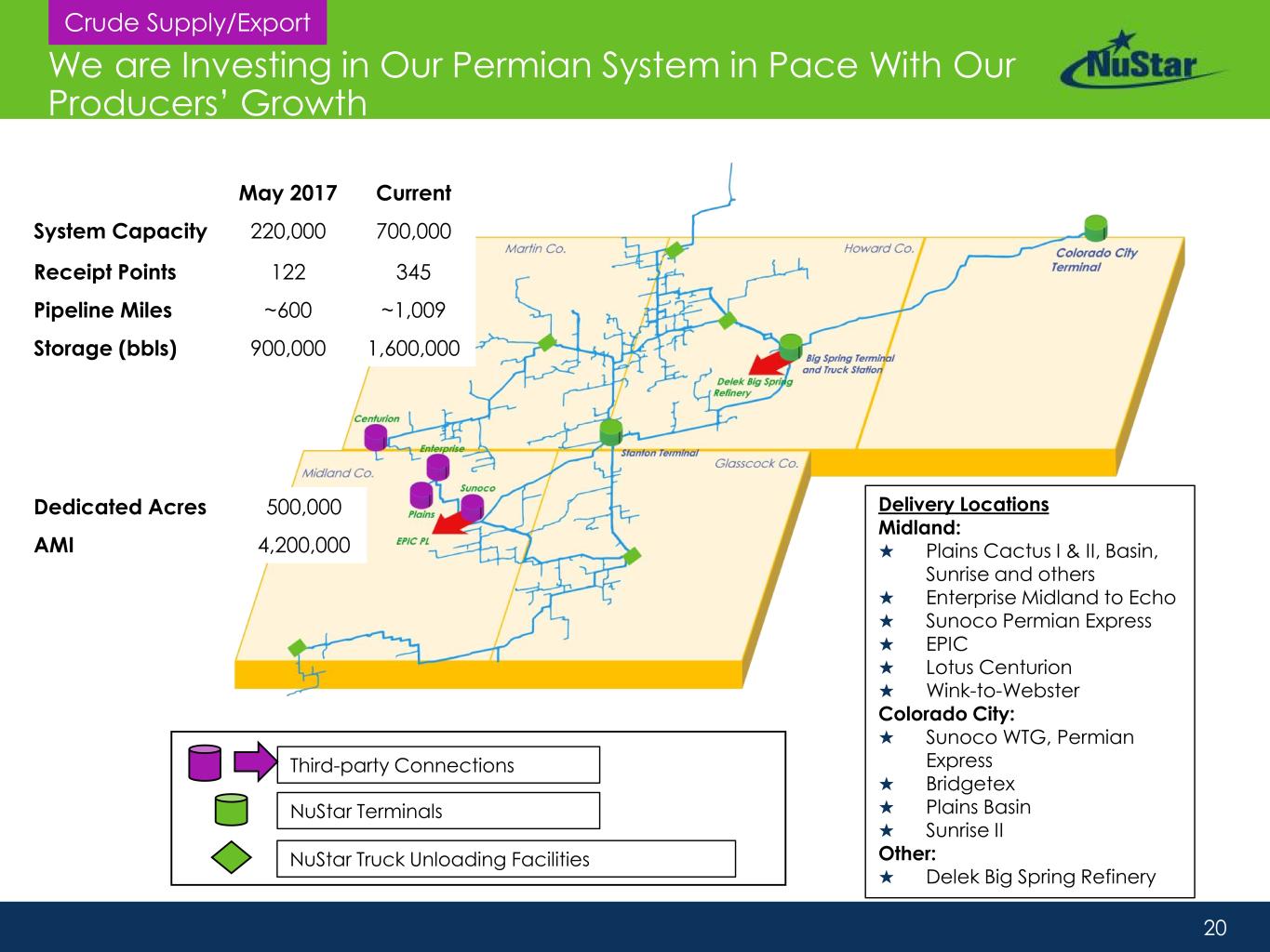 20 We are Investing in Our Permian System in Pace With Our Producers’ Growth Dedicated Acres 500,000 AMI 4,200,000 May 2017 Current System Capacity 220,000 700,000 Receipt Points 122 345 Pipeline Miles ~600 ~1,009 Storage (bbls) 900,000 1,600,000 Third-party Connections NuStar Terminals NuStar Truck Unloading Facilities Delivery Locations Midland: ★ Plains Cactus I & II, Basin, Sunrise and others ★ Enterprise Midland to Echo ★ Sunoco Permian Express ★ EPIC ★ Lotus Centurion ★ Wink-to-Webster Colorado City: ★ Sunoco WTG, Permian Express ★ Bridgetex ★ Plains Basin ★ Sunrise II Other: ★ Delek Big Spring Refinery Crude Supply/Export