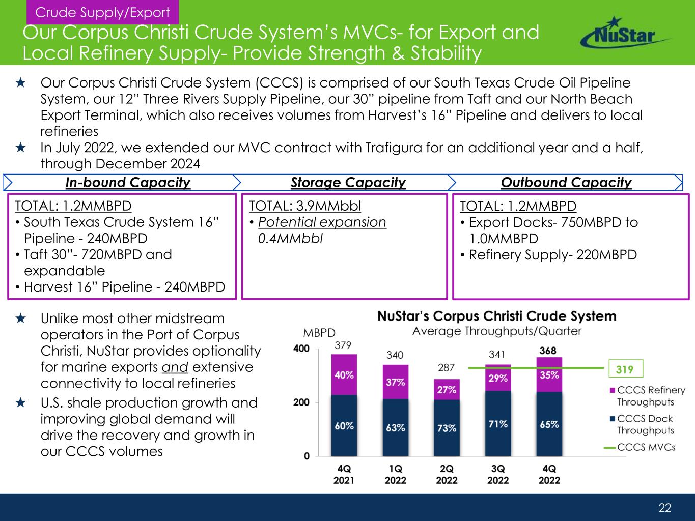 21 99.8 90.4 96.3 98.5 101.5 103.1 103.9 104.7 85 90 95 100 105 2019 2020 2021 2022 2023 2024 2025 2026 M M b p d As Global Demand Recovers, Corpus Christi is Expected to Continue to be the Export Hub Best Positioned for Future Growth Corpus Christi has remained the dominant Gulf Coast crude exports hub since 2020 • In 2022, 61% of the U.S. Gulf Coast’s total export volumes left via Corpus Christi-based terminals U.S. Gulf Coast crude exports are projected to continue at record volumes due to the ongoing war in Ukraine and global demand recovery Improved global refined product demand should continue to lead the way to further recovery in global crude demand Source: RBN Energy, ESAI Global Crude Oil Demand 61%22% 7% 10% U.S. Gulf Coast Crude Exports by Hub (2022) Corpus Christi Houston Beaumont Louisiana Global Refined Product Demand* *Comprised of gasoline and diesel demand Crude Supply/Export 54.3 49.2 52.7 53.8 54.7 55.2 55.6 55.9 45 47 49 51 53 55 57 2019 2020 2021 2022 2023 2024 2025 2026 M M b p d