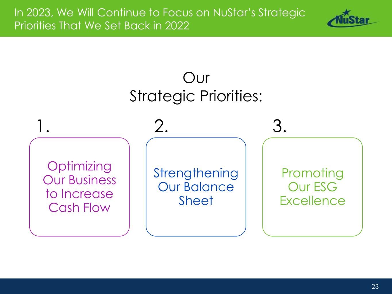 23 In 2023, We Will Continue to Focus on NuStar’s Strategic Priorities That We Set Back in 2022 Optimizing Our Business to Increase Cash Flow Strengthening Our Balance Sheet Promoting Our ESG Excellence Our Strategic Priorities: 1. 2. 3.