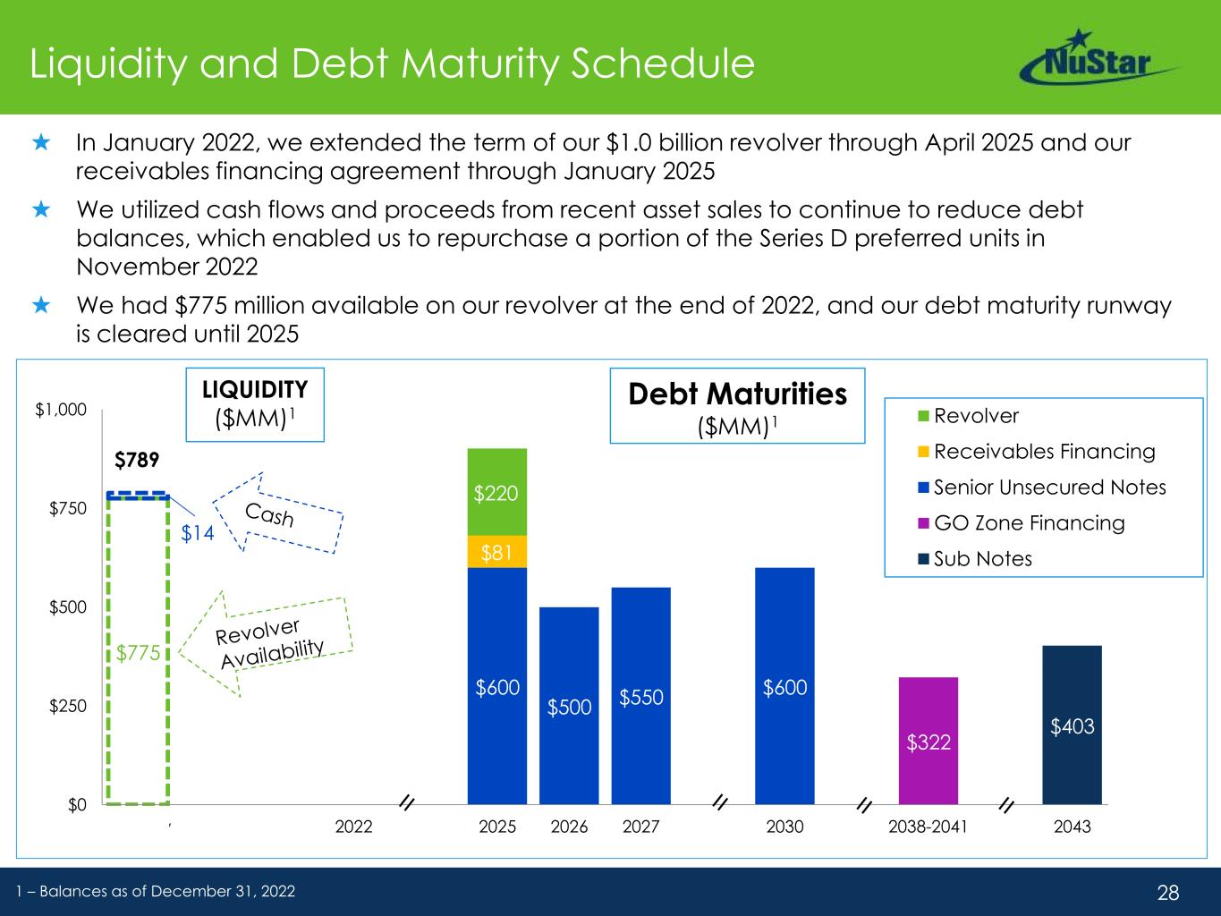 27 Long-term Commitments From Creditworthy Customers 63% 13% 24% Investment-grade Large Private or International (Not rated) Other NuStar Investment-grade Customers (% Pipeline/Storage 2022 YTD Revenues as of December 31, 2022) 28% 43% 29% Take-or-pay Contracts Structurally Exclusive Other Pipeline Segment Contracted1 Revenues (% 2023 Forecast – as of 4Q22) 58% 42% Take-or-pay Contracts Other Storage Segment Contracted Revenues (% 2023 Forecast – as of 4Q22) 1 - Committed through take or pay contracts or through structural exclusivity (uncommitted lines serving refinery customers with no competition)