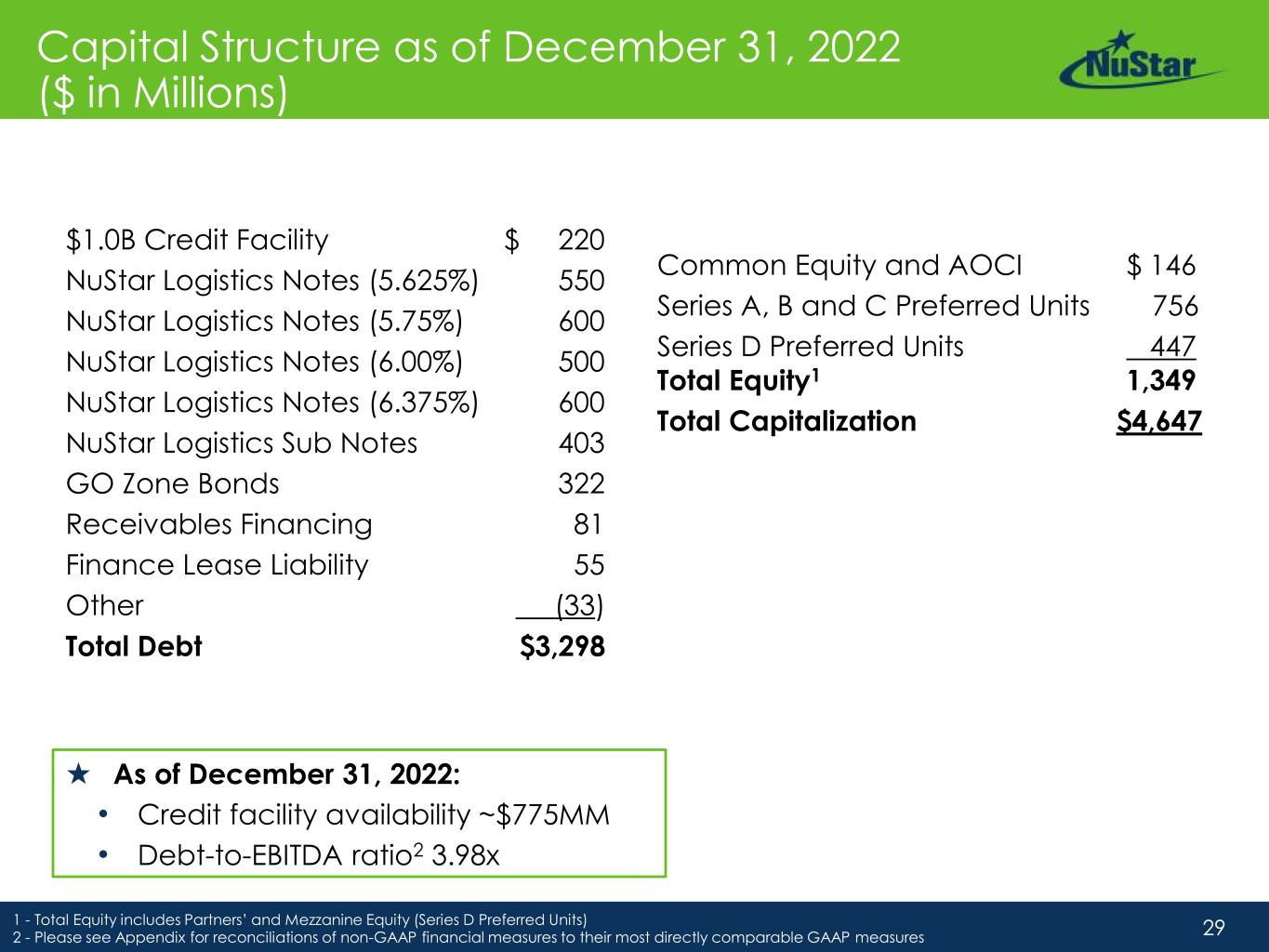 28 $775 $403 $322 $600 $500 $550 $600 $81 $220 $14 $0 $250 $500 $750 $1,000 Liquidity 2022 2023-2024 2025 2026 2027 2028-2029 2030 2038-2041 2043 Revolver Receivables Financing Senior Unsecured Notes GO Zone Financing Sub Notes $789 LIQUIDITY ($MM)1 Liquidity and Debt Maturity Schedule ★ In January 2022, we extended the term of our $1.0 billion revolver through April 2025 and our receivables financing agreement through January 2025 ★ We utilized cash flows and proceeds from recent asset sales to continue to reduce debt balances, which enabled us to repurchase a portion of the Series D preferred units in November 2022 ★ We had $775 million available on our revolver at the end of 2022, and our debt maturity runway is cleared until 2025 Debt Maturities ($MM)1 1 – Balances as of December 31, 2022