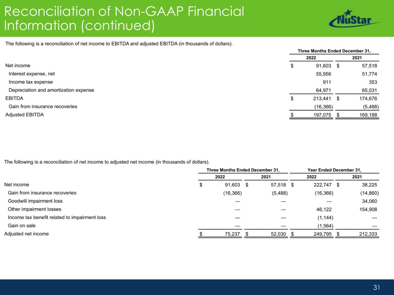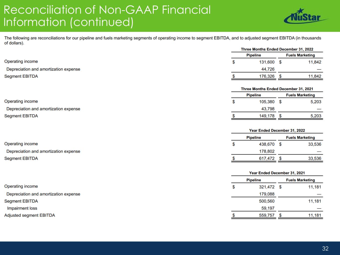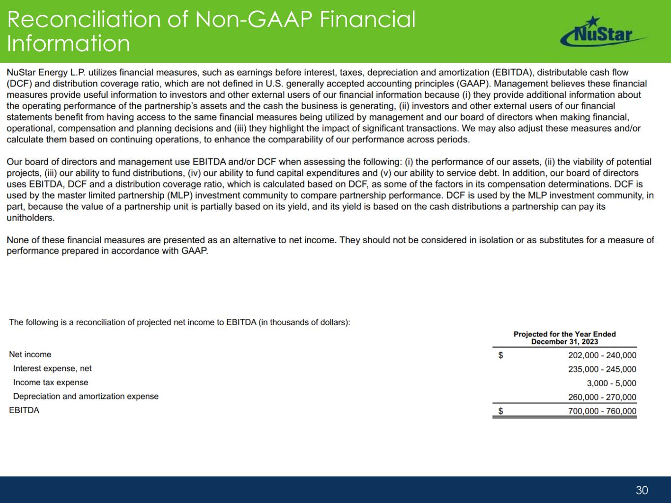 29 Capital Structure as of December 31, 2022 ($ in Millions) $1.0B Credit Facility $ 220 NuStar Logistics Notes (5.625%) 550 NuStar Logistics Notes (5.75%) 600 NuStar Logistics Notes (6.00%) 500 NuStar Logistics Notes (6.375%) 600 NuStar Logistics Sub Notes 403 GO Zone Bonds 322 Receivables Financing 81 Finance Lease Liability 55 Other (33) Total Debt $3,298 Common Equity and AOCI $ 146 Series A, B and C Preferred Units 756 Series D Preferred Units 447 Total Equity1 1,349 Total Capitalization $4,647 ★ As of December 31, 2022: • Credit facility availability ~$775MM • Debt-to-EBITDA ratio2 3.98x 1 - Total Equity includes Partners’ and Mezzanine Equity (Series D Preferred Units) 2 - Please see Appendix for reconciliations of non-GAAP financial measures to their most directly comparable GAAP measures