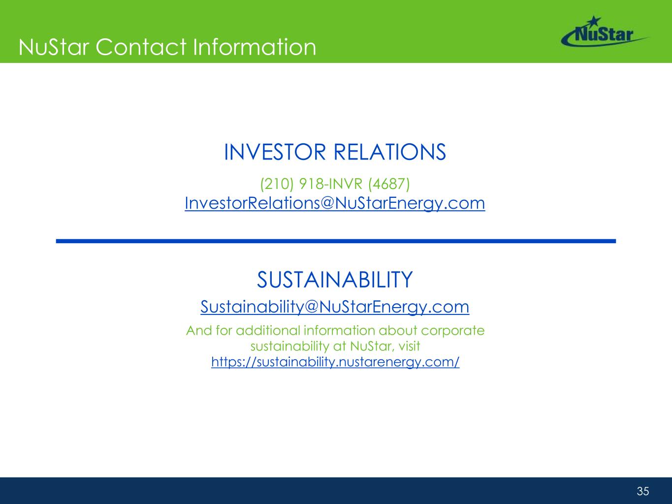 35 NuStar Contact Information INVESTOR RELATIONS And for additional information about corporate sustainability at NuStar, visit https://sustainability.nustarenergy.com/ SUSTAINABILITY (210) 918-INVR (4687) InvestorRelations@NuStarEnergy.com Sustainability@NuStarEnergy.com
