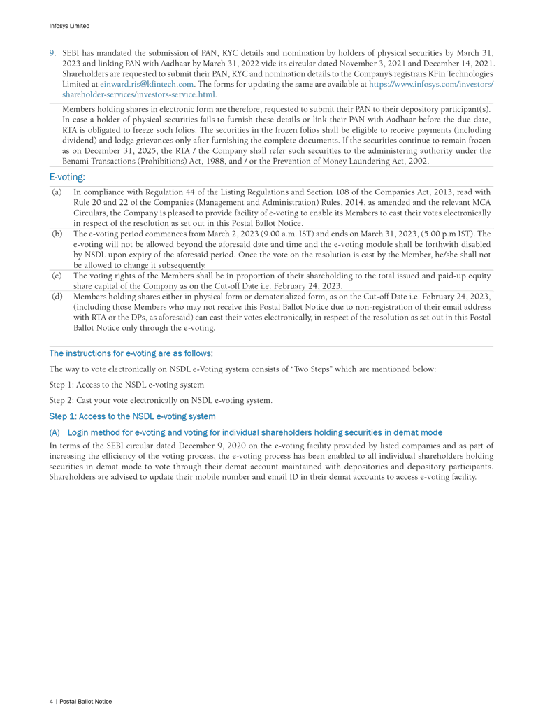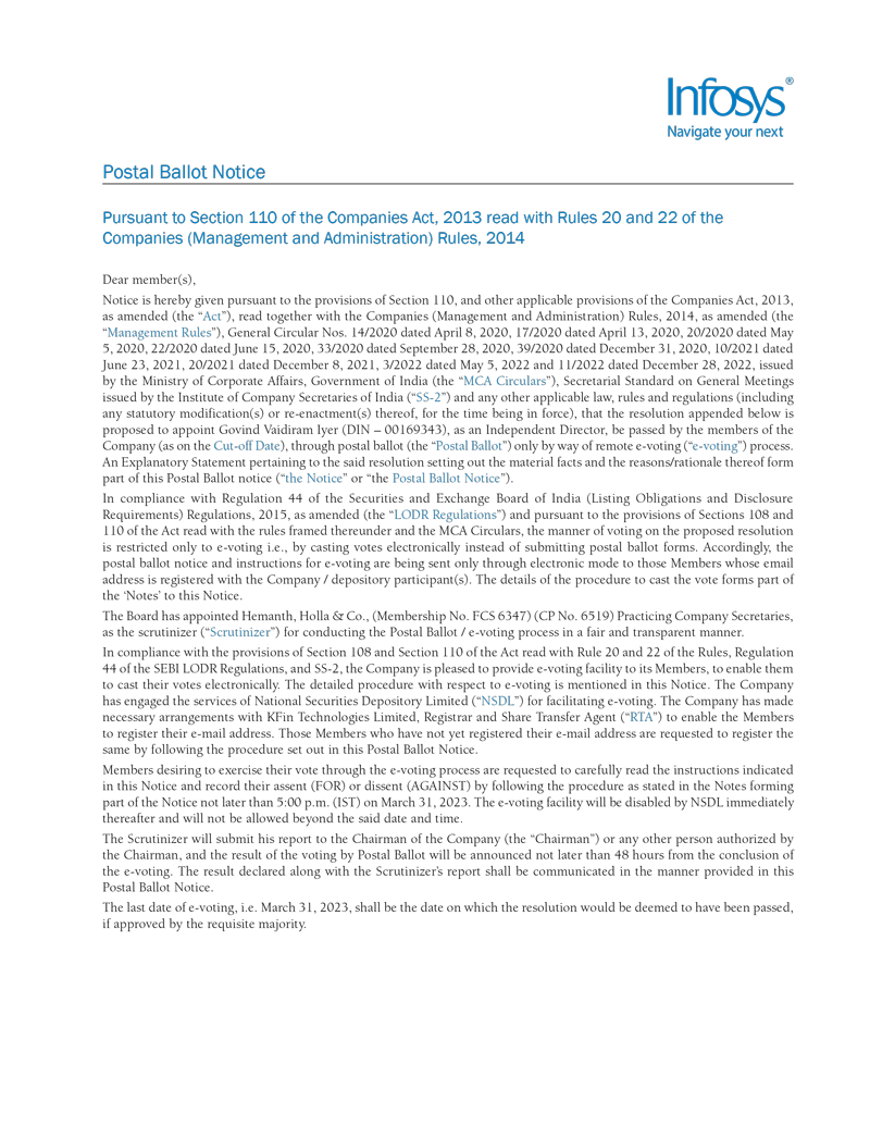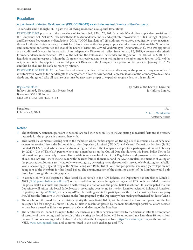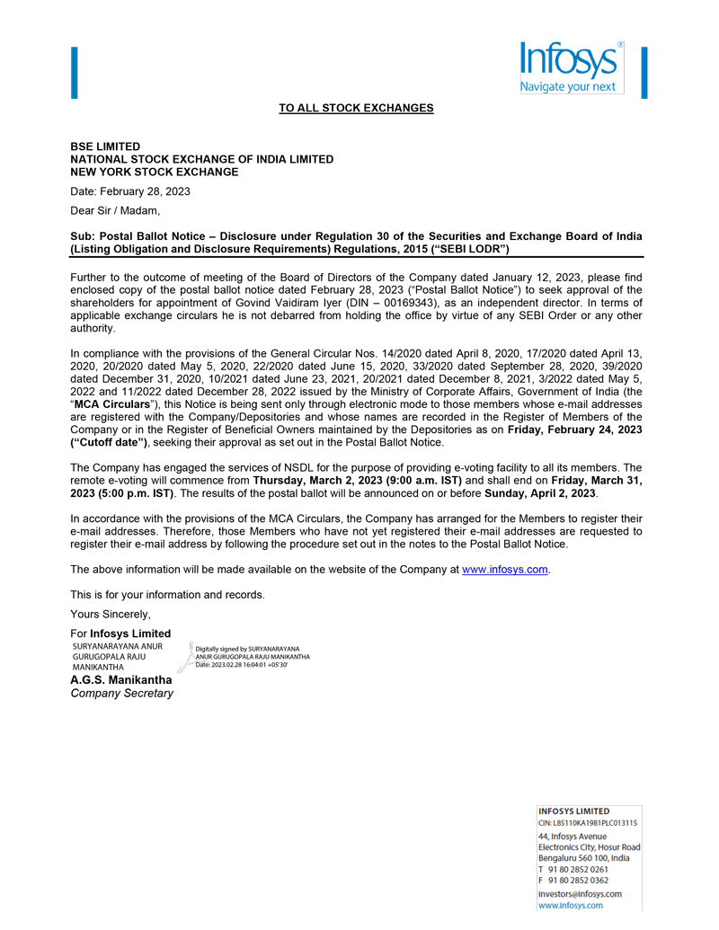 Infosys Limited, a company organized under the laws of the Republic of India ("Infosys", or the "Company"), hereby furnishes with the United States Securities and Exchange Commission this Report on Form 6-K regarding an intimation dated February 28, 2023 in relation to “postal ballot notice”.
