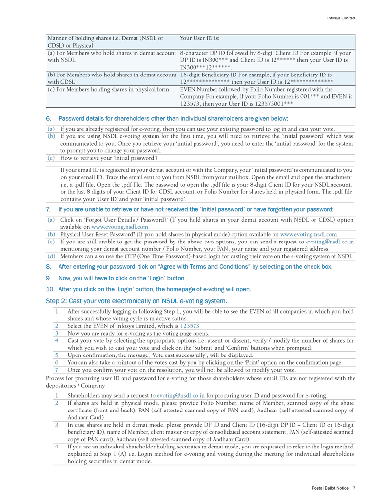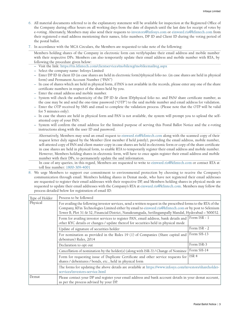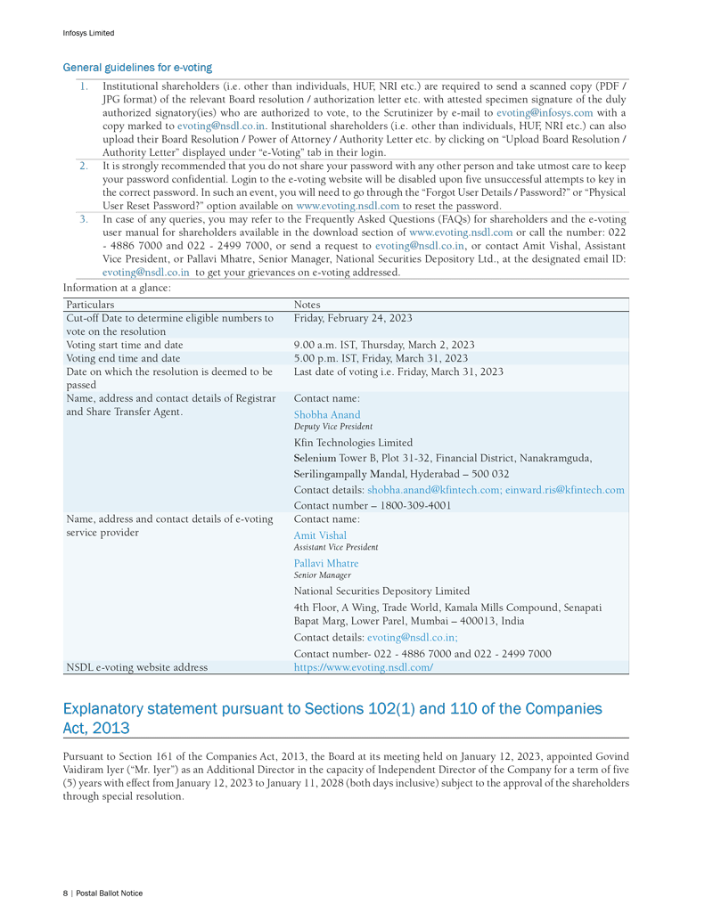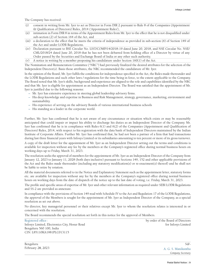 Infosys Limited, a company organized under the laws of the Republic of India ("Infosys", or the "Company"), hereby furnishes with the United States Securities and Exchange Commission this Report on Form 6-K regarding an intimation dated February 28, 2023 in relation to “postal ballot notice”.
