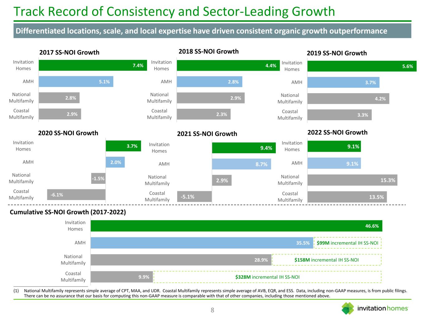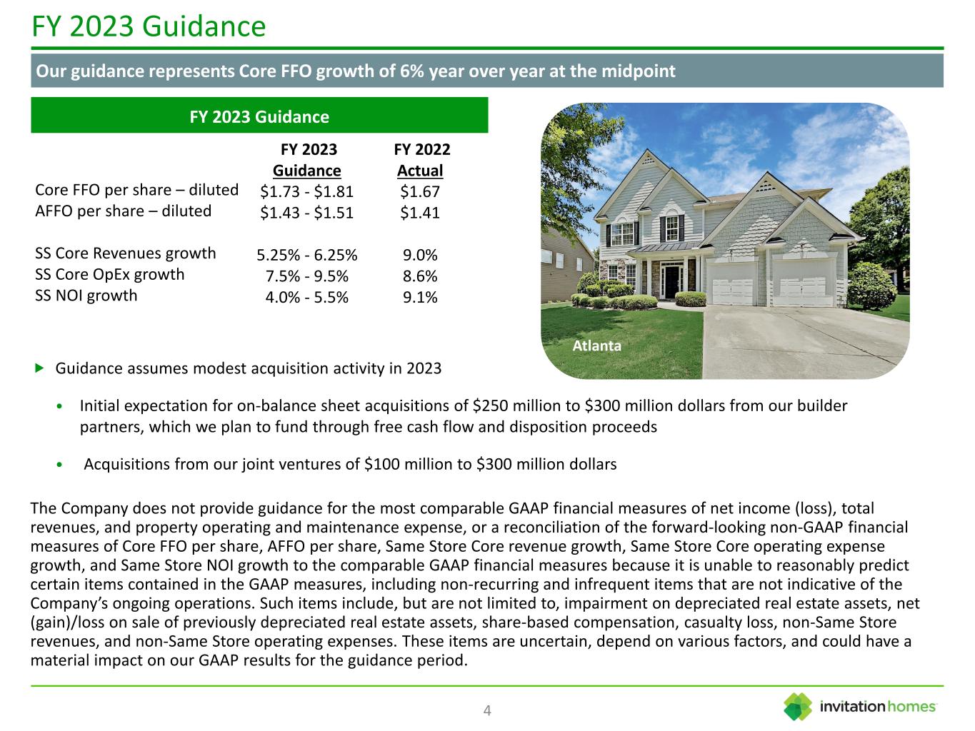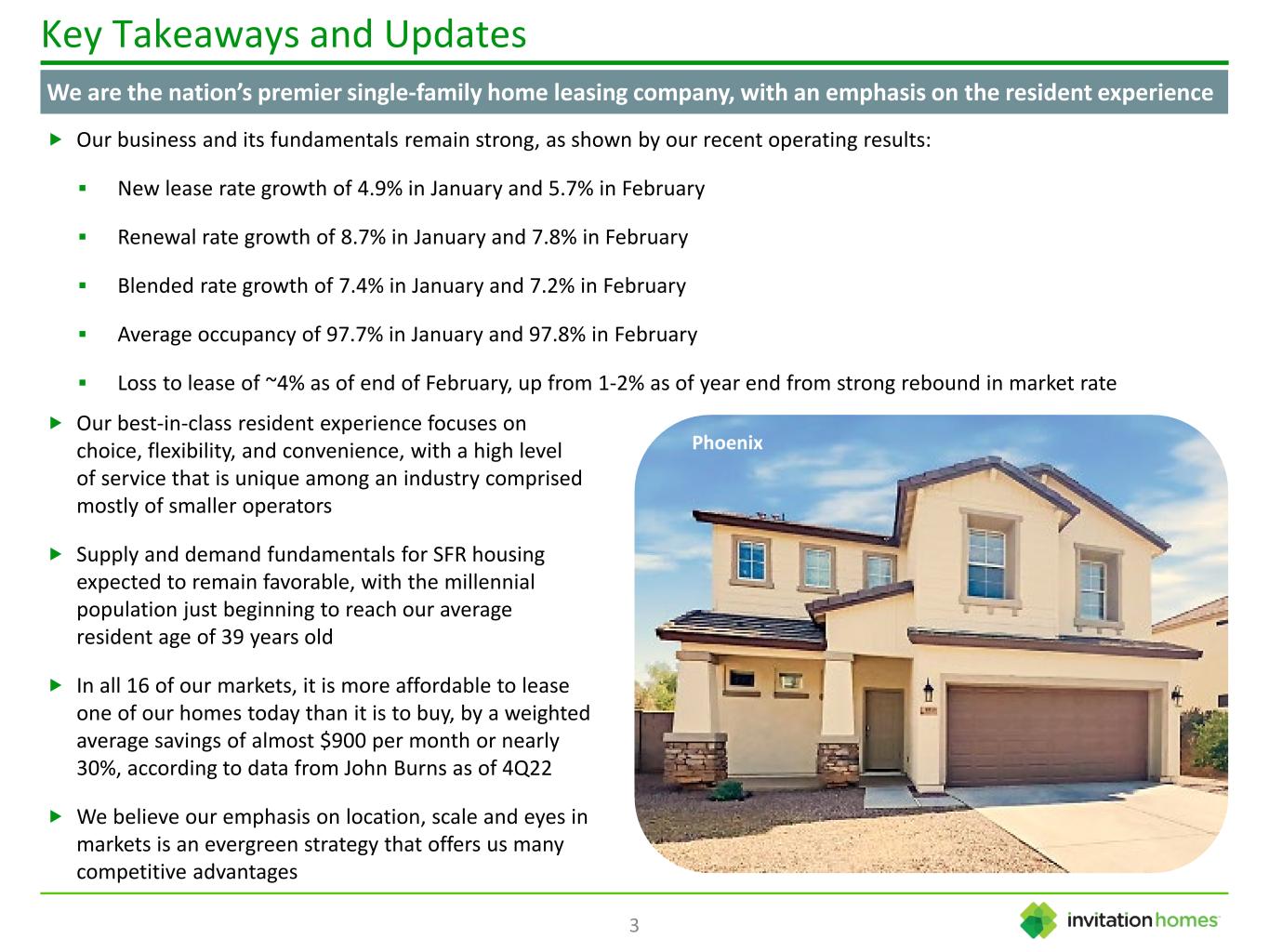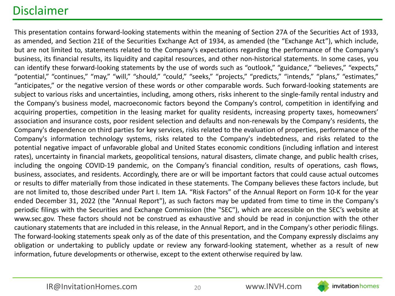 Disclaimer This presentation contains forward-looking statements within the meaning of Section 27A of the Securities Act of 1933, as amended, and Section 21E of the Securities Exchange Act of 1934, as amended (the “Exchange Act”), which include, but are not limited to, statements related to the Company's expectations regarding the performance of the Company's business, its financial results, its liquidity and capital resources, and other non-historical statements. In some cases, you can identify these forward-looking statements by the use of words such as “outlook,” “guidance,” “believes,” “expects,” “potential,” “continues,” “may,” “will,” “should,” “could,” “seeks,” “projects,” “predicts,” “intends,” “plans,” “estimates,” “anticipates,” or the negative version of these words or other comparable words. Such forward-looking statements are subject to various risks and uncertainties, including, among others, risks inherent to the single-family rental industry and the Company's business model, macroeconomic factors beyond the Company's control, competition in identifying and acquiring properties, competition in the leasing market for quality residents, increasing property taxes, homeowners’ association and insurance costs, poor resident selection and defaults and non-renewals by the Company's residents, the Company's dependence on third parties for key services, risks related to the evaluation of properties, performance of the Company's information technology systems, risks related to the Company's indebtedness, and risks related to the potential negative impact of unfavorable global and United States economic conditions (including inflation and interest rates), uncertainty in financial markets, geopolitical tensions, natural disasters, climate change, and public health crises, including the ongoing COVID-19 pandemic, on the Company’s financial condition, results of operations, cash flows, business, associates, and residents. Accordingly, there are or will be important factors that could cause actual outcomes or results to differ materially from those indicated in these statements. The Company believes these factors include, but are not limited to, those described under Part I. Item 1A. “Risk Factors” of the Annual Report on Form 10-K for the year ended December 31, 2022 (the "Annual Report"), as such factors may be updated from time to time in the Company's periodic filings with the Securities and Exchange Commission (the "SEC"), which are accessible on the SEC’s website at www.sec.gov. These factors should not be construed as exhaustive and should be read in conjunction with the other cautionary statements that are included in this release, in the Annual Report, and in the Company's other periodic filings. The forward-looking statements speak only as of the date of this presentation, and the Company expressly disclaims any obligation or undertaking to publicly update or review any forward-looking statement, whether as a result of new information, future developments or otherwise, except to the extent otherwise required by law. 20IR@InvitationHomes.com www.INVH.com
