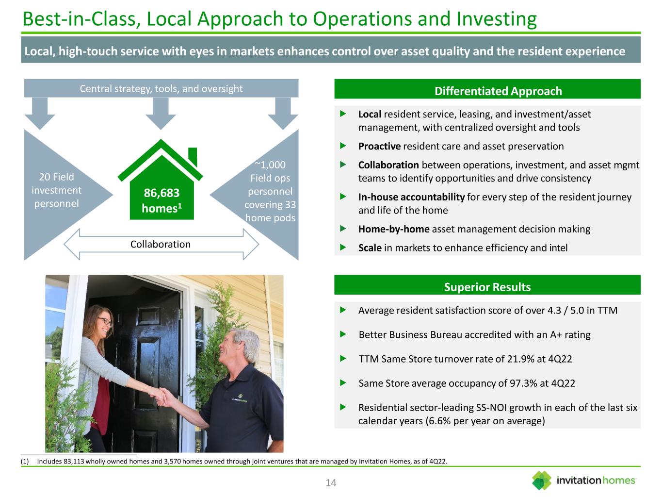 ATL 1 2,710 Homes ATL 2 2,731 Homes ATL 3 2,450 Homes ATL 4 2,567 Homes ATL 5 2,199 Homes Scale: Atlanta Example Our industry-leading scale enables us to operate efficiently with significant local presence in markets 12 Atlanta - 12,657 Homes (1) ________________________________________________ (1) In addition to the 12,657 wholly owned homes in Atlanta, there are 245 Atlanta homes owned by the 2020 Rockpoint JV, 15 Atlanta homes owned by the 2022 Rockpoint JV, and 167 Atlanta homes owned by the Pathway Homes JV that are managed by Invitation Homes; home counts as of 4Q22. • 1 Vice President of Operations • 2 Director of Operations • 2 Rehab/Turn/R&M Director • 5 Portfolio Directors • 10 Portfolio Mgmt. Personnel • 22 Leasing Personnel • 29 Customer Care Reps • 79 Maintenance Techs/RTM Personnel Atlanta