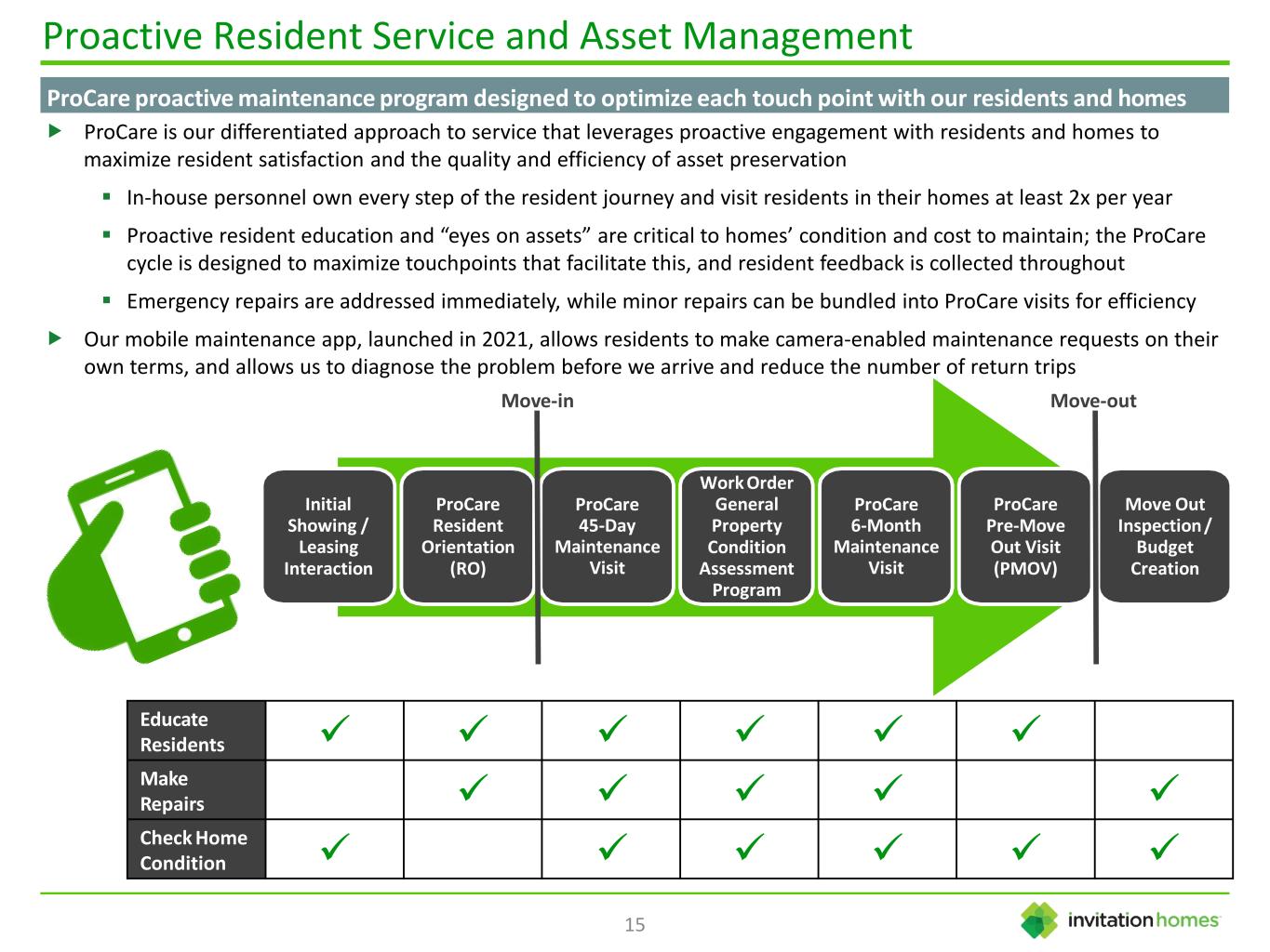 Proactive Resident Service and Asset Management ProCare proactive maintenance program designed to optimize each touch point with our residents and homes Initial Showing / Leasing Interaction ProCare Resident Orientation (RO) ProCare 45-Day Maintenance Visit Work Order General Property Condition Assessment Program ProCare 6-Month Maintenance Visit ProCare Pre-Move Out Visit (PMOV) Move Out Inspection / Budget Creation Move-in 15 Move-out Educate Residents Make Repairs Check Home Condition ProCare is our differentiated approach to service that leverages proactive engagement with residents and homes to maximize resident satisfaction and the quality and efficiency of asset preservation In-house personnel own every step of the resident journey and visit residents in their homes at least 2x per year Proactive resident education and “eyes on assets” are critical to homes’ condition and cost to maintain; the ProCare cycle is designed to maximize touchpoints that facilitate this, and resident feedback is collected throughout Emergency repairs are addressed immediately, while minor repairs can be bundled into ProCare visits for efficiency Our mobile maintenance app, launched in 2021, allows residents to make camera-enabled maintenance requests on their own terms, and allows us to diagnose the problem before we arrive and reduce the number of return trips