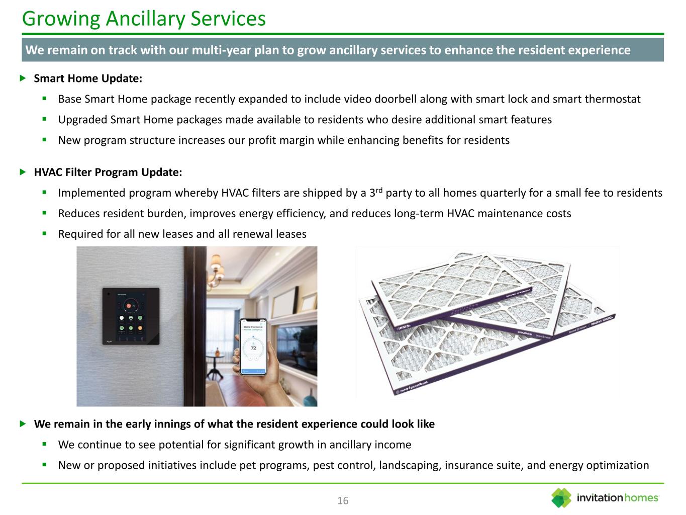 Growing Ancillary Services We remain on track with our multi-year plan to grow ancillary services to enhance the resident experience 16 Smart Home Update: Base Smart Home package recently expanded to include video doorbell along with smart lock and smart thermostat Upgraded Smart Home packages made available to residents who desire additional smart features New program structure increases our profit margin while enhancing benefits for residents HVAC Filter Program Update: Implemented program whereby HVAC filters are shipped by a 3rd party to all homes quarterly for a small fee to residents Reduces resident burden, improves energy efficiency, and reduces long-term HVAC maintenance costs Required for all new leases and all renewal leases We remain in the early innings of what the resident experience could look like We continue to see potential for significant growth in ancillary income New or proposed initiatives include pet programs, pest control, landscaping, insurance suite, and energy optimization