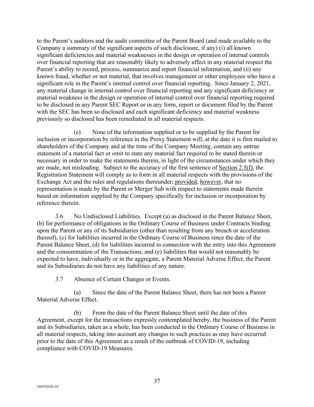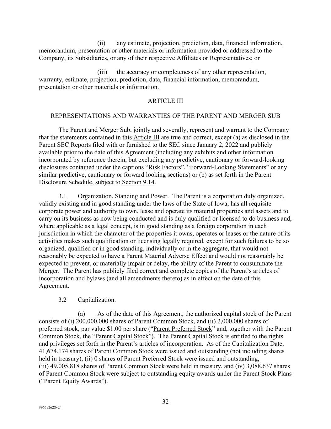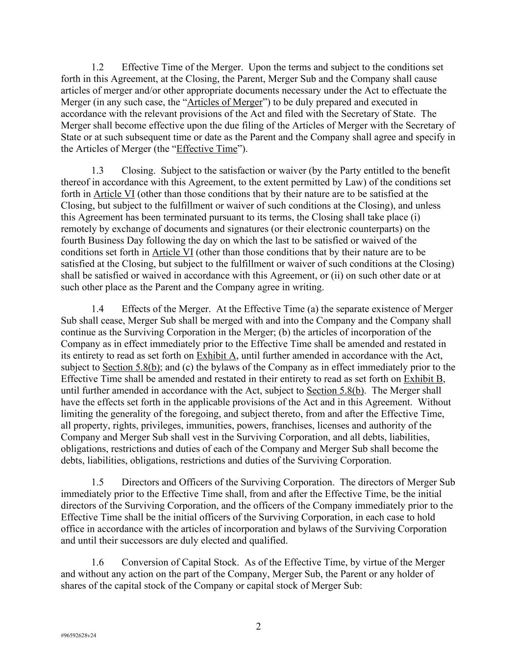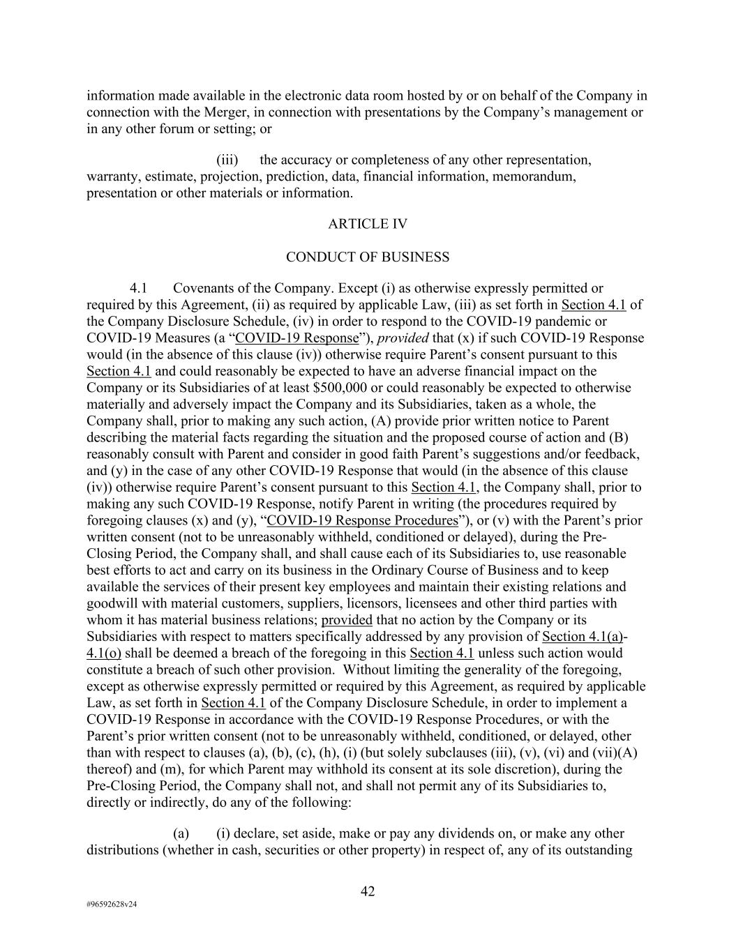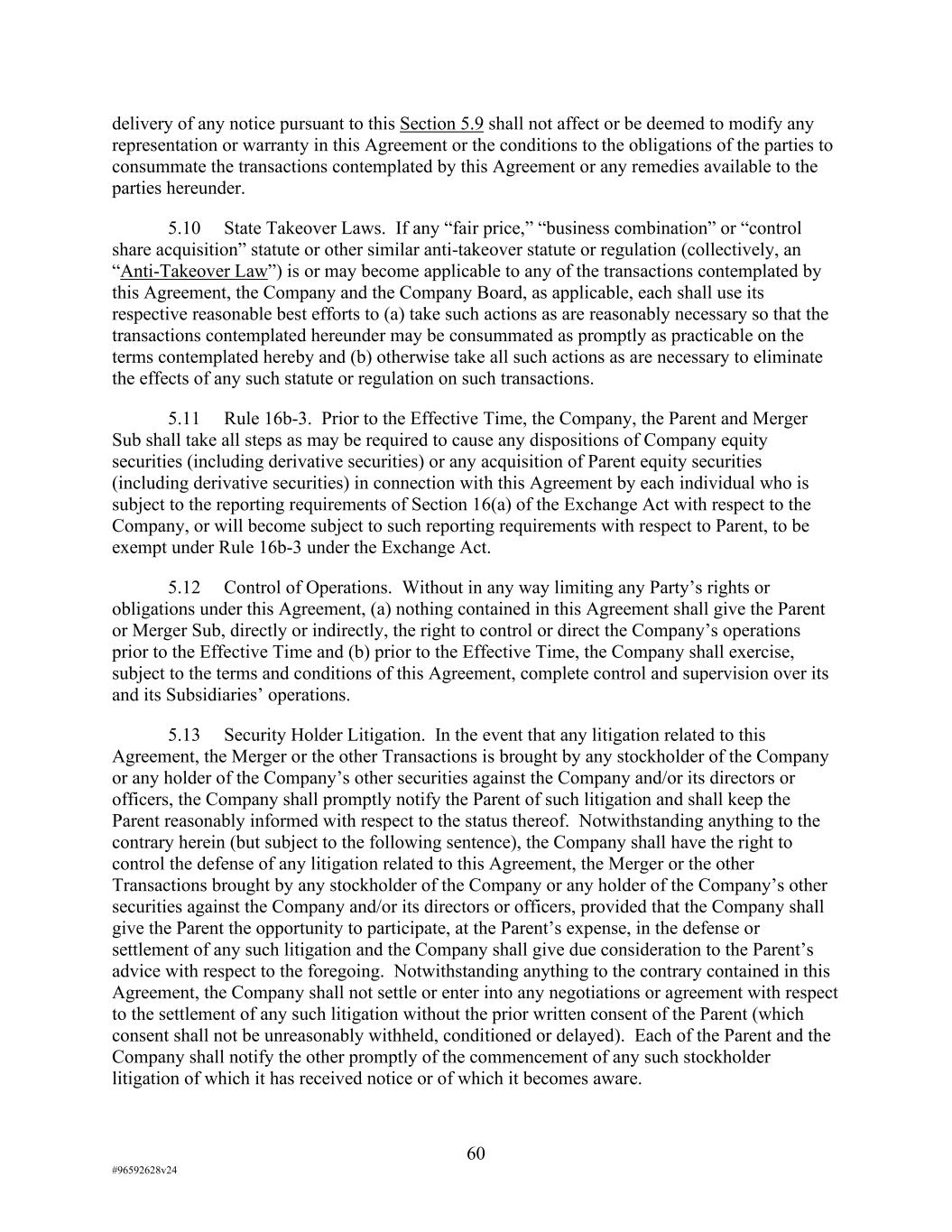The foregoing description of the Merger Agreement and the transactions contemplated thereby in this Current Report on Form 8-K is only a summary and does not purport to be complete and is qualified in its entirety by reference to the full text of the Merger Agreement, a copy of which is filed as Exhibit 2.1 hereof and incorporated by reference herein. Such description is not intended to provide any other factual information about the parties to the Merger Agreement or their respective subsidiaries and affiliates. The Merger Agreement contains representations and warranties by each of the parties to Merger Agreement, which were made only for purposes of that agreement and as of specified dates. The representations, warranties and covenants in the Merger Agreement were made solely for the benefit of the parties to the applicable agreement, are subject to limitations agreed upon by the contracting parties, including being qualified by confidential disclosures made for the purposes of allocating contractual risk between the parties to the Merger Agreement instead of establishing these matters as facts, as well as by information contained in each party’s periodic reports filed with the SEC, and may be subject to standards of materiality applicable to the contracting parties that may differ from those applicable to investors. Investors should not rely on the representations, warranties and covenants or any descriptions thereof as characterizations of the actual state of facts or condition of such parties or any of their respective subsidiaries or affiliates. Moreover, information concerning the subject matter of the representations, warranties and covenants may change after the date of the Merger Agreement, which subsequent information may or may not be fully reflected in the parties’ public disclosures.