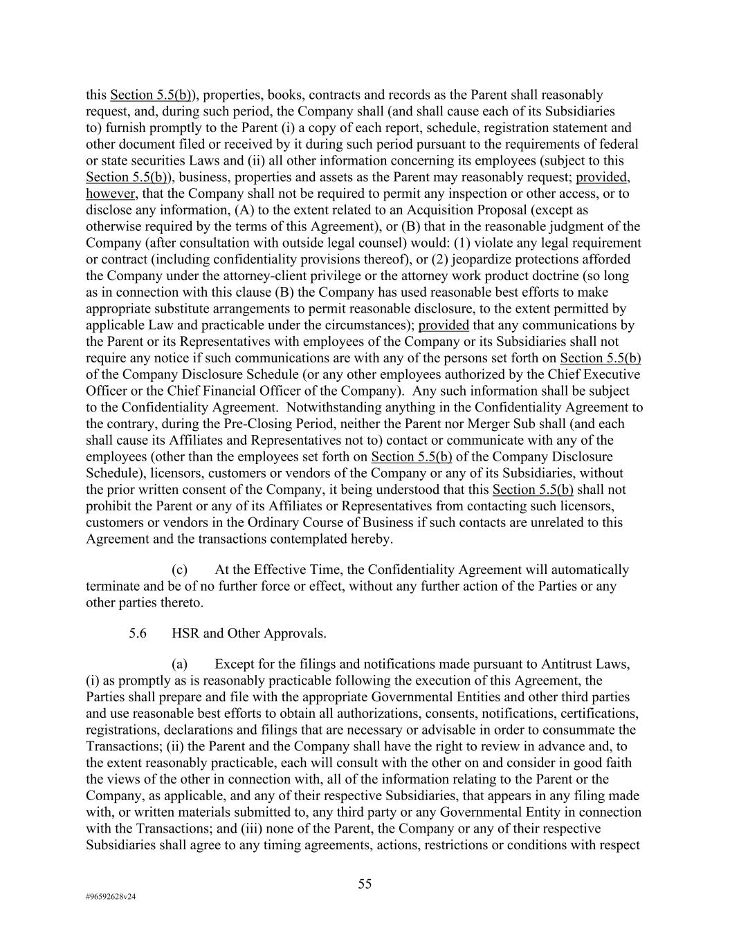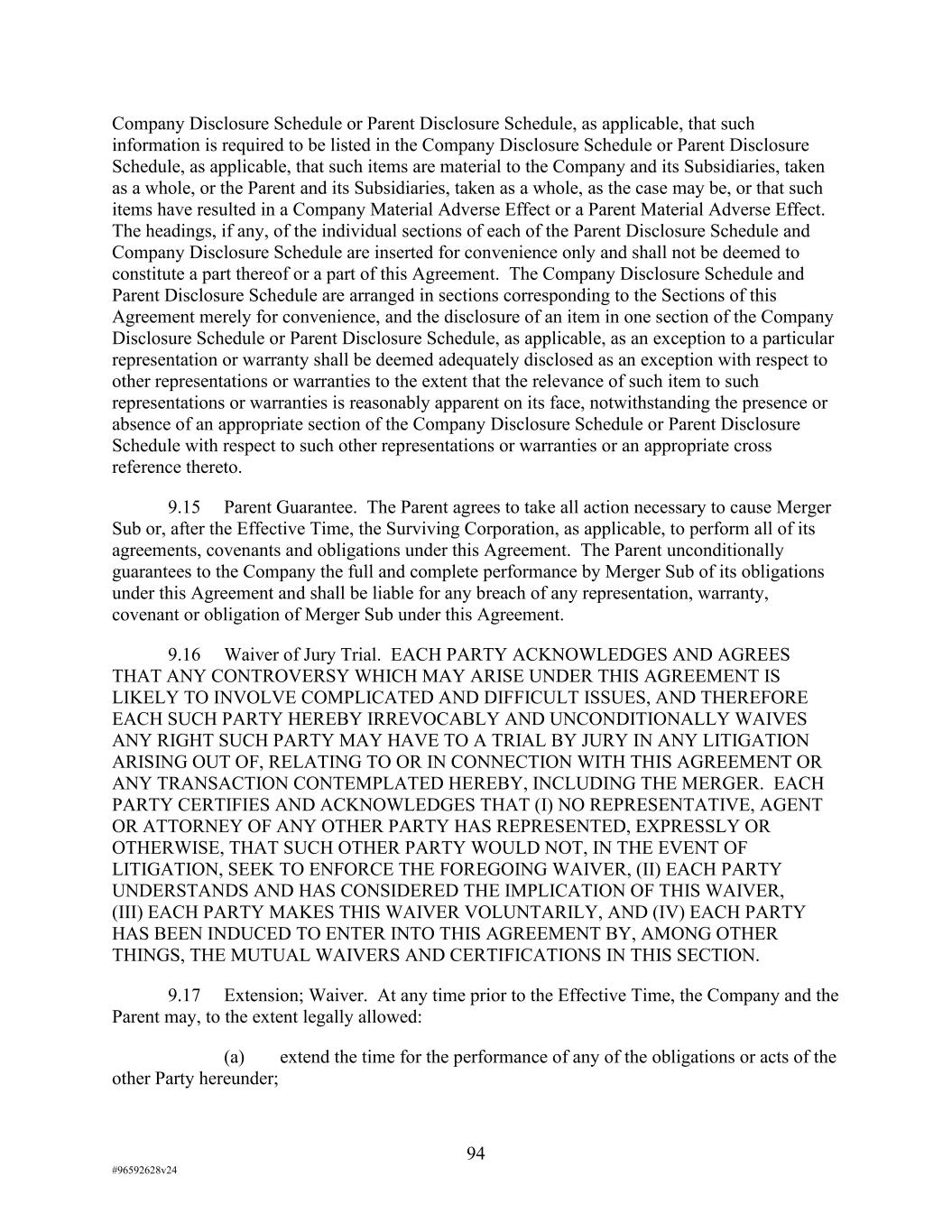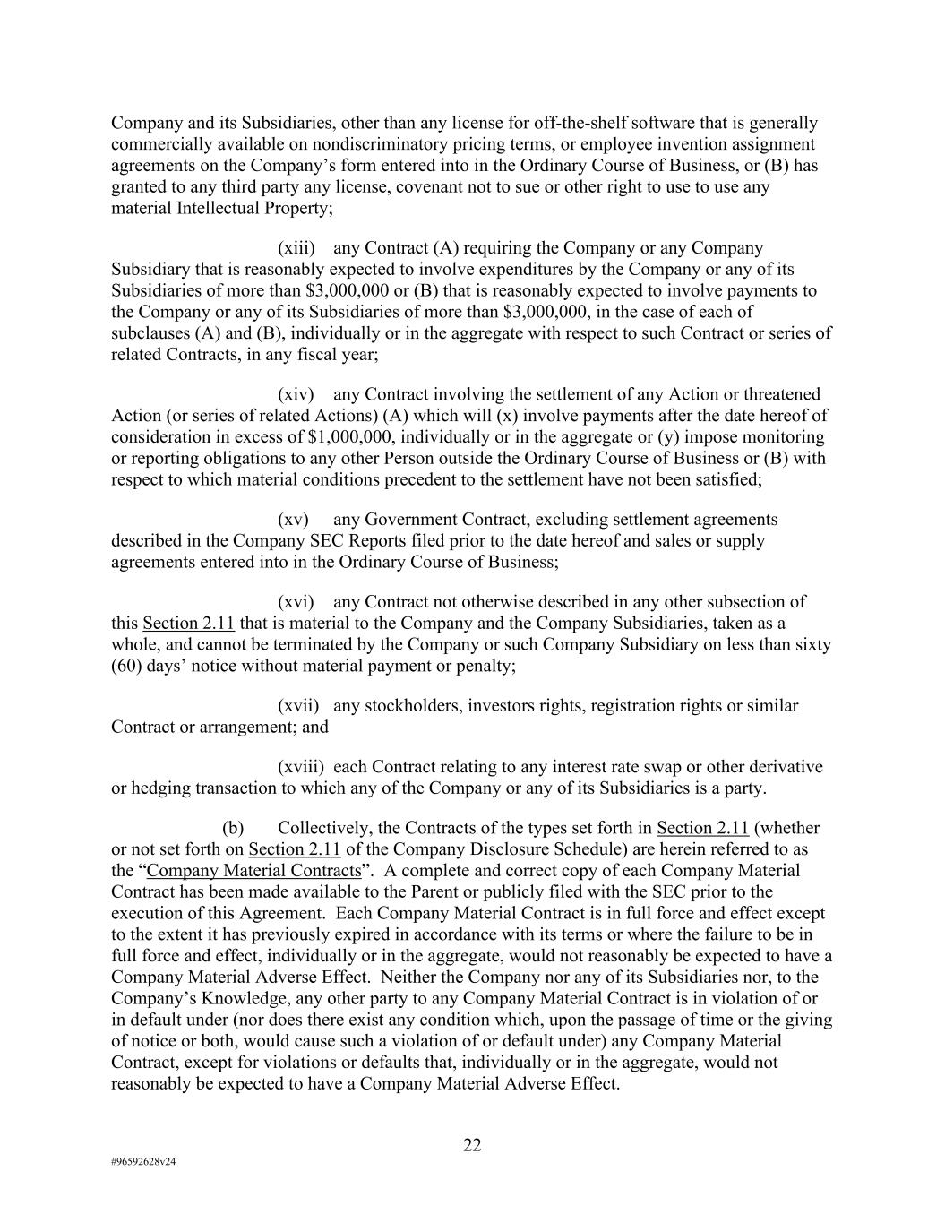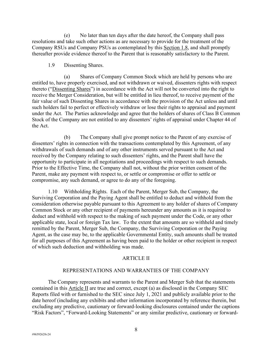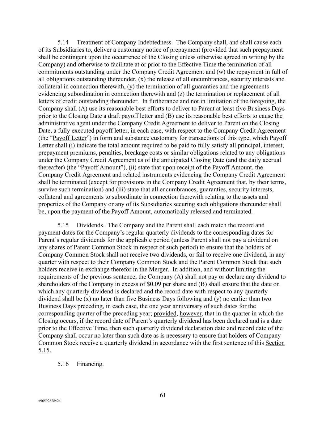 The foregoing description of the Merger Agreement and the transactions contemplated thereby in this Current Report on Form 8-K is only a summary and does not purport to be complete and is qualified in its entirety by reference to the full text of the Merger Agreement, a copy of which is filed as Exhibit 2.1 hereof and incorporated by reference herein. Such description is not intended to provide any other factual information about the parties to the Merger Agreement or their respective subsidiaries and affiliates. The Merger Agreement contains representations and warranties by each of the parties to Merger Agreement, which were made only for purposes of that agreement and as of specified dates. The representations, warranties and covenants in the Merger Agreement were made solely for the benefit of the parties to the applicable agreement, are subject to limitations agreed upon by the contracting parties, including being qualified by confidential disclosures made for the purposes of allocating contractual risk between the parties to the Merger Agreement instead of establishing these matters as facts, as well as by information contained in each party’s periodic reports filed with the SEC, and may be subject to standards of materiality applicable to the contracting parties that may differ from those applicable to investors. Investors should not rely on the representations, warranties and covenants or any descriptions thereof as characterizations of the actual state of facts or condition of such parties or any of their respective subsidiaries or affiliates. Moreover, information concerning the subject matter of the representations, warranties and covenants may change after the date of the Merger Agreement, which subsequent information may or may not be fully reflected in the parties’ public disclosures.