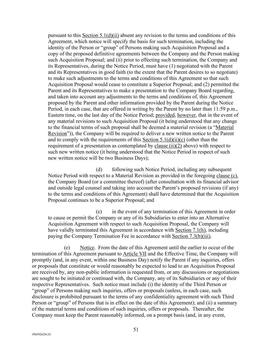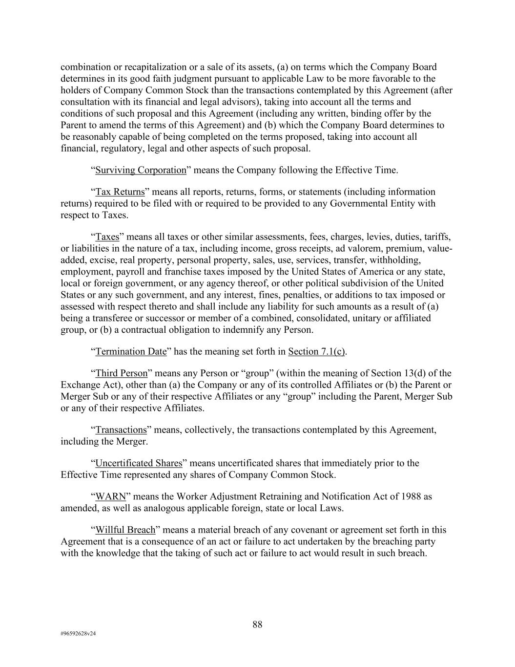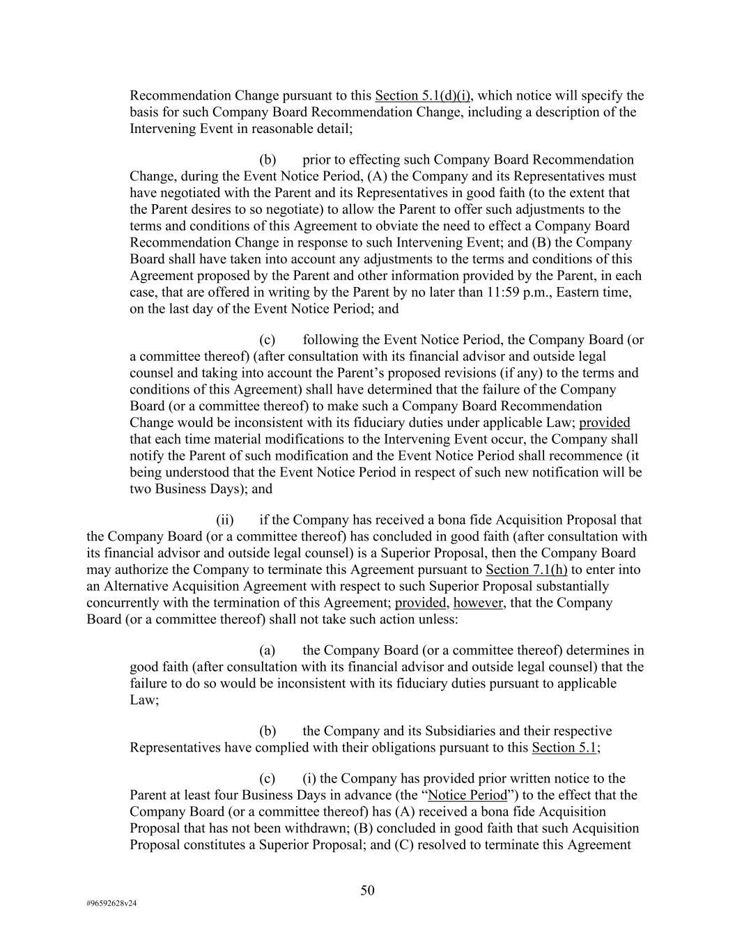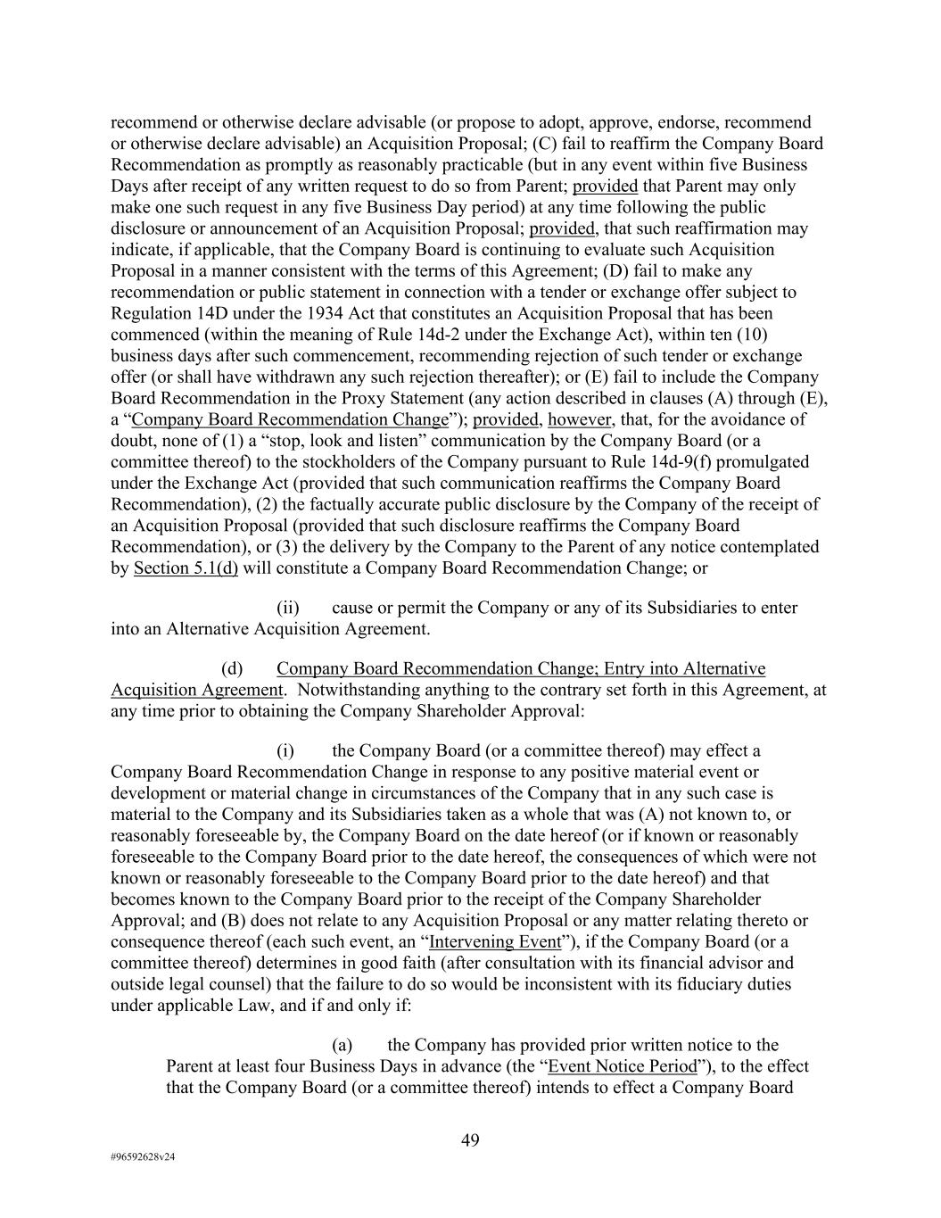 transactions contemplated under the Merger Agreement in connection with certain intervening events, or terminate the Merger Agreement in order to enter into an agreement providing for a Superior Proposal (as defined in the Merger Agreement), subject to the requirements and limitations set forth in the Merger Agreement.