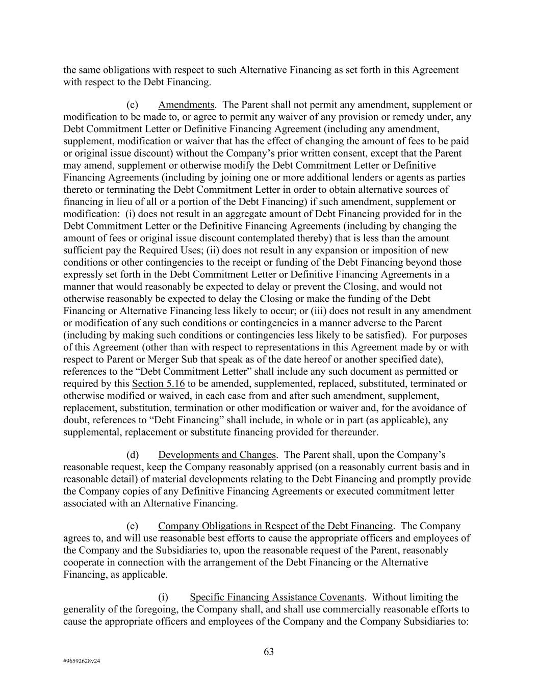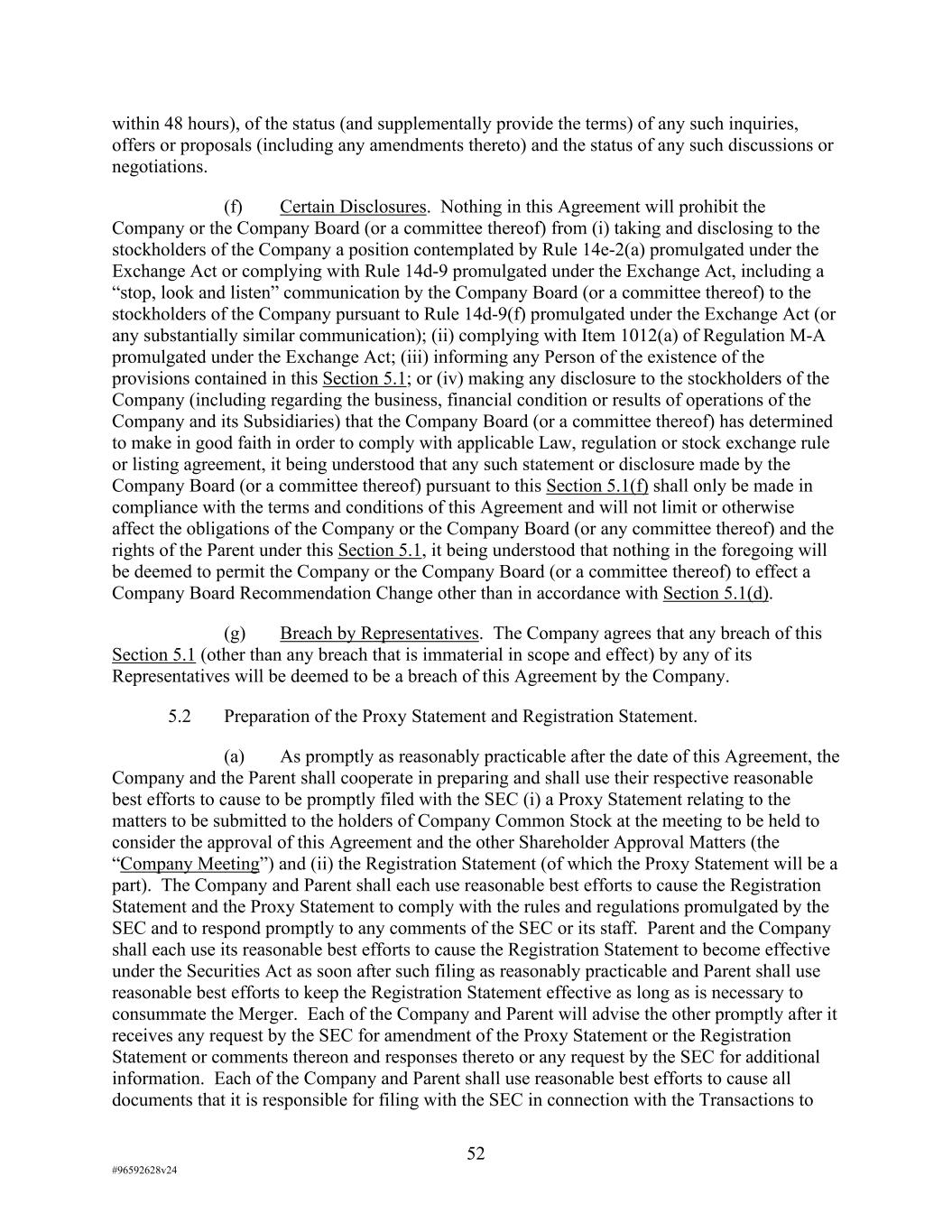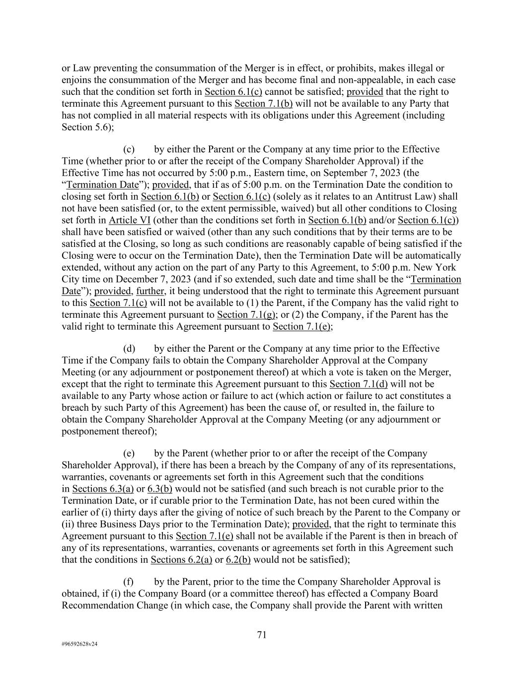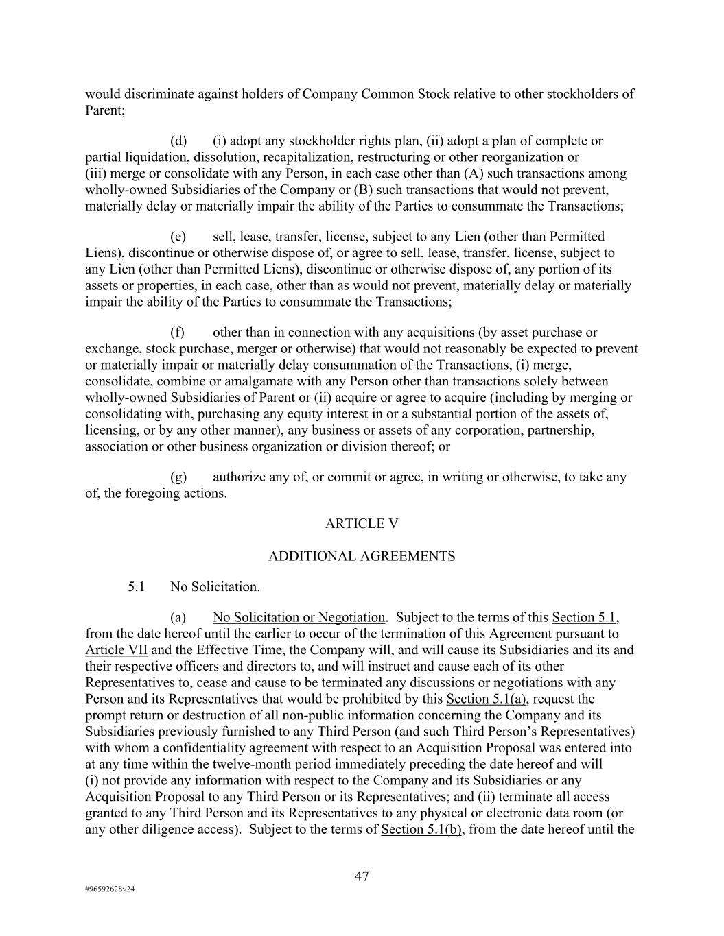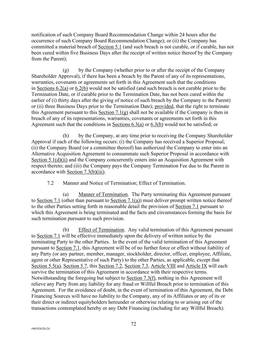 transactions contemplated under the Merger Agreement in connection with certain intervening events, or terminate the Merger Agreement in order to enter into an agreement providing for a Superior Proposal (as defined in the Merger Agreement), subject to the requirements and limitations set forth in the Merger Agreement.
