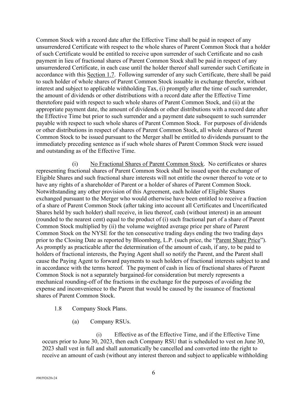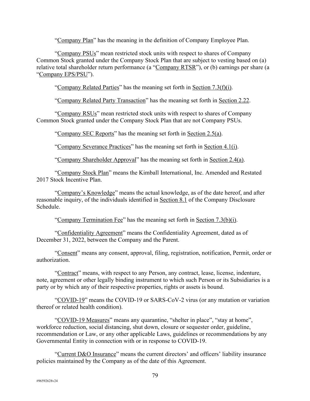 The Merger Agreement provides that outstanding Kimball equity awards will be treated as follows at the Effective Time: (a) each outstanding award of Kimball restricted stock units that is not subject to performance vesting conditions will cease to represent an award with respect to Kimball Common Stock and thereafter constitute a restricted stock unit award, on the same terms and conditions (including vesting and forfeiture, but subject to accelerated vesting upon termination of employment without cause), with respect to a number of shares of Company Common Stock, determined by multiplying (i) each share of Kimball Common Stock subject to such Kimball restricted stock unit award by (ii) the sum of (A) 0.1301 (the “Exchange Ratio”) and (B) the quotient of the sum of the Cash Consideration plus the dividend equivalents accrued thereon, divided by the volume weighted average price per share of Company Common Stock on the New York Stock Exchange for the ten consecutive trading days ending the two trading days prior to the closing of the Merger as reported by Bloomberg, L.P. (such price, the “Parent Share Price”); and (b) with respect to each outstanding award of Kimball restricted stock units subject to performance-based vesting, (i) if such vesting is based on relative total shareholder return, the award will vest at a pro rata portion of the target amount based on the portion of the performance cycle then completed, and (ii) if such vesting is based on earnings per share, the award will vest at the target amount, and, in each such case of performance-based vesting restricted stock units, the full award will automatically be cancelled and converted into the right to receive from the Company (shortly following the Effective Time), in respect of each share of Kimball Common Stock subject to the vested portion of such cancelled award, an amount of cash (without any interest thereon and subject to applicable withholding taxes), equal to the sum of (i) the Cash Consideration, plus (ii) the Parent Share Price multiplied by the Exchange Ratio. However, if the Effective Time occurs prior to June 30, 2023, the tranche of each award of Kimball restricted stock units that is not subject to performance vesting conditions and that is scheduled to vest on June 30, 2023 will, at the Effective Time, vest and be cancelled and converted into the right to receive from the Company (shortly following the Effective Time), in respect of each share of Kimball Common Stock subject to such vesting tranche, an amount of cash (without any interest thereon and subject to applicable withholding taxes) equal to the sum of (A) the Cash Consideration plus the dividend equivalents that have accrued thereon, and (B) the Parent Share Price multiplied by the Exchange Ratio.