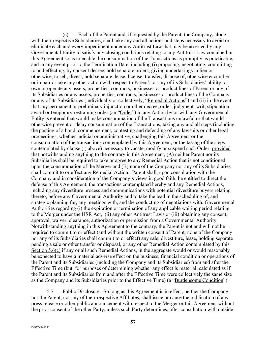 The Company and, if requested by the Company, Kimball, each also agreed to take any and all actions and steps necessary to avoid or eliminate each impediment under any antitrust law that may be asserted by any governmental entity to satisfy any closing conditions relating to any antitrust law contained in the Merger Agreement so as to enable the consummation of the Merger and other transactions contemplated by the Merger Agreement as promptly as practicable prior the End Date (as defined below). However, the Company will not be required to commit to or effect any action that, individually or in the aggregate, would or would reasonably be expected to have a material adverse effect on the business, financial condition or operations of the Company and its subsidiaries (including Kimball and its subsidiaries) from and after the Effective Time (calculated as if the Company and its subsidiaries from and after the Effective Time were collectively the same size as Kimball and its subsidiaries prior to the Effective Time) (a “Burdensome Condition”).