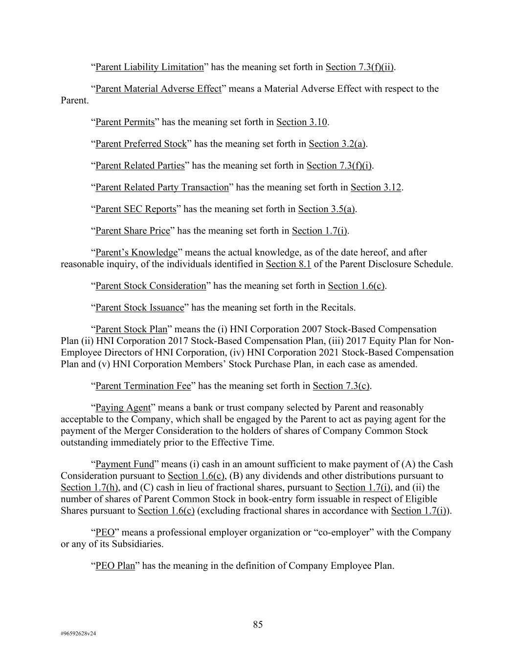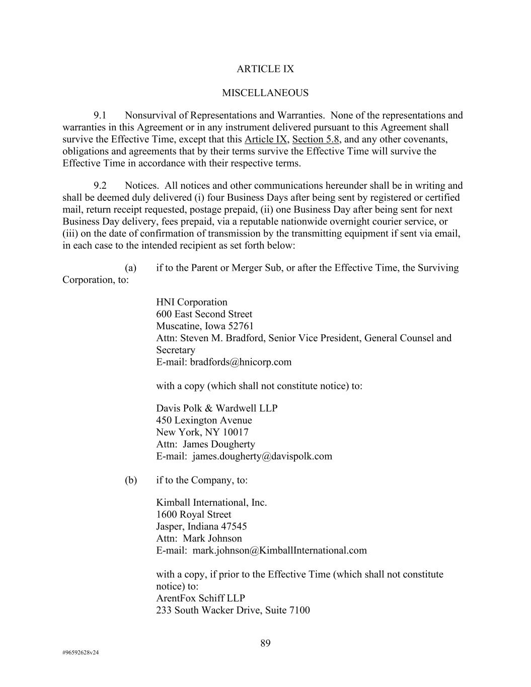 These forward-looking statements are subject to risks and uncertainties that may cause actual results to differ materially from those projected. In addition to factors previously disclosed in HNI’s and Kimball’s reports filed with the U.S. Securities and Exchange Commission (the “SEC”) and those identified elsewhere in this document, the following factors, among others, could cause actual results to differ materially from forward-looking statements or historical performance: the occurrence of any event, change, or other circumstance that could give rise to the right of one or both of the parties to terminate the definitive merger agreement between HNI and Kimball; the outcome of any legal proceedings that may be instituted against HNI or Kimball; the possibility that the Transaction does not close when expected or at all because required regulatory, shareholder, or other approvals and other conditions to closing are not received or satisfied on a timely basis or at all (and the risk that such approvals may result in the imposition of conditions that could adversely affect the combined company or the expected benefits of the Transaction); the risk that the benefits from the Transaction may not be fully realized or may take longer to realize than expected, including as a result of changes in, or problems arising from, general economic and market conditions, interest and exchange rates, monetary policy, laws and regulations and their enforcement, and the degree of competition in the geographic and business areas in which HNI and Kimball operate; the ability to promptly and effectively integrate the businesses of HNI and Kimball; the possibility that the Transaction may be more expensive to complete than anticipated, including as a result of unexpected factors or events; reputational risk and potential adverse reactions of HNI’s or Kimball’s customers, employees or other business partners, including those resulting from the announcement or completion of the Transaction; the dilution caused by HNI’s issuance of additional shares of its capital stock in connection with the Transaction; the diversion of management’s attention and time from ongoing business operations and opportunities on merger-related matters; and the impact of the global COVID-19 pandemic on HNI’s or Kimball’s businesses, the ability to complete the Transaction or any of the other foregoing risks.