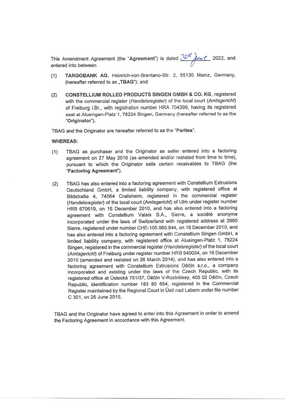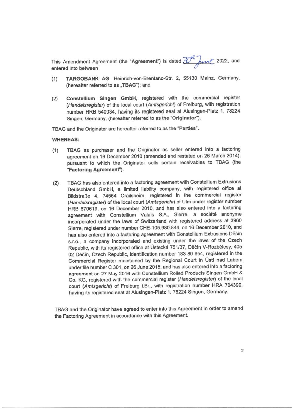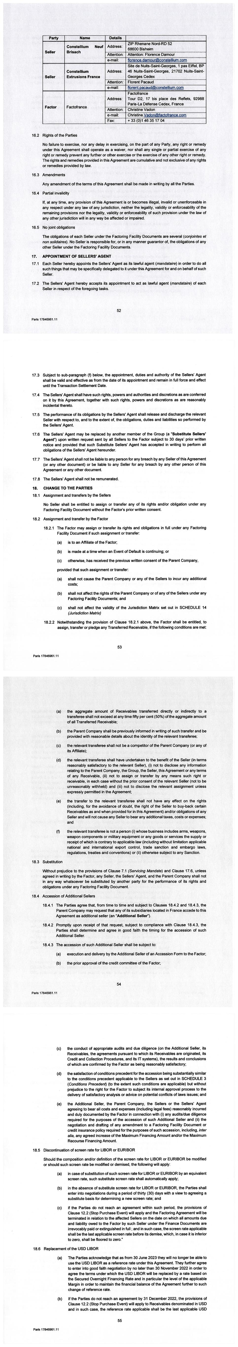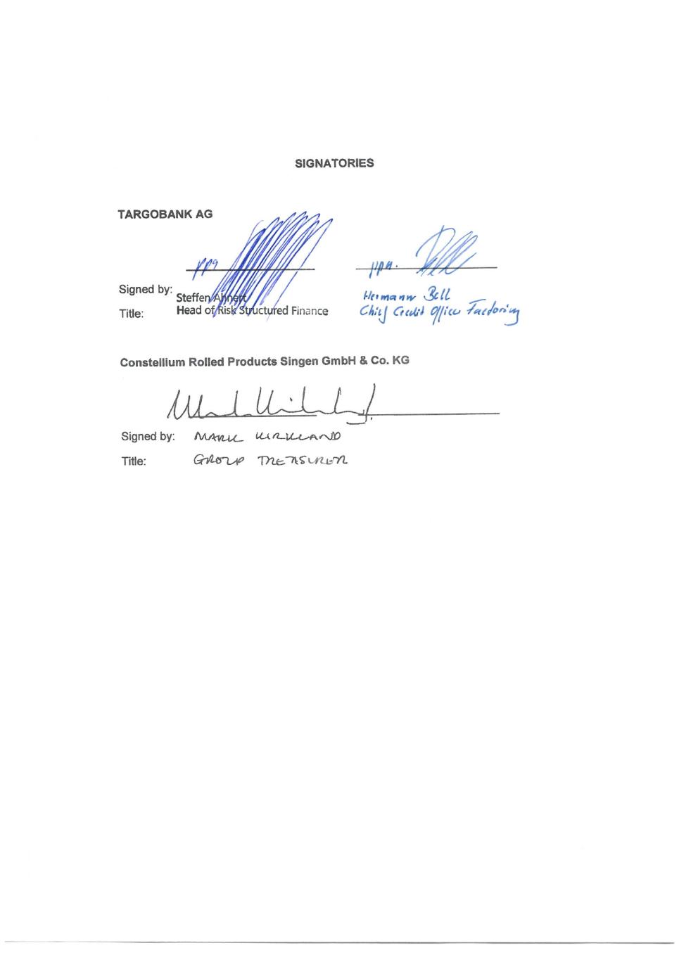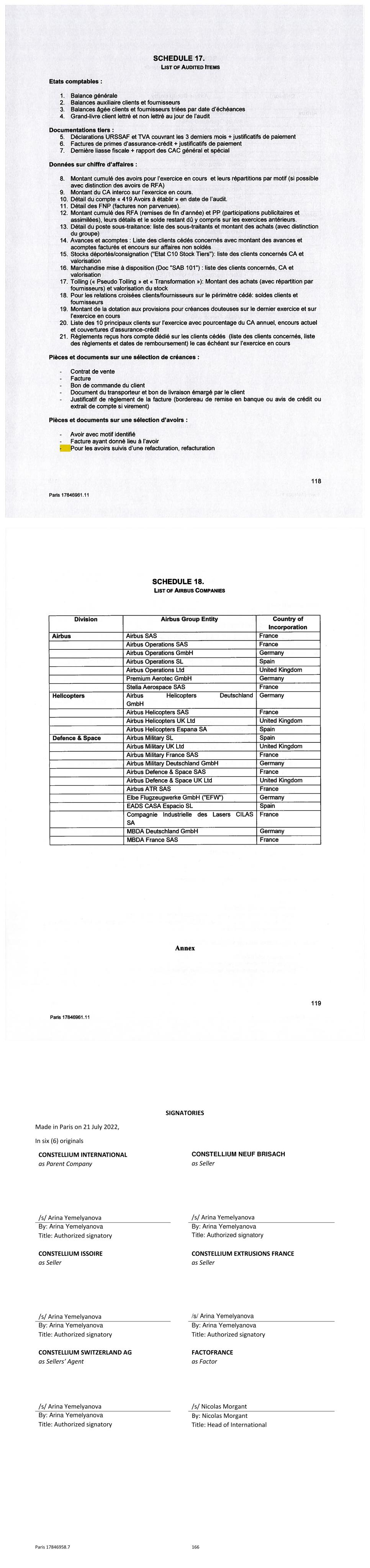 Paris 17846958.7 166 SIGNATORIES Made in Paris on 21 July 2022, In six (6) originals CONSTELLIUM INTERNATIONAL as Parent Company /s/ Arina Yemelyanova CONSTELLIUM NEUF BRISACH as Seller /s/ Arina Yemelyanova By: Arina Yemelyanova Title: Authorized signatory By: Arina Yemelyanova Title: Authorized signatory CONSTELLIUM ISSOIRE as Seller /s/ Arina Yemelyanova CONSTELLIUM EXTRUSIONS FRANCE as Seller /s/ Arina Yemelyanova By: Arina Yemelyanova Title: Authorized signatory By: Arina Yemelyanova Title: Authorized signatory CONSTELLIUM SWITZERLAND AG as Sellers’ Agent /s/ Arina Yemelyanova FACTOFRANCE as Factor /s/ Nicolas Morgant By: Arina Yemelyanova Title: Authorized signatory By: Nicolas Morgant Title: Head of International