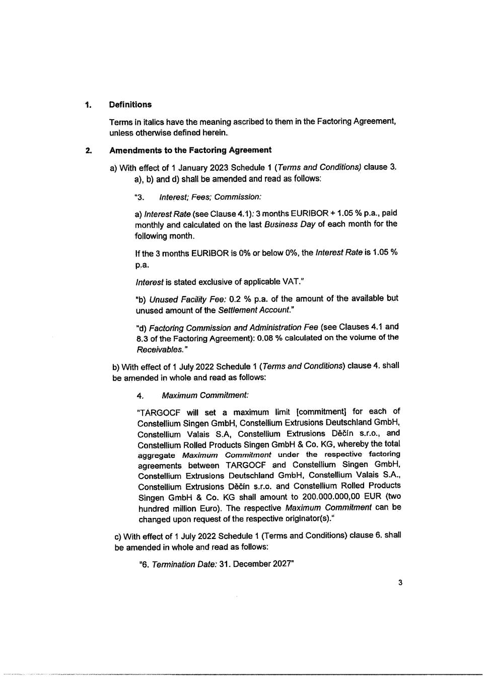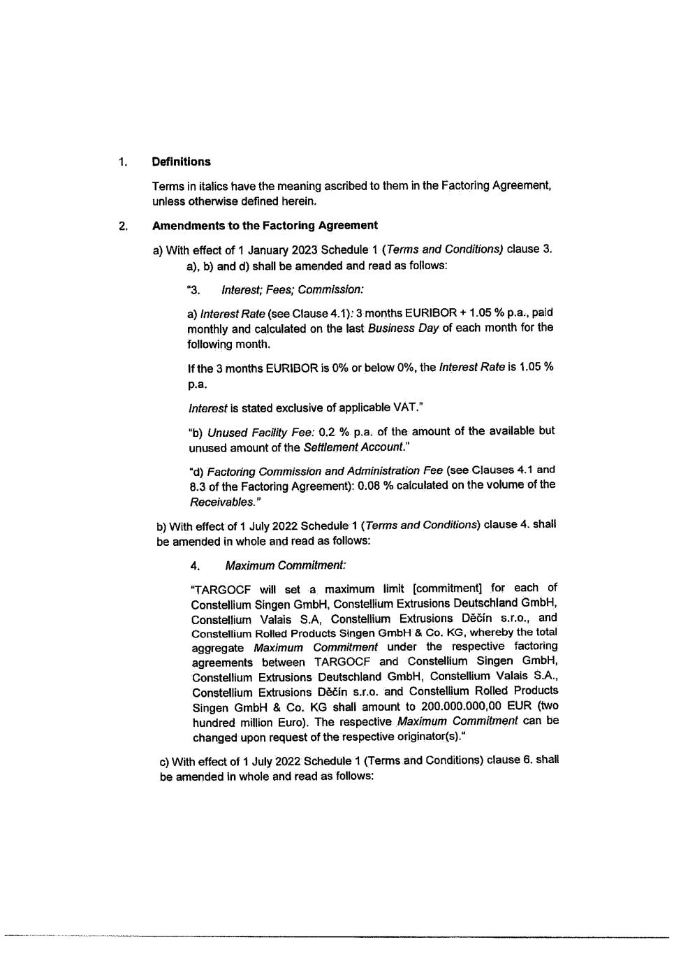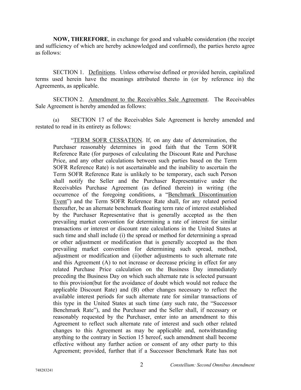 2 Constellium: Second Omnibus Amendment 748283241 NOW, THEREFORE, in exchange for good and valuable consideration (the receipt and sufficiency of which are hereby acknowledged and confirmed), the parties hereto agree as follows: SECTION 1. Definitions. Unless otherwise defined or provided herein, capitalized terms used herein have the meanings attributed thereto in (or by reference in) the Agreements, as applicable. SECTION 2. Amendment to the Receivables Sale Agreement. The Receivables Sale Agreement is hereby amended as follows: (a) SECTION 17 of the Receivables Sale Agreement is hereby amended and restated to read in its entirety as follows: “TERM SOFR CESSATION. If, on any date of determination, the Purchaser reasonably determines in good faith that the Term SOFR Reference Rate (for purposes of calculating the Discount Rate and Purchase Price, and any other calculations between such parties based on the Term SOFR Reference Rate) is not ascertainable and the inability to ascertain the Term SOFR Reference Rate is unlikely to be temporary, each such Person shall notify the Seller and the Purchaser Representative under the Receivables Purchase Agreement (as defined therein) in writing (the occurrence of the foregoing conditions, a “Benchmark Discontinuation Event”) and the Term SOFR Reference Rate shall, for any related period thereafter, be an alternate benchmark floating term rate of interest established by the Purchaser Representative that is generally accepted as the then prevailing market convention for determining a rate of interest for similar transactions or interest or discount rate calculations in the United States at such time and shall include (i) the spread or method for determining a spread or other adjustment or modification that is generally accepted as the then prevailing market convention for determining such spread, method, adjustment or modification and (ii)other adjustments to such alternate rate and this Agreement (A) to not increase or decrease pricing in effect for any related Purchase Price calculation on the Business Day immediately preceding the Business Day on which such alternate rate is selected pursuant to this provision(but for the avoidance of doubt which would not reduce the applicable Discount Rate) and (B) other changes necessary to reflect the available interest periods for such alternate rate for similar transactions of this type in the United States at such time (any such rate, the “Successor Benchmark Rate”), and the Purchaser and the Seller shall, if necessary or reasonably requested by the Purchaser, enter into an amendment to this Agreement to reflect such alternate rate of interest and such other related changes to this Agreement as may be applicable and, notwithstanding anything to the contrary in Section 15 hereof, such amendment shall become effective without any further action or consent of any other party to this Agreement; provided, further that if a Successor Benchmark Rate has not
