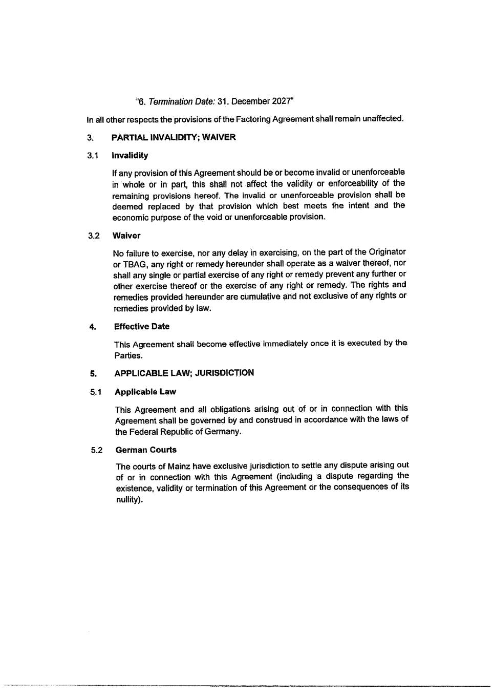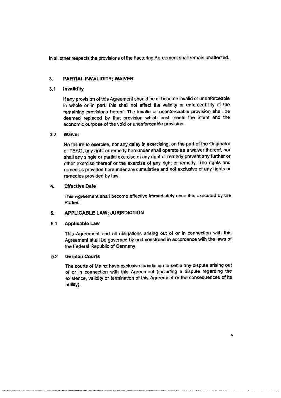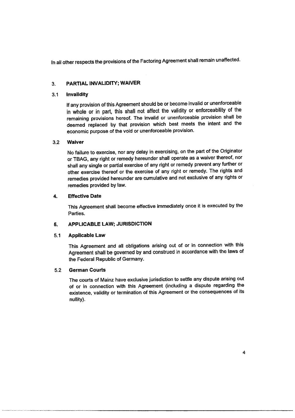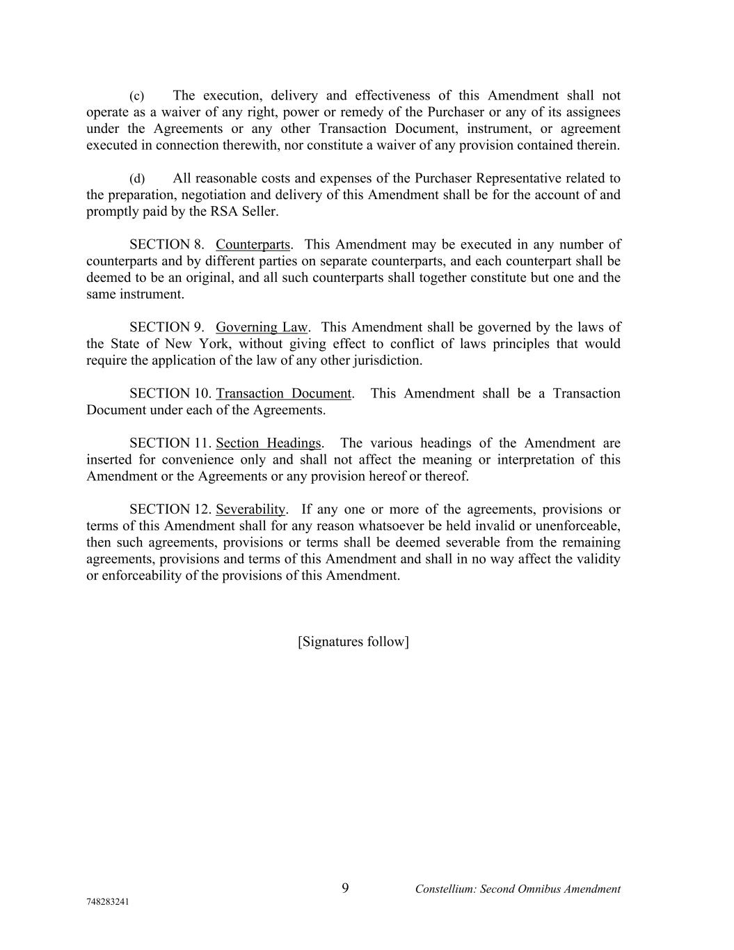 9 Constellium: Second Omnibus Amendment 748283241 (c) The execution, delivery and effectiveness of this Amendment shall not operate as a waiver of any right, power or remedy of the Purchaser or any of its assignees under the Agreements or any other Transaction Document, instrument, or agreement executed in connection therewith, nor constitute a waiver of any provision contained therein. (d) All reasonable costs and expenses of the Purchaser Representative related to the preparation, negotiation and delivery of this Amendment shall be for the account of and promptly paid by the RSA Seller. SECTION 8. Counterparts. This Amendment may be executed in any number of counterparts and by different parties on separate counterparts, and each counterpart shall be deemed to be an original, and all such counterparts shall together constitute but one and the same instrument. SECTION 9. Governing Law. This Amendment shall be governed by the laws of the State of New York, without giving effect to conflict of laws principles that would require the application of the law of any other jurisdiction. SECTION 10. Transaction Document. This Amendment shall be a Transaction Document under each of the Agreements. SECTION 11. Section Headings. The various headings of the Amendment are inserted for convenience only and shall not affect the meaning or interpretation of this Amendment or the Agreements or any provision hereof or thereof. SECTION 12. Severability. If any one or more of the agreements, provisions or terms of this Amendment shall for any reason whatsoever be held invalid or unenforceable, then such agreements, provisions or terms shall be deemed severable from the remaining agreements, provisions and terms of this Amendment and shall in no way affect the validity or enforceability of the provisions of this Amendment. [Signatures follow]