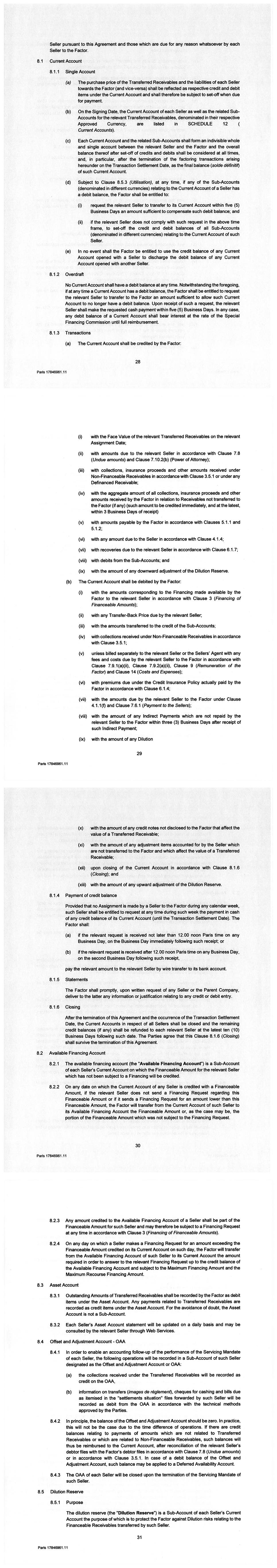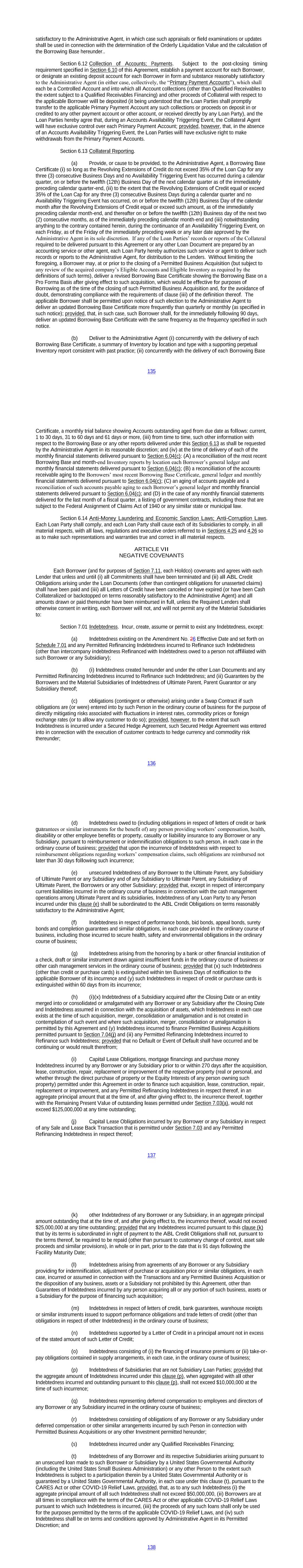 135 satisfactory to the Administrative Agent, in which case such appraisals or field examinations or updates shall be used in connection with the determination of the Orderly Liquidation Value and the calculation of the Borrowing Base hereunder.. Section 6.12 Collection of Accounts; Payments. Subject to the post-closing timing requirement specified in Section 6.10 of this Agreement, establish a payment account for each Borrower, or designate an existing deposit account for each Borrower in form and substance reasonably satisfactory to the Administrative Agent (in either case, collectively, the “Primary Payment Accounts”), which shall each be a Controlled Account and into which all Account collections (other than Qualified Receivables to the extent subject to a Qualified Receivables Financing) and other proceeds of Collateral with respect to the applicable Borrower will be deposited (it being understood that the Loan Parties shall promptly transfer to the applicable Primary Payment Account any such collections or proceeds on deposit in or credited to any other payment account or other account, or received directly by any Loan Party), and the Loan Parties hereby agree that, during an Accounts Availability Triggering Event, the Collateral Agent will have exclusive control over each Primary Payment Account; provided, however, that, in the absence of an Accounts Availability Triggering Event, the Loan Parties will have exclusive right to make withdrawals from the Primary Payment Accounts. Section 6.13 Collateral Reporting. (a) Provide, or cause to be provided, to the Administrative Agent, a Borrowing Base Certificate (i) so long as the Revolving Extensions of Credit do not exceed 35% of the Loan Cap for any three (3) consecutive Business Days and no Availability Triggering Event has occurred during a calendar quarter, on or before the twelfth (12th) Business Day of the next calendar quarter as of the immediately preceding calendar quarter-end, (ii) to the extent that the Revolving Extensions of Credit equal or exceed 35% of the Loan Cap for any three (3) consecutive Business Days during a calendar quarter and no Availability Triggering Event has occurred, on or before the twelfth (12th) Business Day of the calendar month after the Revolving Extensions of Credit equal or exceed such amount, as of the immediately preceding calendar month-end, and thereafter on or before the twelfth (12th) Business day of the next two (2) consecutive months, as of the immediately preceding calendar month-end and (iii) notwithstanding anything to the contrary contained herein, during the continuance of an Availability Triggering Event, on each Friday, as of the Friday of the immediately preceding week or any later date approved by the Administrative Agent in its sole discretion. If any of the Loan Parties’ records or reports of the Collateral required to be delivered pursuant to this Agreement or any other Loan Document are prepared by an accounting service or other agent, each Loan Party hereby authorizes such service or agent to deliver such records or reports to the Administrative Agent, for distribution to the Lenders. Without limiting the foregoing, a Borrower may, at or prior to the closing of a Permitted Business Acquisition (but subject to any review of the acquired company’s Eligible Accounts and Eligible Inventory as required by the definitions of such terms), deliver a revised Borrowing Base Certificate showing the Borrowing Base on a Pro Forma Basis after giving effect to such acquisition, which would be effective for purposes of Borrowing as of the time of the closing of such Permitted Business Acquisition and, for the avoidance of doubt, demonstrating compliance with the requirements of clause (iii) of the definition thereof. The applicable Borrower shall be permitted upon notice of such election to the Administrative Agent to deliver an updated Borrowing Base Certificate more frequently than quarterly or monthly (as specified in such notice); provided, that, in such case, such Borrower shall, for the immediately following 90 days, deliver an updated Borrowing Base Certificate with the same frequency as the frequency specified in such notice. (b) Deliver to the Administrative Agent (i) concurrently with the delivery of each Borrowing Base Certificate, a summary of Inventory by location and type with a supporting perpetual Inventory report consistent with past practice; (ii) concurrently with the delivery of each Borrowing Base 136 Certificate, a monthly trial balance showing Accounts outstanding aged from due date as follows: current, 1 to 30 days, 31 to 60 days and 61 days or more, (iii) from time to time, such other information with respect to the Borrowing Base or any other reports delivered under this Section 6.13 as shall be requested by the Administrative Agent in its reasonable discretion; and (iv) at the time of delivery of each of the monthly financial statements delivered pursuant to Section 6.04(c): (A) a reconciliation of the most recent Borrowing Base and month-end Inventory reports by location each Borrower’s general ledger and monthly financial statements delivered pursuant to Section 6.04(c); (B) a reconciliation of the accounts receivable aging to the Borrowers’ most recent Borrowing Base Certificate, general ledger and monthly financial statements delivered pursuant to Section 6.04(c); (C) an aging of accounts payable and a reconciliation of such accounts payable aging to each Borrower’s general ledger and monthly financial statements delivered pursuant to Section 6.04(c); and (D) in the case of any monthly financial statements delivered for the last month of a fiscal quarter, a listing of government contracts, including those that are subject to the Federal Assignment of Claims Act of 1940 or any similar state or municipal law. Section 6.14 Anti-Money Laundering and Economic Sanction Laws; Anti-Corruption Laws. Each Loan Party shall comply, and each Loan Party shall 