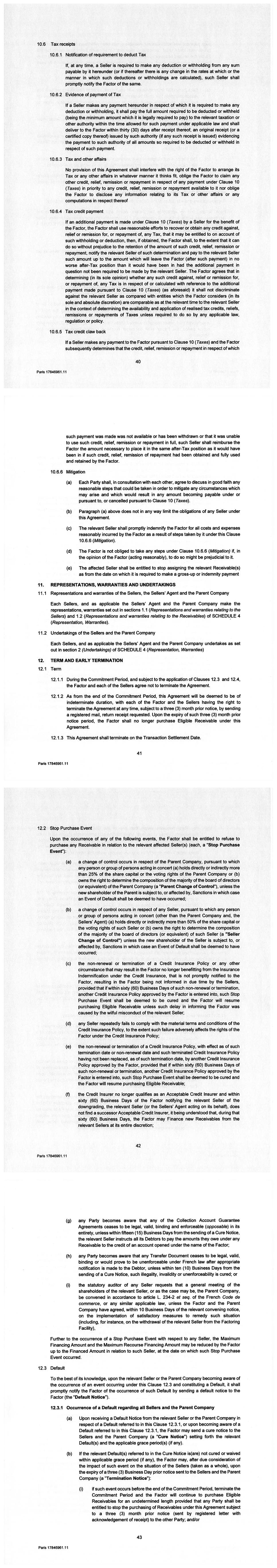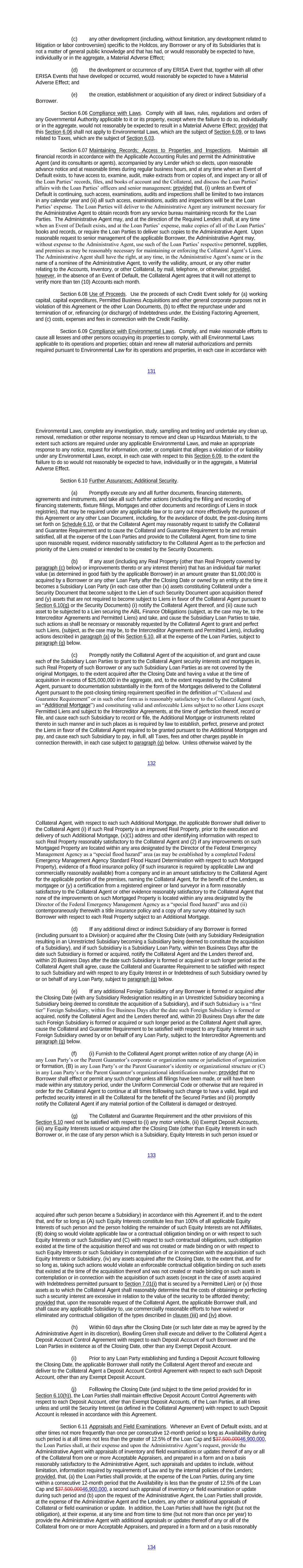 131 (c) any other development (including, without limitation, any development related to litigation or labor controversies) specific to the Holdcos, any Borrower or any of its Subsidiaries that is not a matter of general public knowledge and that has had, or would reasonably be expected to have, individually or in the aggregate, a Material Adverse Effect; (d) the development or occurrence of any ERISA Event that, together with all other ERISA Events that have developed or occurred, would reasonably be expected to have a Material Adverse Effect; and (e) the creation, establishment or acquisition of any direct or indirect Subsidiary of a Borrower. Section 6.06 Compliance with Laws. Comply with all laws, rules, regulations and orders of any Governmental Authority applicable to it or its property, except where the failure to do so, individually or in the aggregate, would not reasonably be expected to result in a Material Adverse Effect; provided that this Section 6.06 shall not apply to Environmental Laws, which are the subject of Section 6.09, or to laws related to Taxes, which are the subject of Section 6.03. Section 6.07 Maintaining Records; Access to Properties and Inspections. Maintain all financial records in accordance with the Applicable Accounting Rules and permit the Administrative Agent (and its consultants or agents), accompanied by any Lender which so elects, upon reasonable advance notice and at reasonable times during regular business hours, and at any time when an Event of Default exists, to have access to, examine, audit, make extracts from or copies of, and inspect any or all of the Loan Parties’ records, files, and books of account and the Collateral, and discuss the Loan Parties’ affairs with the Loan Parties’ officers and senior management; provided that, (i) unless an Event of Default is continuing, such access, examinations, audits and inspections shall be limited to two instances in any calendar year and (ii) all such access, examinations, audits and inspections will be at the Loan Parties’ expense. The Loan Parties will deliver to the Administrative Agent any instrument necessary for the Administrative Agent to obtain records from any service bureau maintaining records for the Loan Parties. The Administrative Agent may, and at the direction of the Required Lenders shall, at any time when an Event of Default exists, and at the Loan Parties’ expense, make copies of all of the Loan Parties’ books and records, or require the Loan Parties to deliver such copies to the Administrative Agent. Upon reasonable request to senior management of the applicable Borrower, the Administrative Agent may, without expense to the Administrative Agent, use such of the Loan Parties’ respective personnel, supplies, and premises as may be reasonably necessary for maintaining or enforcing the Collateral Agent’s Liens. The Administrative Agent shall have the right, at any time, in the Administrative Agent’s name or in the name of a nominee of the Administrative Agent, to verify the validity, amount, or any other matter relating to the Accounts, Inventory, or other Collateral, by mail, telephone, or otherwise; provided, however, in the absence of an Event of Default, the Collateral Agent agrees that it will not attempt to verify more than ten (10) Accounts each month. Section 6.08 Use of Proceeds. Use the proceeds of each Credit Event solely for (a) working capital, capital expenditures, Permitted Business Acquisitions and other general corporate purposes not in violation of this Agreement or the other Loan Documents, (b) to effect the repurchase under and termination of or, refinancing (or discharge) of Indebtedness under, the Existing Factoring Agreement, and (c) costs, expenses and fees in connection with the Credit Facility. Section 6.09 Compliance with Environmental Laws. Comply, and make reasonable efforts to cause all lessees and other persons occupying its properties to comply, with all Environmental Laws applicable to its operations and properties; obtain and renew all material authorizations and permits required pursuant to Environmental Law for its operations and properties, in each case in accordance with 132 Environmental Laws, complete any investigation, study, sampling and testing and undertake any clean up, removal, remediation or other response necessary to remove and clean up Hazardous Materials, to the extent such actions are required under any applicable Environmental Laws, and make an appropriate response to any notice, request for information, order, or complaint that alleges a violation of or liability under any Environmental Laws, except, in each case with respect to this Section 6.09, to the extent the failure to do so would not reasonably be expected to have, individually or in the aggregate, a Material Adverse Effect. Section 6.10 Further Assurances; Additional Security. (a) Promptly execute any and all further documents, financing statements, agreements and instruments, and take all such further actions (including the filing and recording of financing statements, fixture filings, Mortgages and other documents and recordings of Liens in stock registries), that may be required under any applicable law or to carry out more effectively the purposes of this Agreement or any other Loan Document, including, for the avoidance of doubt, the post-closing items set forth on Schedule 6.10, or that the Collateral Agent may reasonably request to satisfy the Collateral and Guarantee Requirement and to cause the Collateral and Guarantee Requirement to be and remain satisfied, all at the expense of the Loan Parties and provide to the Collateral Agent, from time to time upon reasonable request, evidence reasonably satisfactory to the Collateral Agent as to the perfection and priority of the Liens created or intended to be created by the Security Documents. (b) If any asset (including any Real Property (other than Real Property covered by paragraph (c) below) or improv