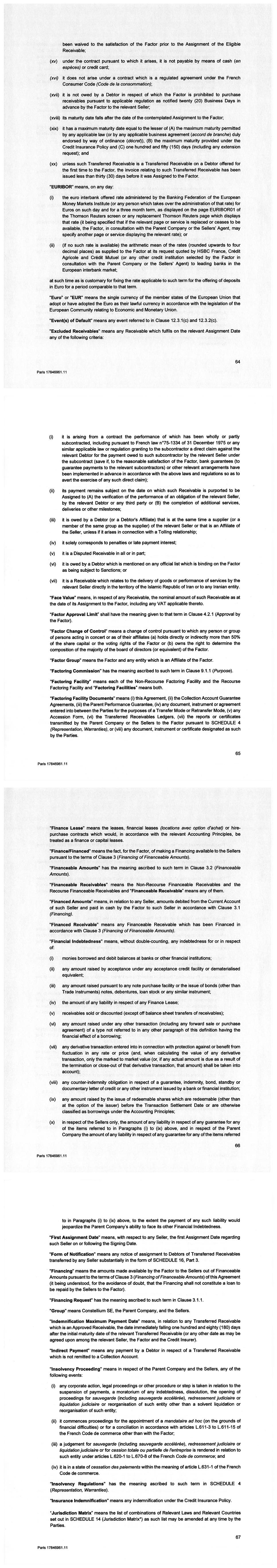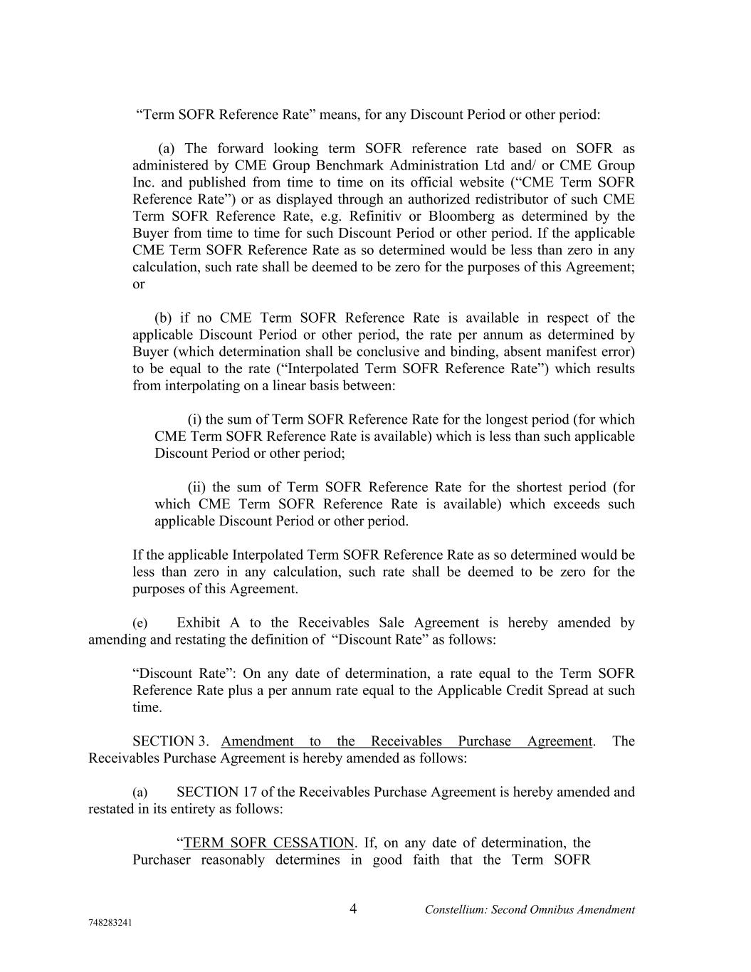 4 Constellium: Second Omnibus Amendment 748283241 “Term SOFR Reference Rate” means, for any Discount Period or other period: (a) The forward looking term SOFR reference rate based on SOFR as administered by CME Group Benchmark Administration Ltd and/ or CME Group Inc. and published from time to time on its official website (“CME Term SOFR Reference Rate”) or as displayed through an authorized redistributor of such CME Term SOFR Reference Rate, e.g. Refinitiv or Bloomberg as determined by the Buyer from time to time for such Discount Period or other period. If the applicable CME Term SOFR Reference Rate as so determined would be less than zero in any calculation, such rate shall be deemed to be zero for the purposes of this Agreement; or (b) if no CME Term SOFR Reference Rate is available in respect of the applicable Discount Period or other period, the rate per annum as determined by Buyer (which determination shall be conclusive and binding, absent manifest error) to be equal to the rate (“Interpolated Term SOFR Reference Rate”) which results from interpolating on a linear basis between: (i) the sum of Term SOFR Reference Rate for the longest period (for which CME Term SOFR Reference Rate is available) which is less than such applicable Discount Period or other period; (ii) the sum of Term SOFR Reference Rate for the shortest period (for which CME Term SOFR Reference Rate is available) which exceeds such applicable Discount Period or other period. If the applicable Interpolated Term SOFR Reference Rate as so determined would be less than zero in any calculation, such rate shall be deemed to be zero for the purposes of this Agreement. (e) Exhibit A to the Receivables Sale Agreement is hereby amended by amending and restating the definition of “Discount Rate” as follows: “Discount Rate”: On any date of determination, a rate equal to the Term SOFR Reference Rate plus a per annum rate equal to the Applicable Credit Spread at such time. SECTION 3. Amendment to the Receivables Purchase Agreement. The Receivables Purchase Agreement is hereby amended as follows: (a) SECTION 17 of the Receivables Purchase Agreement is hereby amended and restated in its entirety as follows: “TERM SOFR CESSATION. If, on any date of determination, the Purchaser reasonably determines in good faith that the Term SOFR