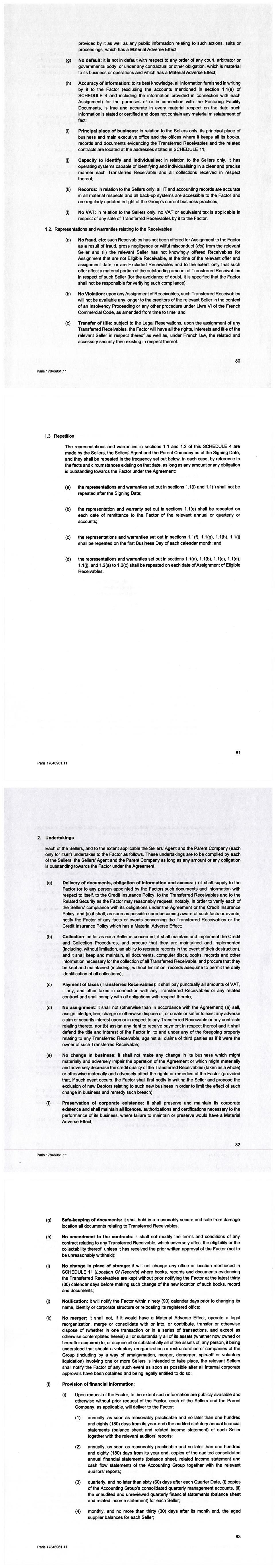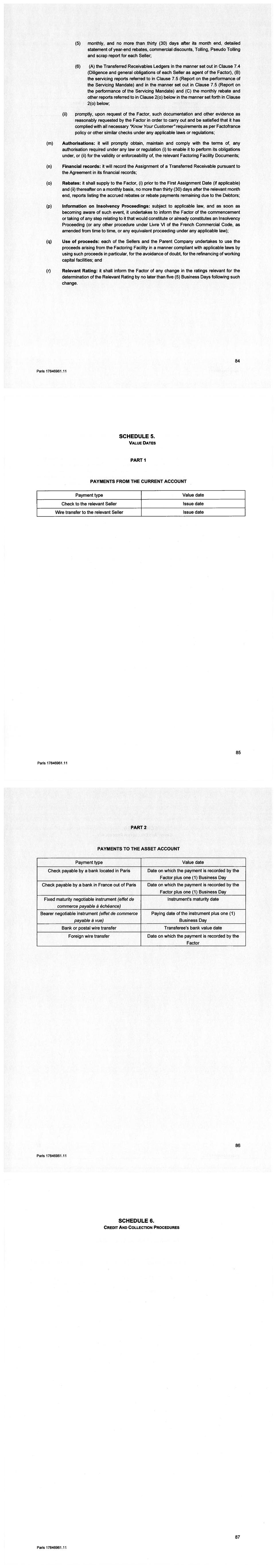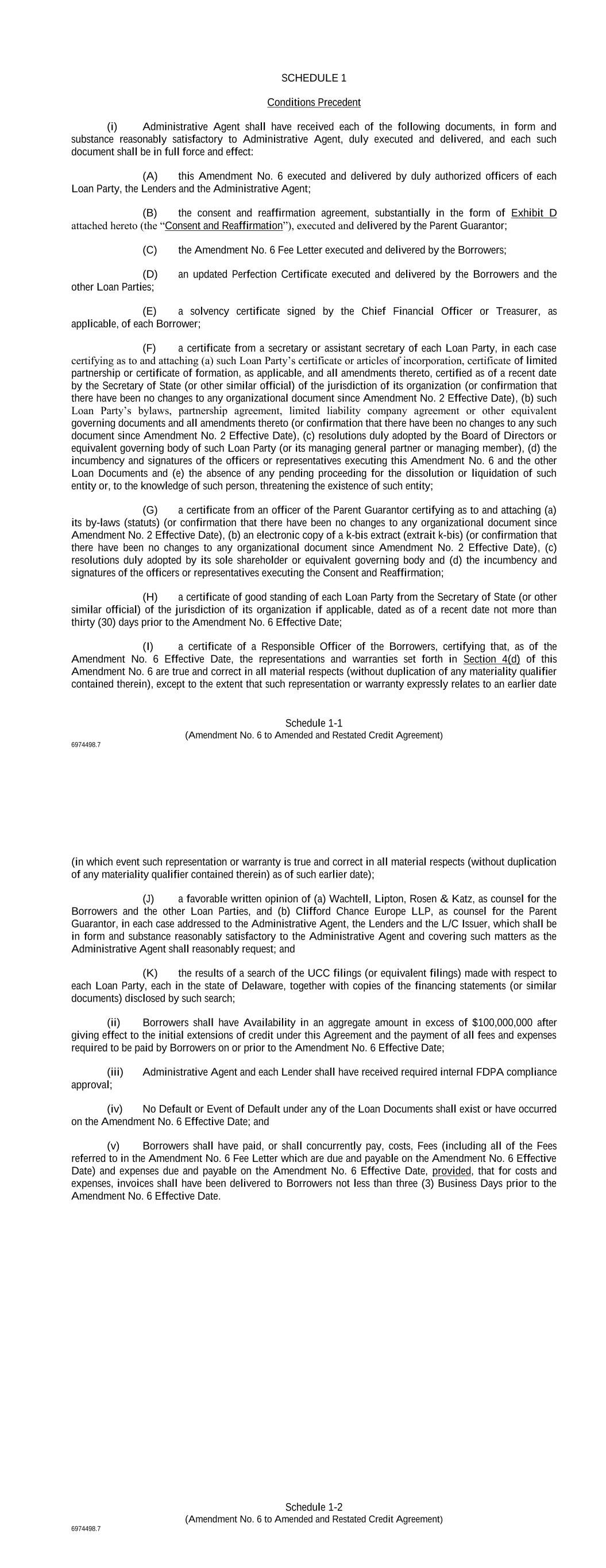 Schedule 1-1 (Amendment No. 6 to Amended and Restated Credit Agreement) 6974498.7 SCHEDULE 1 Conditions Precedent (i) Administrative Agent shall have received each of the following documents, in form and substance reasonably satisfactory to Administrative Agent, duly executed and delivered, and each such document shall be in full force and effect: (A) this Amendment No. 6 executed and delivered by duly authorized officers of each Loan Party, the Lenders and the Administrative Agent; (B) the consent and reaffirmation agreement, substantially in the form of Exhibit D attached hereto (the “Consent and Reaffirmation”), executed and delivered by the Parent Guarantor; (C) the Amendment No. 6 Fee Letter executed and delivered by the Borrowers; (D) an updated Perfection Certificate executed and delivered by the Borrowers and the other Loan Parties; (E) a solvency certificate signed by the Chief Financial Officer or Treasurer, as applicable, of each Borrower; (F) a certificate from a secretary or assistant secretary of each Loan Party, in each case certifying as to and attaching (a) such Loan Party’s certificate or articles of incorporation, certificate of limited partnership or certificate of formation, as applicable, and all amendments thereto, certified as of a recent date by the Secretary of State (or other similar official) of the jurisdiction of its organization (or confirmation that there have been no changes to any organizational document since Amendment No. 2 Effective Date), (b) such Loan Party’s bylaws, partnership agreement, limited liability company agreement or other equivalent governing documents and all amendments thereto (or confirmation that there have been no changes to any such document since Amendment No. 2 Effective Date), (c) resolutions duly adopted by the Board of Directors or equivalent governing body of such Loan Party (or its managing general partner or managing member), (d) the incumbency and signatures of the officers or representatives executing this Amendment No. 6 and the other Loan Documents and (e) the absence of any pending proceeding for the dissolution or liquidation of such entity or, to the knowledge of such person, threatening the existence of such entity; (G) a certificate from an officer of the Parent Guarantor certifying as to and attaching (a) its by-laws (statuts) (or confirmation that there have been no changes to any organizational document since Amendment No. 2 Effective Date), (b) an electronic copy of a k-bis extract (extrait k-bis) (or confirmation that there have been no changes to any organizational document since Amendment No. 2 Effective Date), (c) resolutions duly adopted by its sole shareholder or equivalent governing body and (d) the incumbency and signatures of the officers or representatives executing the Consent and Reaffirmation; (H) a certificate of good standing of each Loan Party from the Secretary of State (or other similar official) of the jurisdiction of its organization if applicable, dated as of a recent date not more than thirty (30) days prior to the Amendment No. 6 Effective Date; (I) a certificate of a Responsible Officer of the Borrowers, certifying that, as of the Amendment No. 6 Effective Date, the representations and warranties set forth in Section 4(d) of this Amendment No. 6 are true and correct in all material respects (without duplication of any materiality qualifier contained therein), except to the extent that such representation or warranty expressly relates to an earlier date Schedule 1-2 (Amendment No. 6 to Amended and Restated Credit Agreement) 6974498.7 (in which event such representation or warranty is true and correct in all material respects (without duplication of any materiality qualifier contained therein) as of such earlier date); (J) a favorable written opinion of (a) Wachtell, Lipton, Rosen & Katz, as counsel for the Borrowers and the other Loan Parties, and (b) Clifford Chance Europe LLP, as counsel for the Parent Guarantor, in each case addressed to the Administrative Agent, the Lenders and the L/C Issuer, which shall be in form and substance reasonably satisfactory to the Administrative Agent and covering such matters as the Administrative Agent shall reasonably request; and (K) the results of a search of the UCC filings (or equivalent filings) made with respect to each Loan Party, each in the state of Delaware, together with copies of the financing statements (or similar documents) disclosed by such search; (ii) Borrowers shall have Availability in an aggregate amount in excess of $100,000,000 after giving effect to the initial extensions of credit under this Agreement and the payment of all fees and expenses required to be paid by Borrowers on or prior to the Amendment No. 6 Effective Date; (iii) Administrative Agent and each Lender shall have received required internal FDPA compliance approval; (iv) No Default or Event of Default under any of the Loan Documents shall exist or have occurred on the Amendment No. 6 Effective Date; and (v) Borrowers shall have paid, or shall concurrently pay, costs, Fees (including all of the Fees referred to in the Amendment No. 6 Fee Letter which are due and payable on the Amendment No. 6 Effective Date) and expenses due and payable on the Amendment No. 6 Effective Date, provided, that for costs and expenses, invoices shall have been delivered to Borrowers not less than three (3) Business Days prior to the Amendment No. 6 Effective Date.