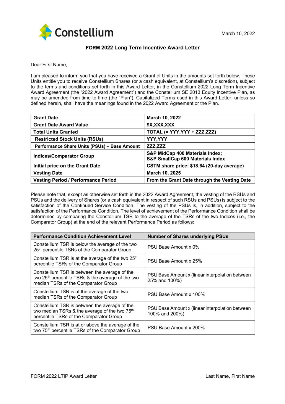 FORM 2022 LTIP Award Letter Last Name, First Name March 10, 2022 FORM 2022 Long Term Incentive Award Letter Dear First Name, I am pleased to inform you that you have received a Grant of Units in the amounts set forth below. These Units entitle you to receive Constellium Shares (or a cash equivalent, at Constellium’s discretion), subject to the terms and conditions set forth in this Award Letter, in the Constellium 2022 Long Term Incentive Award Agreement (the “2022 Award Agreement”) and the Constellium SE 2013 Equity Incentive Plan, as may be amended from time to time (the “Plan”). Capitalized Terms used in this Award Letter, unless so defined herein, shall have the meanings found in the 2022 Award Agreement or the Plan. Grant Date March 10, 2022 Grant Date Award Value $X,XXX,XXX Total Units Granted TOTAL (= YYY,YYY + ZZZ,ZZZ) Restricted Stock Units (RSUs) YYY,YYY Performance Share Units (PSUs) – Base Amount ZZZ,ZZZ Indices/Comparator Group S&P MidCap 400 Materials Index; S&P SmallCap 600 Materials Index Initial price on the Grant Date CSTM share price: $18.64 (20-day average) Vesting Date March 10, 2025 Vesting Period / Performance Period From the Grant Date through the Vesting Date Please note that, except as otherwise set forth in the 2022 Award Agreement, the vesting of the RSUs and PSUs and the delivery of Shares (or a cash equivalent in respect of such RSUs and PSUs) is subject to the satisfaction of the Continued Service Condition. The vesting of the PSUs is, in addition, subject to the satisfaction of the Performance Condition. The level of achievement of the Performance Condition shall be determined by comparing the Constellium TSR to the average of the TSRs of the two Indices (i.e., the Comparator Group) at the end of the relevant Performance Period as follows: Performance Condition Achievement Level Number of Shares underlying PSUs Constellium TSR is below the average of the two 25th percentile TSRs of the Comparator Group PSU Base Amount x 0% Constellium TSR is at the average of the two 25th percentile TSRs of the Comparator Group PSU Base Amount x 25% Constellium TSR is between the average of the two 25th percentile TSRs & the average of the two median TSRs of the Comparator Group PSU Base Amount x (linear interpolation between 25% and 100%) Constellium TSR is at the average of the two median TSRs of the Comparator Group PSU Base Amount x 100% Constellium TSR is between the average of the two median TSRs & the average of the two 75th percentile TSRs of the Comparator Group PSU Base Amount x (linear interpolation between 100% and 200%) Constellium TSR is at or above the average of the two 75th percentile TSRs of the Comparator Group PSU Base Amount x 200%