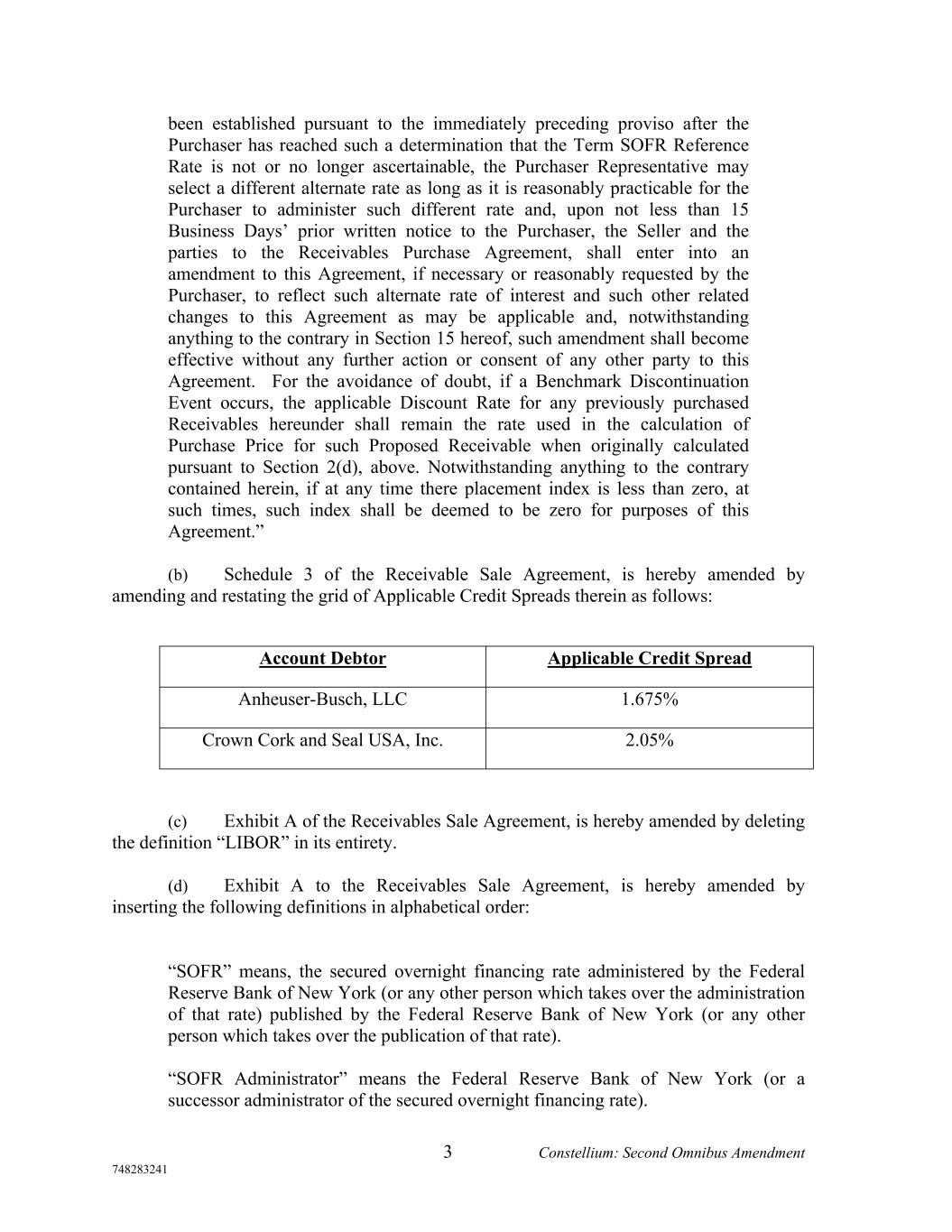 3 Constellium: Second Omnibus Amendment 748283241 been established pursuant to the immediately preceding proviso after the Purchaser has reached such a determination that the Term SOFR Reference Rate is not or no longer ascertainable, the Purchaser Representative may select a different alternate rate as long as it is reasonably practicable for the Purchaser to administer such different rate and, upon not less than 15 Business Days’ prior written notice to the Purchaser, the Seller and the parties to the Receivables Purchase Agreement, shall enter into an amendment to this Agreement, if necessary or reasonably requested by the Purchaser, to reflect such alternate rate of interest and such other related changes to this Agreement as may be applicable and, notwithstanding anything to the contrary in Section 15 hereof, such amendment shall become effective without any further action or consent of any other party to this Agreement. For the avoidance of doubt, if a Benchmark Discontinuation Event occurs, the applicable Discount Rate for any previously purchased Receivables hereunder shall remain the rate used in the calculation of Purchase Price for such Proposed Receivable when originally calculated pursuant to Section 2(d), above. Notwithstanding anything to the contrary contained herein, if at any time there placement index is less than zero, at such times, such index shall be deemed to be zero for purposes of this Agreement.” (b) Schedule 3 of the Receivable Sale Agreement, is hereby amended by amending and restating the grid of Applicable Credit Spreads therein as follows: Account Debtor Applicable Credit Spread Anheuser-Busch, LLC 1.675% Crown Cork and Seal USA, Inc. 2.05% (c) Exhibit A of the Receivables Sale Agreement, is hereby amended by deleting the definition “LIBOR” in its entirety. (d) Exhibit A to the Receivables Sale Agreement, is hereby amended by inserting the following definitions in alphabetical order: “SOFR” means, the secured overnight financing rate administered by the Federal Reserve Bank of New York (or any other person which takes over the administration of that rate) published by the Federal Reserve Bank of New York (or any other person which takes over the publication of that rate). “SOFR Administrator” means the Federal Reserve Bank of New York (or a successor administrator of the secured overnight financing rate).