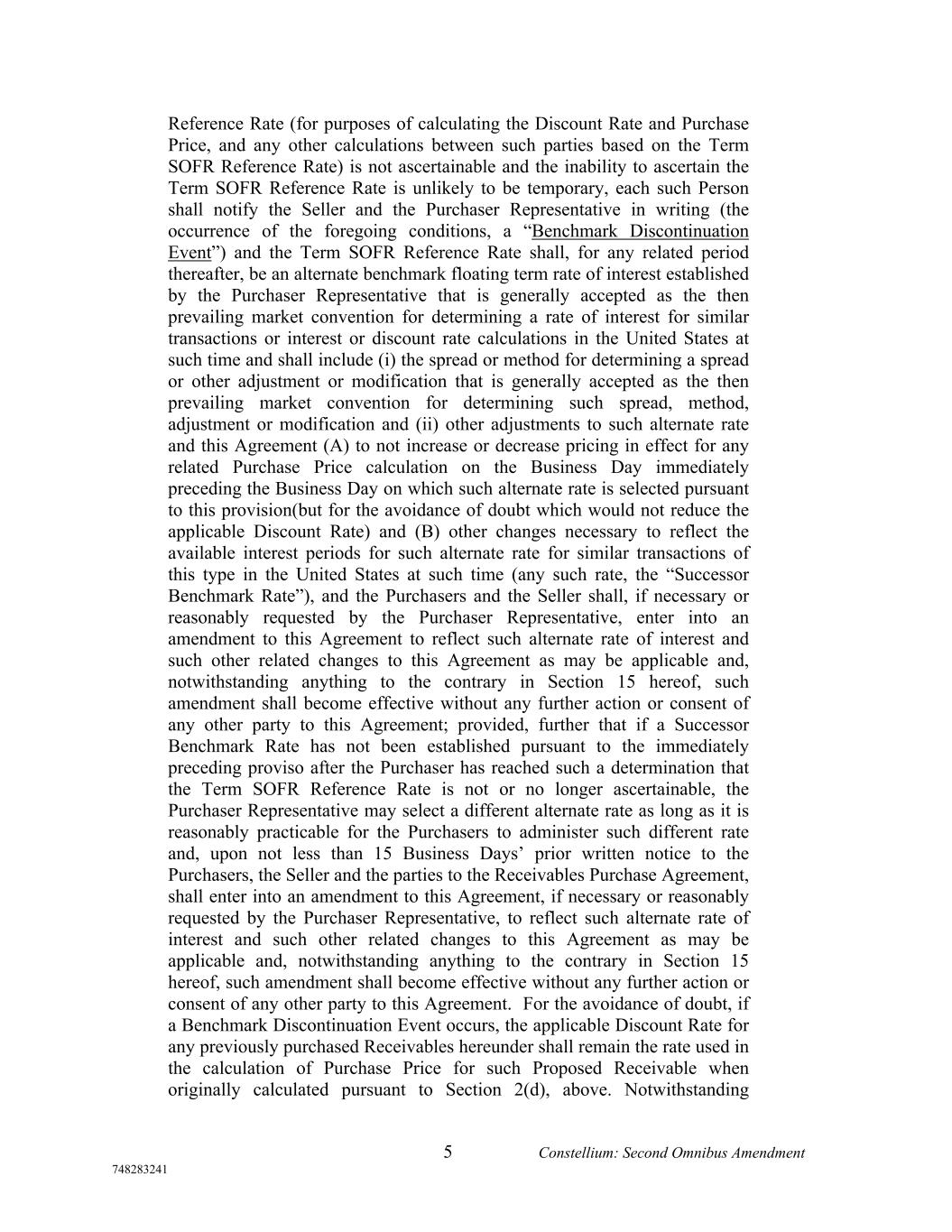 5 Constellium: Second Omnibus Amendment 748283241 Reference Rate (for purposes of calculating the Discount Rate and Purchase Price, and any other calculations between such parties based on the Term SOFR Reference Rate) is not ascertainable and the inability to ascertain the Term SOFR Reference Rate is unlikely to be temporary, each such Person shall notify the Seller and the Purchaser Representative in writing (the occurrence of the foregoing conditions, a “Benchmark Discontinuation Event”) and the Term SOFR Reference Rate shall, for any related period thereafter, be an alternate benchmark floating term rate of interest established by the Purchaser Representative that is generally accepted as the then prevailing market convention for determining a rate of interest for similar transactions or interest or discount rate calculations in the United States at such time and shall include (i) the spread or method for determining a spread or other adjustment or modification that is generally accepted as the then prevailing market convention for determining such spread, method, adjustment or modification and (ii) other adjustments to such alternate rate and this Agreement (A) to not increase or decrease pricing in effect for any related Purchase Price calculation on the Business Day immediately preceding the Business Day on which such alternate rate is selected pursuant to this provision(but for the avoidance of doubt which would not reduce the applicable Discount Rate) and (B) other changes necessary to reflect the available interest periods for such alternate rate for similar transactions of this type in the United States at such time (any such rate, the “Successor Benchmark Rate”), and the Purchasers and the Seller shall, if necessary or reasonably requested by the Purchaser Representative, enter into an amendment to this Agreement to reflect such alternate rate of interest and such other related changes to this Agreement as may be applicable and, notwithstanding anything to the contrary in Section 15 hereof, such amendment shall become effective without any further action or consent of any other party to this Agreement; provided, further that if a Successor Benchmark Rate has not been established pursuant to the immediately preceding proviso after the Purchaser has reached such a determination that the Term SOFR Reference Rate is not or no longer ascertainable, the Purchaser Representative may select a different alternate rate as long as it is reasonably practicable for the Purchasers to administer such different rate and, upon not less than 15 Business Days’ prior written notice to the Purchasers, the Seller and the parties to the Receivables Purchase Agreement, shall enter into an amendment to this Agreement, if necessary or reasonably requested by the Purchaser Representative, to reflect such alternate rate of interest and such other related changes to this Agreement as may be applicable and, notwithstanding anything to the contrary in Section 15 hereof, such amendment shall become effective without any further action or consent of any other party to this Agreement. For the avoidance of doubt, if a Benchmark Discontinuation Event occurs, the applicable Discount Rate for any previously purchased Receivables hereunder shall remain the rate used in the calculation of Purchase Price for such Proposed Receivable when originally calculated pursuant to Section 2(d), above. Notwithstanding