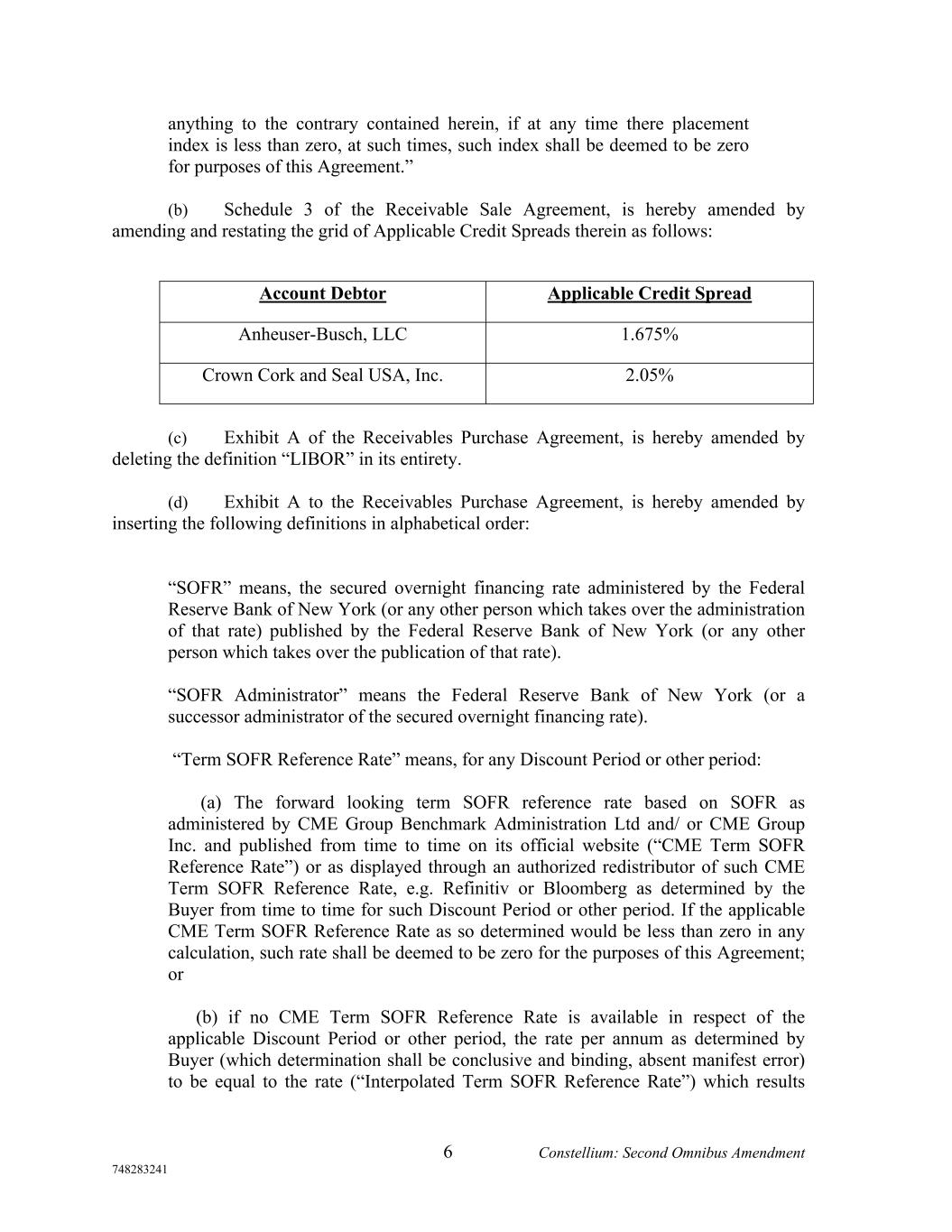 6 Constellium: Second Omnibus Amendment 748283241 anything to the contrary contained herein, if at any time there placement index is less than zero, at such times, such index shall be deemed to be zero for purposes of this Agreement.” (b) Schedule 3 of the Receivable Sale Agreement, is hereby amended by amending and restating the grid of Applicable Credit Spreads therein as follows: Account Debtor Applicable Credit Spread Anheuser-Busch, LLC 1.675% Crown Cork and Seal USA, Inc. 2.05% (c) Exhibit A of the Receivables Purchase Agreement, is hereby amended by deleting the definition “LIBOR” in its entirety. (d) Exhibit A to the Receivables Purchase Agreement, is hereby amended by inserting the following definitions in alphabetical order: “SOFR” means, the secured overnight financing rate administered by the Federal Reserve Bank of New York (or any other person which takes over the administration of that rate) published by the Federal Reserve Bank of New York (or any other person which takes over the publication of that rate). “SOFR Administrator” means the Federal Reserve Bank of New York (or a successor administrator of the secured overnight financing rate). “Term SOFR Reference Rate” means, for any Discount Period or other period: (a) The forward looking term SOFR reference rate based on SOFR as administered by CME Group Benchmark Administration Ltd and/ or CME Group Inc. and published from time to time on its official website (“CME Term SOFR Reference Rate”) or as displayed through an authorized redistributor of such CME Term SOFR Reference Rate, e.g. Refinitiv or Bloomberg as determined by the Buyer from time to time for such Discount Period or other period. If the applicable CME Term SOFR Reference Rate as so determined would be less than zero in any calculation, such rate shall be deemed to be zero for the purposes of this Agreement; or (b) if no CME Term SOFR Reference Rate is available in respect of the applicable Discount Period or other period, the rate per annum as determined by Buyer (which determination shall be conclusive and binding, absent manifest error) to be equal to the rate (“Interpolated Term SOFR Reference Rate”) which results