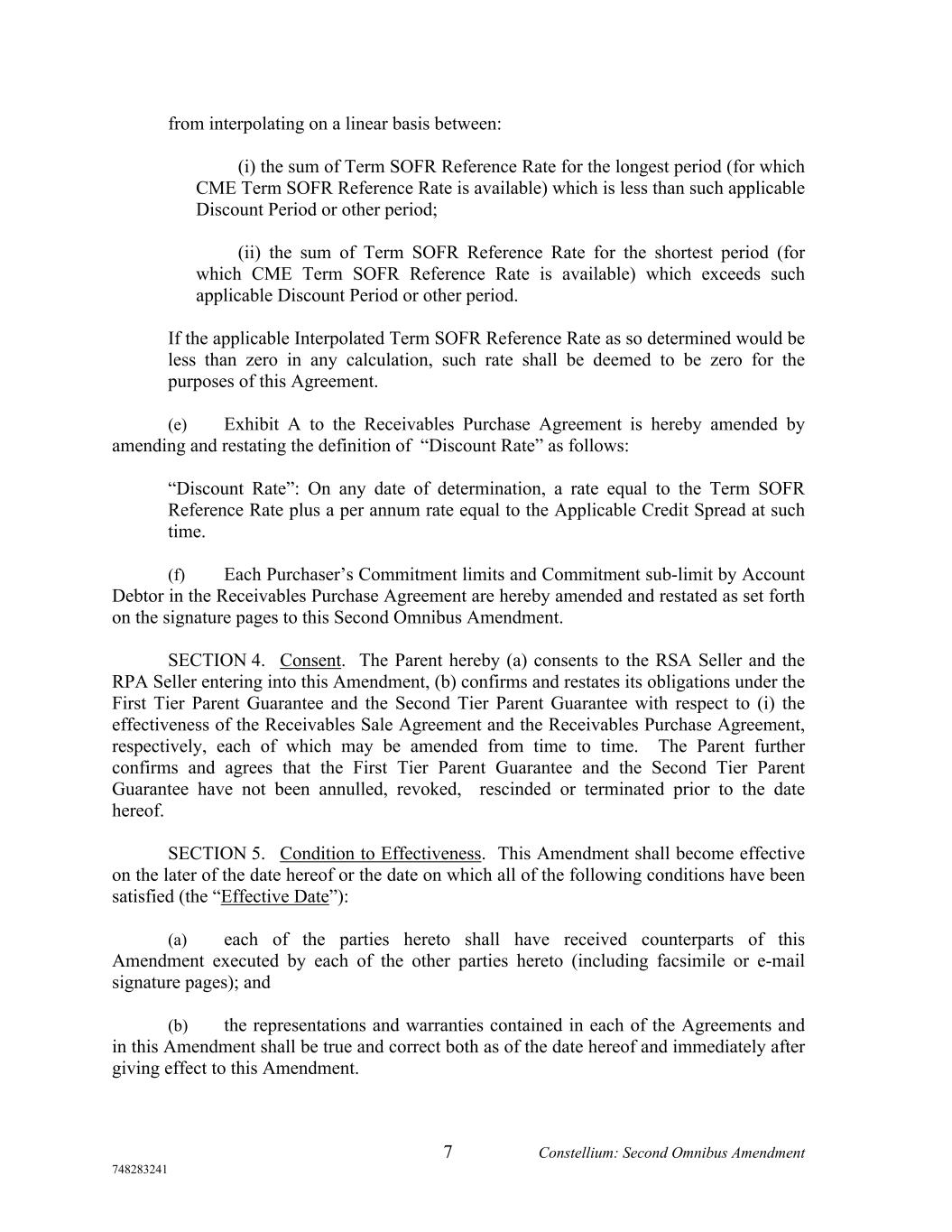 7 Constellium: Second Omnibus Amendment 748283241 from interpolating on a linear basis between: (i) the sum of Term SOFR Reference Rate for the longest period (for which CME Term SOFR Reference Rate is available) which is less than such applicable Discount Period or other period; (ii) the sum of Term SOFR Reference Rate for the shortest period (for which CME Term SOFR Reference Rate is available) which exceeds such applicable Discount Period or other period. If the applicable Interpolated Term SOFR Reference Rate as so determined would be less than zero in any calculation, such rate shall be deemed to be zero for the purposes of this Agreement. (e) Exhibit A to the Receivables Purchase Agreement is hereby amended by amending and restating the definition of “Discount Rate” as follows: “Discount Rate”: On any date of determination, a rate equal to the Term SOFR Reference Rate plus a per annum rate equal to the Applicable Credit Spread at such time. (f) Each Purchaser’s Commitment limits and Commitment sub-limit by Account Debtor in the Receivables Purchase Agreement are hereby amended and restated as set forth on the signature pages to this Second Omnibus Amendment. SECTION 4. Consent. The Parent hereby (a) consents to the RSA Seller and the RPA Seller entering into this Amendment, (b) confirms and restates its obligations under the First Tier Parent Guarantee and the Second Tier Parent Guarantee with respect to (i) the effectiveness of the Receivables Sale Agreement and the Receivables Purchase Agreement, respectively, each of which may be amended from time to time. The Parent further confirms and agrees that the First Tier Parent Guarantee and the Second Tier Parent Guarantee have not been annulled, revoked, rescinded or terminated prior to the date hereof. SECTION 5. Condition to Effectiveness. This Amendment shall become effective on the later of the date hereof or the date on which all of the following conditions have been satisfied (the “Effective Date”): (a) each of the parties hereto shall have received counterparts of this Amendment executed by each of the other parties hereto (including facsimile or e-mail signature pages); and (b) the representations and warranties contained in each of the Agreements and in this Amendment shall be true and correct both as of the date hereof and immediately after giving effect to this Amendment.