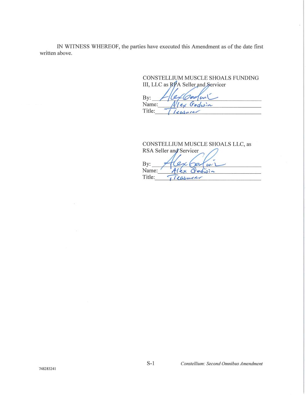 EXECUTION VERSION Constellium: Second Omnibus Amendment 748283241 SECOND OMNIBUS AMENDMENT This SECOND OMNIBUS AMENDMENT, dated as of June 28, 2022 (this “Amendment”) is: (1) THE SECOND AMENDMENT to the RECEIVABLES SALE AGREEMENT, between Constellium Muscle Shoals LLC, as seller (the “RSA Seller”) and Constellium Muscle Shoals Funding III LLC, as purchaser; and (2) THE SECOND AMENDMENT to the RECEIVABLES PURCHASE AGREEMENT, among Constellium Muscle Shoals Funding III LLC, as seller (the “RPA Seller”), the RSA Seller as servicer (the “Servicer”), Deutsche Bank Trust Company Americas, Deutsche Bank AG New York Branch, and each other subsidiary or affiliate of either such party who may from time to time become a party thereto (collectively, “DB”), in such capacity as a purchaser hereunder (each, a “RPA Purchaser”), and Intesa Sanpaolo S.p.A., New York Branch and each subsidiary or affiliate who may from time to time become a party thereto (collectively, “Intesa”), in its capacity as a purchaser thereunder (each, a “Purchaser” and, together with DB, and each of their permitted successors and assigns, collectively, the “Purchasers”), and in its capacity as purchaser representative hereunder (together with its successors and permitted assigns in such capacity, the “Purchaser Representative”). RECITALS WHEREAS, the RSA Seller and the RPA Seller have heretofore entered into the RECEIVABLES SALE AGREEMENT, dated as of September 30, 2021 (as amended, restated, supplemented, assigned or otherwise modified from time to time, the “Receivables Sale Agreement”); WHEREAS, Constellium International SAS (the “Parent”) has heretofore entered into a PERFORMANCE UNDERTAKING, dated as of September 30, 2021, in favor of the RPA Seller with respect to obligations under the Receivables Sale Agreement (the “First Tier Parent Guarantee”); WHEREAS, the RPA Seller, the Servicer, Intesa (in its capacity as Purchaser and Purchaser Representative) and DB (in its capacity as Purchaser) heretofore entered into the RECEIVABLES PURCHASE AGREEMENT, dated as of September 30, 2021 (as amended, restated, supplemented or otherwise modified from time to time, the “Receivables Purchase Agreement”; together with the Receivables Sale Agreement, each an “Agreement” and collectively, the “Agreements”); WHEREAS, the Parent has heretofore entered into a PERFORMANCE UNDERTAKING, dated as of September 30, 2021, in favor of the Purchasers with respect to obligations under the Receivables Purchase Agreement (the “Second Tier Parent Guarantee,” and together with the First Tier Parent Guarantee, the “Guarantees”); WHEREAS, the parties hereto seek to modify each of the Agreements upon the terms hereof.