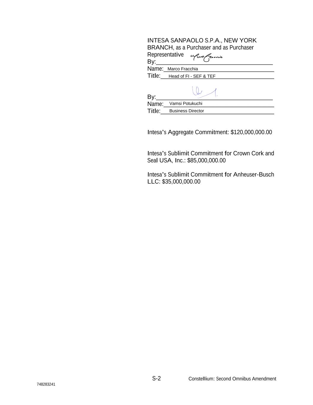S-2 Constellium: Second Omnibus Amendment 748283241 INTESA SANPAOLO S.P.A., NEW YORK BRANCH, as a Purchaser and as Purchaser Representative By:______________________________________ Name:____________________________________ Title:_____________________________________ By:______________________________________ Name:____________________________________ Title:_____________________________________ Intesa’s Aggregate Commitment: $120,000,000.00 Intesa’s Sublimit Commitment for Crown Cork and Seal USA, Inc.: $85,000,000.00 Intesa’s Sublimit Commitment for Anheuser-Busch LLC: $35,000,000.00 Marco Fracchia Head of FI - SEF & TEF Vamsi Potukuchi Business Director