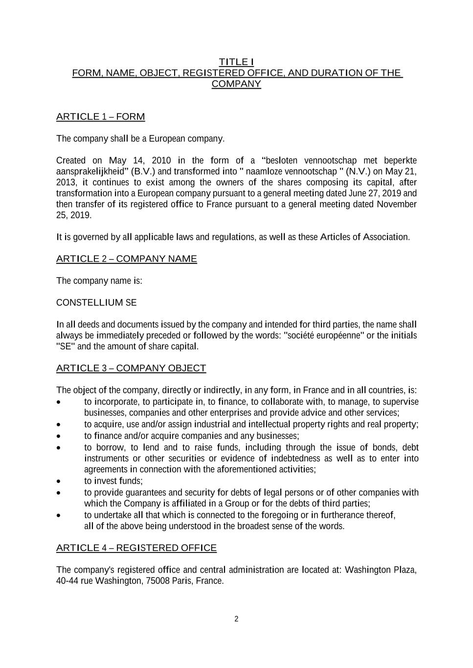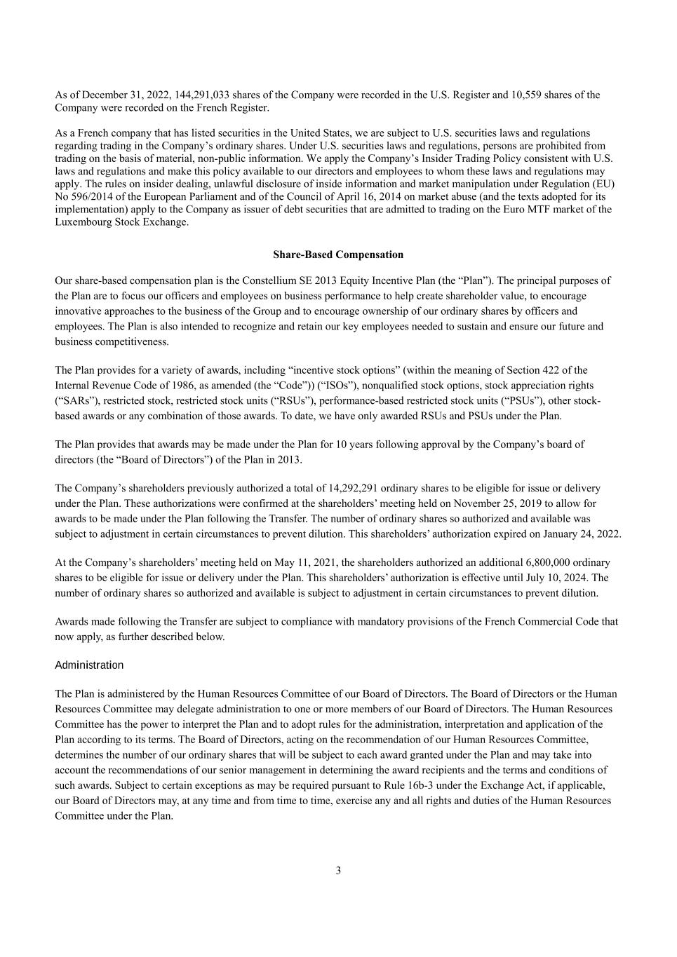 2022 Award Agreement 2 1. BACKGROUND This Award Agreement is adopted under the Constellium SE 2013 Equity Incentive Plan, as amended and restated from time to time (the “Plan”). The Units awarded under this Award Agreement entitle the Participant to receive Constellium Shares or a cash equivalent, subject to the terms and conditions of the Plan, this Award Agreement and the Award Letter. The Company’s shareholders have authorized the issuance of up to 21,092,291 Shares under the Plan (pursuant to corporate decisions taken on May 16, 2013, June 11, 2014, May 24, 2018 and May 11, 2021). This Award Agreement has been adopted by the Board of Directors of the Company pursuant to such authorization. 2. DEFINITIONS The terms and conditions set forth in the Plan are incorporated by reference. Terms used herein shall have the meaning ascribed thereto in the Plan unless otherwise defined herein. Section references in this Award Agreement are to the respective section herein unless otherwise noted. Award Agreement: This Long Term Incentive Award Agreement of the Company, as amended and restated from time to time. Award Letter: A letter provided by the Company to the Participant in respect of each Grant, specifying the number of RSUs and/or PSUs granted, the Grant Date, the Index or Indices (if applicable), the Vesting Period and/or Performance Period (if applicable), the Vesting Date and any other terms and conditions applicable. Award Letters will be subject to modifications and additional provisions decided by the Board or the Committee in its discretion. Base Amount: One Share for each Unit, unless otherwise specified in the Award Letter. Board: The Board of Directors of the Company or, if delegated by the Board, the Human Resources and Remuneration Committee of the Board, any successor committee thereto, or any other committee or body appointed from time to time by the Board to administer awards under this Award Agreement. Change in Control: Change in Control has the meaning defined in Section 10(b) of the Plan, except that for purposes of this Award Agreement to the extent permitted by applicable law: (a) the 50% threshold in Section 10(b)(i) of the Plan shall be replaced by 35%, (b) the 50% threshold in Section 10(b)(iii)(A) of the Plan shall be replaced by 65%, (c) the 50% threshold in Section 10(b)(iii)(B) of the Plan shall be replaced by 35%, (d) the majority threshold in Section 10(b)(iii)(C) of the Plan shall be replaced by 65%, and (e) and a new Section 10(b)(v) of the Plan shall be added: (v) any Person with beneficial ownership of 5% or more of either the Outstanding Company Shares or Outstanding Company Voting Securities shall have nominated for election by the Company’s stockholders directors representing 35% or more of the Board and such persons shall have been elected, without the approval of at least a majority of the Incumbent Board. Company: Constellium SE or any successor thereto.