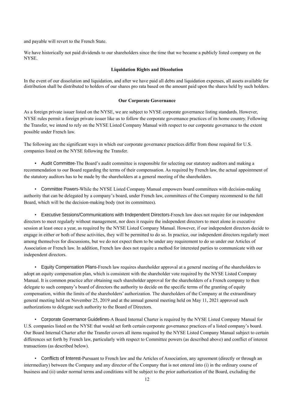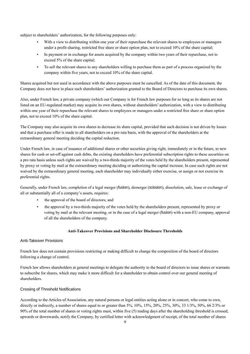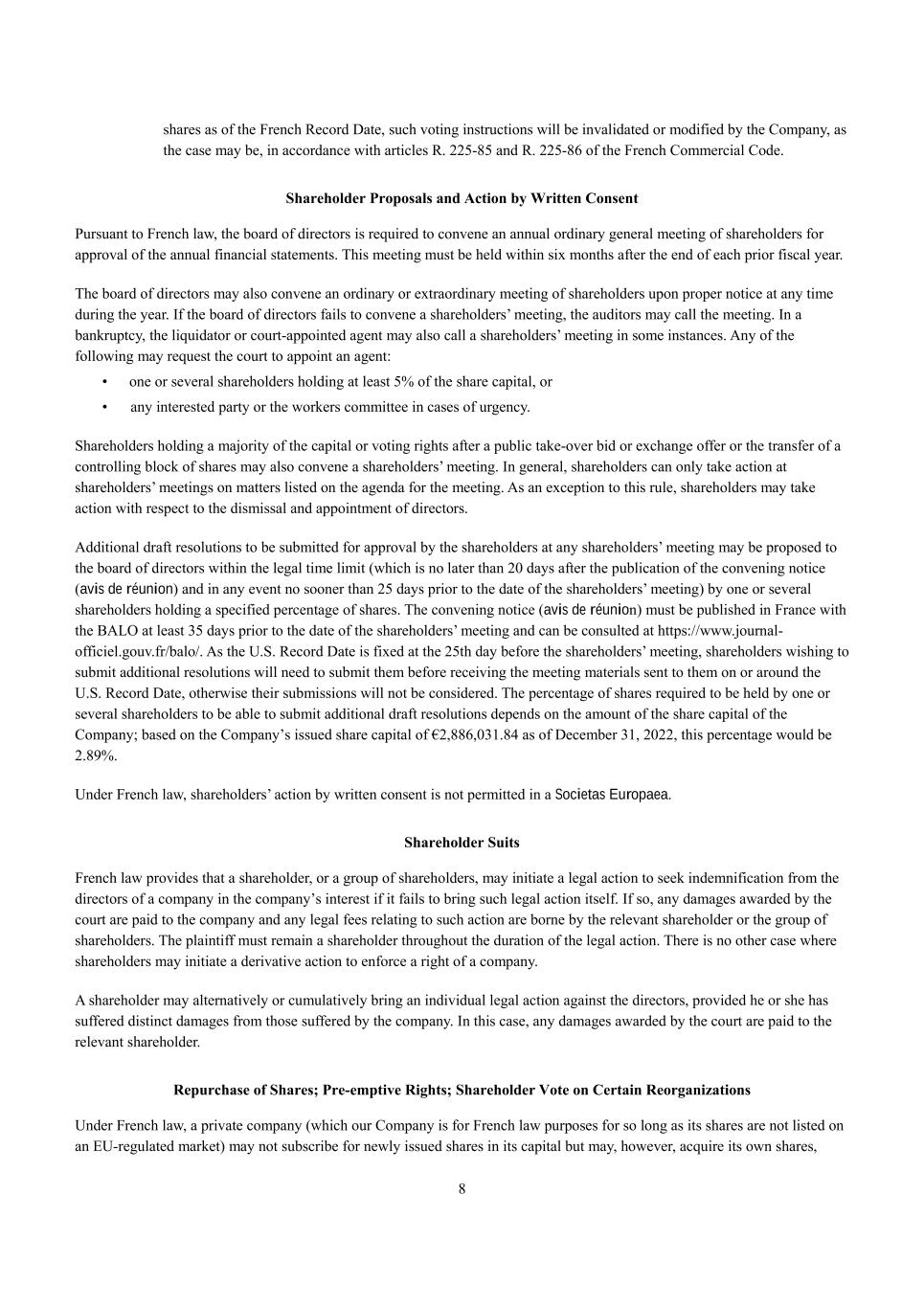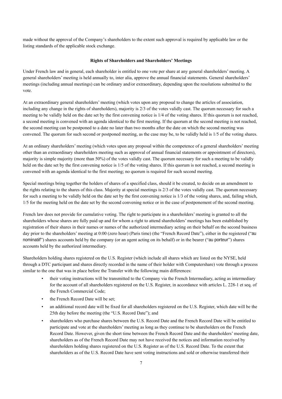 •Any inability of the Company to continue to benefit from French provisions applicable to registered intermediaries (“intermédiaires inscrits”) could adversely affect the rights of shareholders.