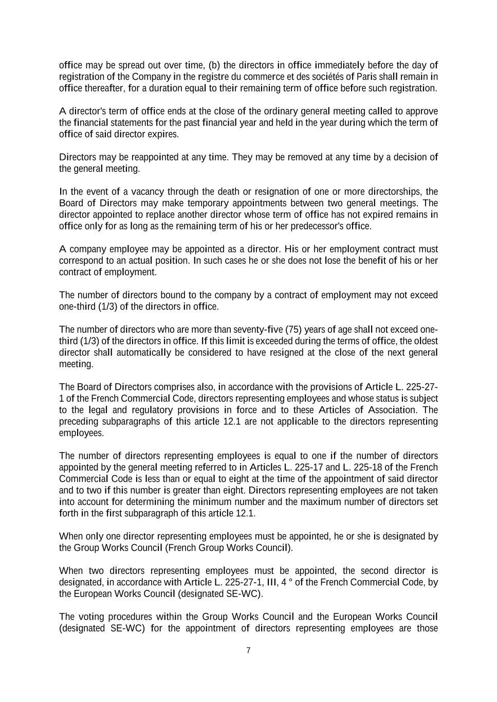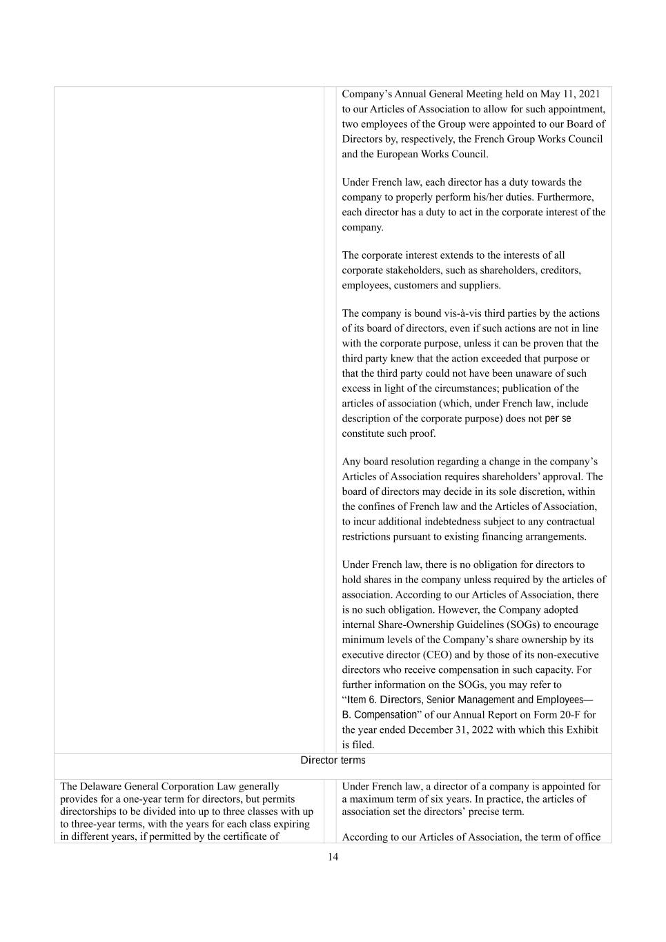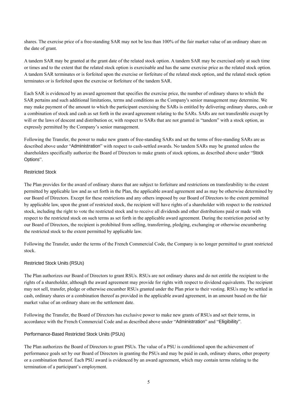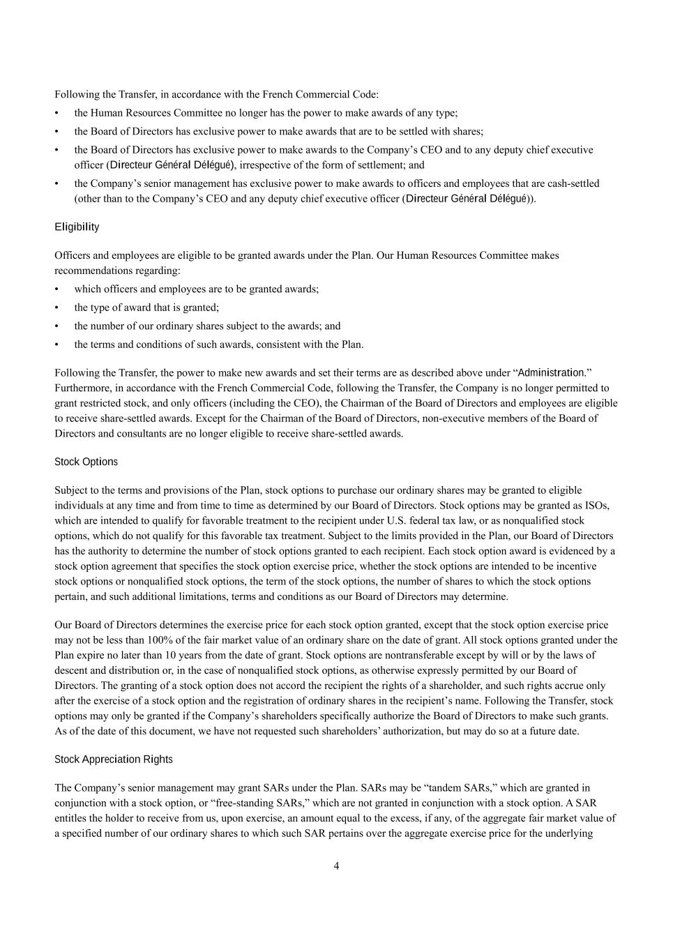 2022 Award Agreement 9 closing price of a Share on the date immediately preceding the date of such Change in Control (“Converted RSUs”); (ii) any PSUs that have not previously vested or lapsed will be converted into a cash-denominated right equal in value to (A) the higher of (I) the Base Amount and (II) the number of Shares determined on the basis of the actual TSR, measured for such purposes as of the date immediately preceding the date of such Change in Control, which, for such purposes, will become the last day of the Performance Period multiplied by (B) the closing price of a Share on the date immediately preceding the date of such Change in Control (“Converted PSUs” and together with the Converted RSUs, the “Converted Units”); and (iii) the Converted Units will vest subject to the terms of, and at the same time as, the RSUs or PSUs from which the Converted Unit originated, provided that upon a Termination without Cause or Voluntary Termination for Good Reason of a Participant occurring upon such Change in Control or during any period thereafter that is prior to the last Vesting Date under this Award Agreement: 1. the date of such Termination will become the Vesting Date of any then outstanding Converted Units held by such Participant, and all outstanding Converted Units held by such Participant will fully vest and settle upon such Termination 2. to the extent permitted by applicable law, the Delivery Date of the Converted Units that have vested in accordance with the foregoing will be accelerated to occur on or as soon as practicable after the occurrence of the Termination, provided that (A) for French-resident Participants and for Grants that are subject to Article L. 225-197-1 of the French Commercial Code, if the Termination occurs (x) before the first anniversary of the Grant Date, the Board may defer the Delivery Date until such first anniversary and thereafter impose a mandatory holding period until the second anniversary of the Grant Date and (y) after the first anniversary of the Grant Date but before the second anniversary of the Grant Date, the Board may impose a mandatory holding period from the Delivery Date until the second anniversary of the Grant Date and (B) for Participants who are U.S. taxpayers, the originally scheduled Delivery Date will be maintained unless (x) a Change in Control occurs at the 50% threshold originally provided in Section 10(b) of the Plan or (y) the Board determines that the acceleration of the Delivery Date provided for above would be permissible under Section 409A and would not result in the imposition of any additional tax, penalty or surcharge on Participants under such Section 409A. For the avoidance of doubt, any limitation on the acceleration of delivery resulting from the foregoing clauses (A) or (B) shall have no effect on the acceleration of vesting provided for under clauses (i), (ii) and (iii) above, and 3. for purposes of the foregoing, “Voluntary Termination for Good Reason” shall mean a termination of the Participant’s employment at the Participant’s initiative following the occurrence, without prior written consent, of one or more of the following events: i. a material reduction in the Participant’s base salary and/or the Participant’s target bonus or long-term