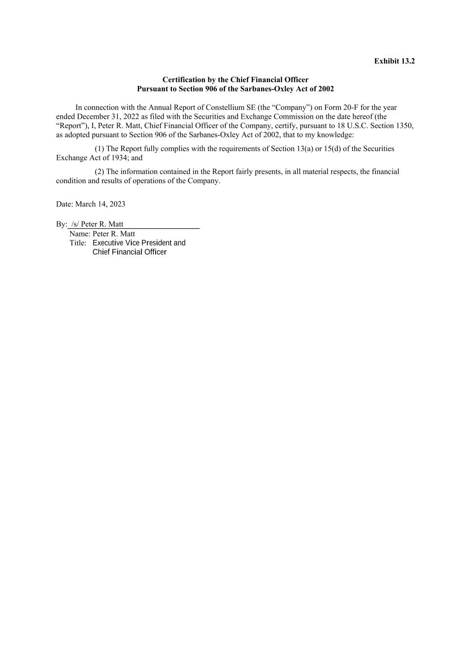 Exhibit 13.2 Certification by the Chief Financial Officer Pursuant to Section 906 of the Sarbanes-Oxley Act of 2002 In connection with the Annual Report of Constellium SE (the “Company”) on Form 20-F for the year ended December 31, 2022 as filed with the Securities and Exchange Commission on the date hereof (the “Report”), I, Peter R. Matt, Chief Financial Officer of the Company, certify, pursuant to 18 U.S.C. Section 1350, as adopted pursuant to Section 906 of the Sarbanes-Oxley Act of 2002, that to my knowledge: (1) The Report fully complies with the requirements of Section 13(a) or 15(d) of the Securities Exchange Act of 1934; and (2) The information contained in the Report fairly presents, in all material respects, the financial condition and results of operations of the Company. Date: March 14, 2023 By: /s/ Peter R. Matt Name: Peter R. Matt Title: Executive Vice President and Chief Financial Officer