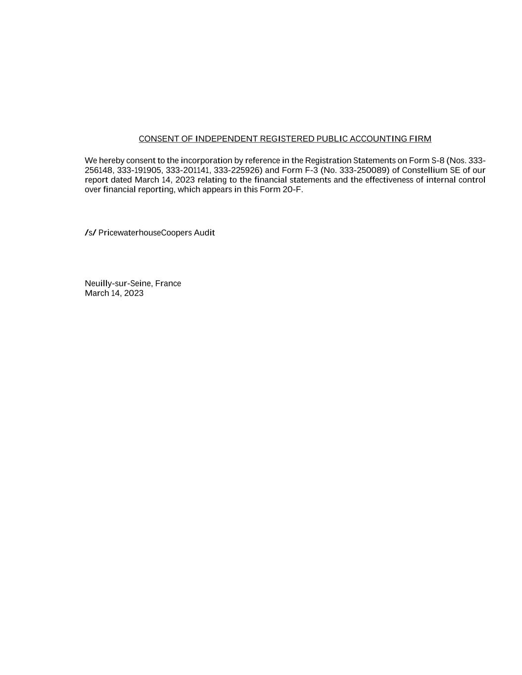 CONSENT OF INDEPENDENT REGISTERED PUBLIC ACCOUNTING FIRM We hereby consent to the incorporation by reference in the Registration Statements on Form S-8 (Nos. 333- 256148, 333-191905, 333-201141, 333-225926) and Form F-3 (No. 333-250089) of Constellium SE of our report dated March 14, 2023 relating to the financial statements and the effectiveness of internal control over financial reporting, which appears in this Form 20-F. /s/ PricewaterhouseCoopers Audit Neuilly-sur-Seine, France March 14, 2023