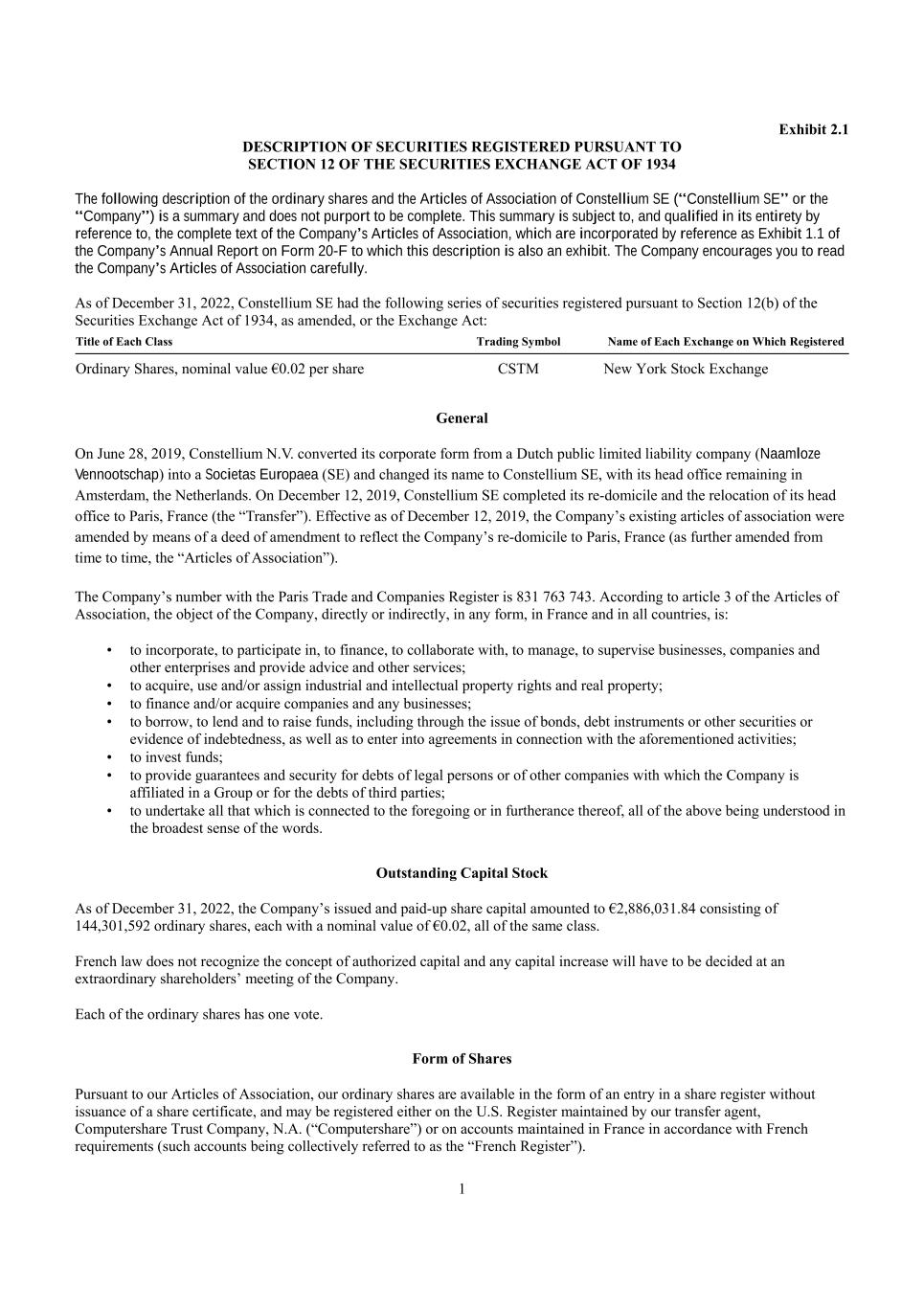 Exhibit 21.1 Subsidiaries of Constellium SE as of December 31, 2022 Subsidiary Jurisdiction Alcan International Network México S.A. de C.V. Mexico AluInfra Services SA Switzerland Astrex Inc. Canada Constellium Automotive México, S. DE R.L. DE C.V Mexico Constellium Automotive México Trading, S. DE R.L. DE C.V. Mexico Constellium Automotive (Nanjing) Co., Ltd. China Constellium Automotive Spain, S.L. Spain Constellium Automotive USA, LLC Delaware Constellium Automotive Žilina, s.r.o. Slovak Republic Constellium Bowling Green LLC Delaware Constellium China China Constellium Deutschland GmbH Germany Constellium Engley (Changchun) Automotive Structures Co Ltd. China Constellium Extrusions Burg GmbH Germany Constellium Extrusions Decin s.r.o. Czech Republic Constellium Extrusions Deutschland GmbH Germany Constellium Extrusions France France Constellium Extrusions Landau GmbH Germany Constellium Extrusions Levice S.r.o. Slovak Republic Constellium Finance France Constellium France III France Constellium France Holdco France Constellium Germany Holdco GmbH & Co. KG Germany Constellium Germany Verwaltungs GmbH Germany Constellium Holdings Muscle Shoals LLC Delaware Constellium International France Constellium Issoire France Constellium Japan KK Japan Constellium Metal Procurement LLC Constellium Montreuil Juigné Delaware France Constellium Muscle Shoals LLC Delaware Constellium Muscle Shoals Funding II LLC Delaware Constellium Muscle Shoals Funding III LLC Constellium Neuf Brisach France Constellium Paris France Constellium Rolled Products Ravenswood, LLC Delaware Constellium Rolled Products Singen GmbH & Co. KG Germany Constellium Singen GmbH Germany Constellium Switzerland AG Switzerland Constellium Treuhand UG (haftunsgbeschränkt) Germany Constellium UK Limited United Kingdom Constellium US Holdings I, LLC Delaware Constellium US Intermediate Holdings LLC Delaware Constellium Ussel France Constellium Valais SA Switzerland C-TEC Constellium Technology Center France Engineered Products International SAS France