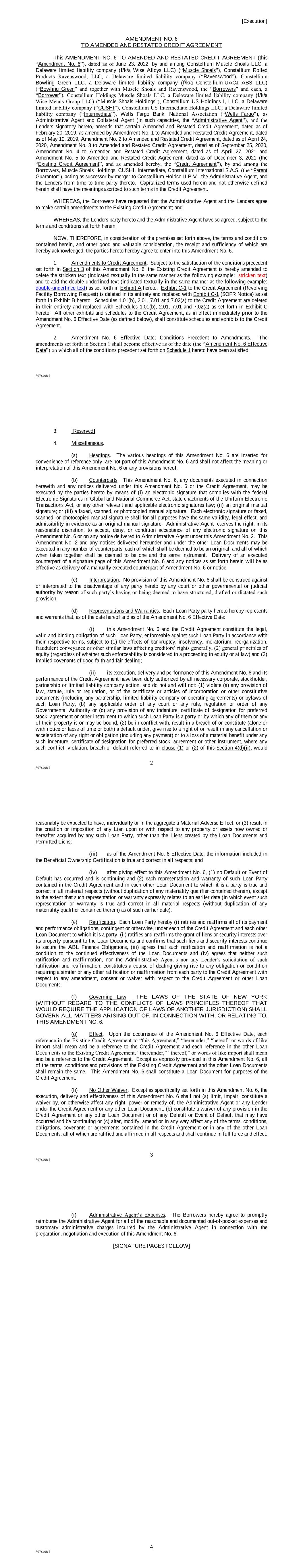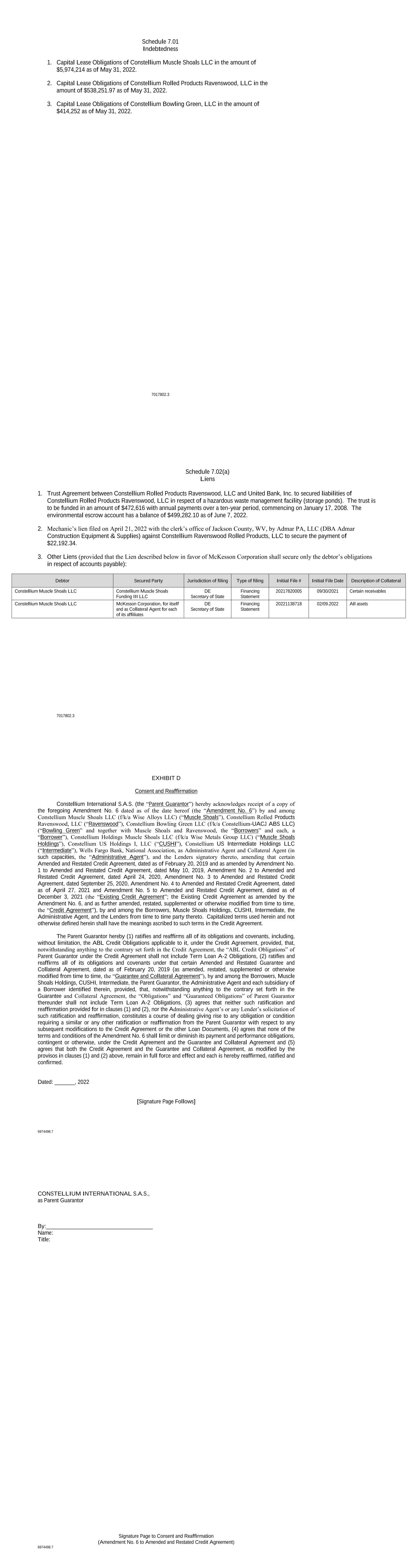 7017802.3 Schedule 7.01 Indebtedness 1. Capital Lease Obligations of Constellium Muscle Shoals LLC in the amount of $5,974,214 as of May 31, 2022. 2. Capital Lease Obligations of Constellium Rolled Products Ravenswood, LLC in the amount of $538,251.97 as of May 31, 2022. 3. Capital Lease Obligations of Constellium Bowling Green, LLC in the amount of $414,252 as of May 31, 2022. 7017802.3 Schedule 7.02(a) Liens 1. Trust Agreement between Constellium Rolled Products Ravenswood, LLC and United Bank, Inc. to secured liabilities of Constellium Rolled Products Ravenswood, LLC in respect of a hazardous waste management facility (storage ponds). The trust is to be funded in an amount of $472,616 with annual payments over a ten-year period, commencing on January 17, 2008. The environmental escrow account has a balance of $499,282.10 as of June 7, 2022. 2. Mechanic’s lien filed on April 21, 2022 with the clerk’s office of Jackson County, WV, by Admar PA, LLC (DBA Admar Construction Equipment & Supplies) against Constellium Ravenswood Rolled Products, LLC to secure the payment of $22,192.34. 3. Other Liens (provided that the Lien described below in favor of McKesson Corporation shall secure only the debtor’s obligations in respect of accounts payable): Debtor Secured Party Jurisdiction of filing Type of filing Initial File # Initial File Date Description of Collateral Constellium Muscle Shoals LLC Constellium Muscle Shoals Funding III LLC DE Secretary of State Financing Statement 20217820005 09/30/2021 Certain receivables Constellium Muscle Shoals LLC McKesson Corporation, for itself and as Collateral Agent for each of its affiliates DE Secretary of State Financing Statement 20221138718 02/09.2022 All assets 6974498.7 EXHIBIT D Consent and Reaffirmation Constellium International S.A.S. (the “Parent Guarantor”) hereby acknowledges receipt of a copy of the foregoing Amendment No. 6 dated as of the date hereof (the “Amendment No. 6”) by and among Constellium Muscle Shoals LLC (f/k/a Wise Alloys LLC) (“Muscle Shoals”), Constellium Rolled Products Ravenswood, LLC (“Ravenswood”), Constellium Bowling Green LLC (f/k/a Constellium-UACJ ABS LLC) (“Bowling Green” and together with Muscle Shoals and Ravenswood, the “Borrowers” and each, a “Borrower”), Constellium Holdings Muscle Shoals LLC (f/k/a Wise Metals Group LLC) (“Muscle Shoals Holdings”), Constellium US Holdings I, LLC (“CUSHI”), Constellium US Intermediate Holdings LLC (“Intermediate”), Wells Fargo Bank, National Association, as Administrative Agent and Collateral Agent (in such capacities, the “Administrative Agent”), and the Lenders signatory thereto, amending that certain Amended and Restated Credit Agreement, dated as of February 20, 2019 and as amended by Amendment No. 1 to Amended and Restated Credit Agreement, dated May 10, 2019, Amendment No. 2 to Amended and Restated Credit Agreement, dated April 24, 2020, Amendment No. 3 to Amended and Restated Credit Agreement, dated September 25, 2020, Amendment No. 4 to Amended and Restated Credit Agreement, dated as of April 27, 2021 and Amendment No. 5 to Amended and Restated Credit Agreement, dated as of December 3, 2021 (the “Existing Credit Agreement”; the Existing Credit Agreement as amended by the Amendment No. 6, and as further amended, restated, supplemented or otherwise modified from time to time, the “Credit Agreement”), by and among the Borrowers, Muscle Shoals Holdings, CUSHI, Intermediate, the Administrative Agent, and the Lenders from time to time party thereto. Capitalized terms used herein and not otherwise defined herein shall have the meanings ascribed to such terms in the Credit Agreement. The Parent Guarantor hereby (1) ratifies and reaffirms all of its obligations and covenants, including, without limitation, the ABL Credit Obligations applicable to it, under the Credit Agreement, provided, that, notwithstanding anything to the contrary set forth in the Credit Agreement, the “ABL Credit Obligations” of Parent Guarantor under the Credit Agreement shall not include Term Loan A-2 Obligations, (2) ratifies and reaffirms all of its obligations and covenants under that certain Amended and Restated Guarantee and Collateral Agreement, dated as of February 20, 2019 (as amended, restated, supplemented or otherwise modified from time to time, the “Guarantee and Collateral Agreement”), by and among the Borrowers, Muscle Shoals Holdings, CUSHI, Intermediate, the Parent Guarantor, the Administrative Agent and each subsidiary of a Borrower identified therein, provided, that, notwithstanding anything to the contrary set forth in the Guarantee and Collateral Agreement, the “Obligations” and “Guaranteed Obligations” of Parent Guarantor thereunder shall not include Term Loan A-2 Obligations, (3) agrees that neither such ratification and reaffirmation provided for in clauses (1) and (2), nor the Administrative Agent’s or any Lender’s solicitation of such ratification and reaffirmation, constitutes a course of dealing giving rise to any obligation or condition requiring a similar or any other ratification or reaffirmation from the Parent Guarantor with respect to any subsequent modifications to the Credit Agreement or the other Loan Documents, (4) agrees that none of the terms and conditions of the Amendment No. 6 shall limit or diminish its payment and performance obligations, contingent or otherwise, under the Credit Agreement and the Guarantee and Collateral Agreement and (5) agrees that both the Credit Agreement and the Guarantee and Collateral Agreement, as modified by the provisos in clauses (1) and (2) above, remain in full force and effect and each is hereby reaffirmed, ratified and confirmed. Dated: _______, 2022 [Signature Page Follows] Signature Page to Consent and Reaffirmation (Amendment No. 6 to Amended and Restated Credit Agreement) 6974498.7 CONSTELLIUM INTERNATIONAL S.A.S., as Parent Guarantor By:______________