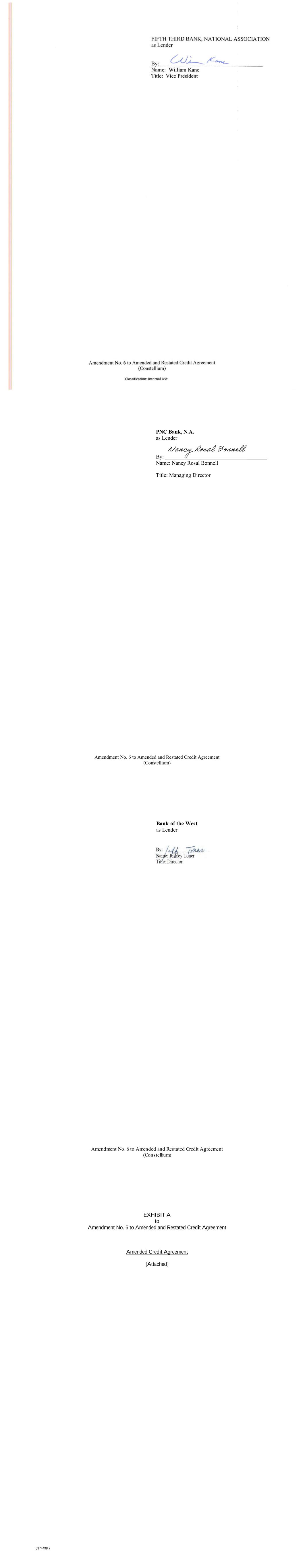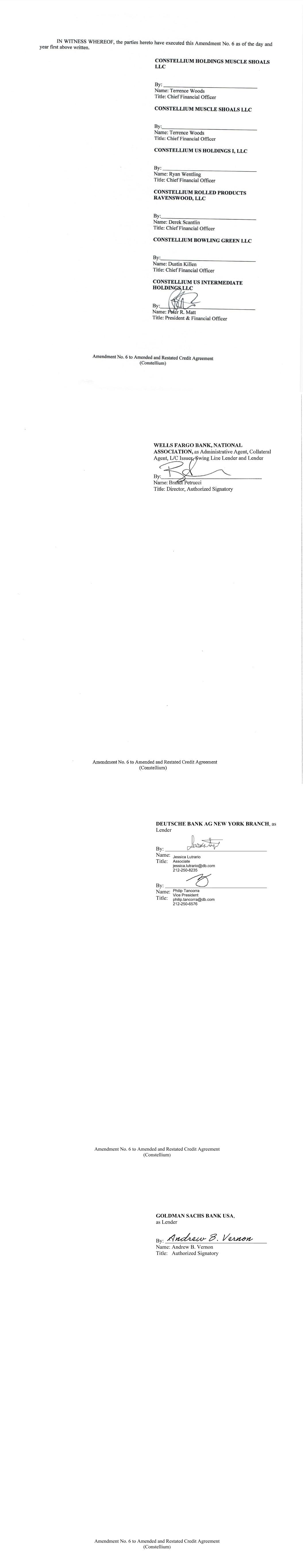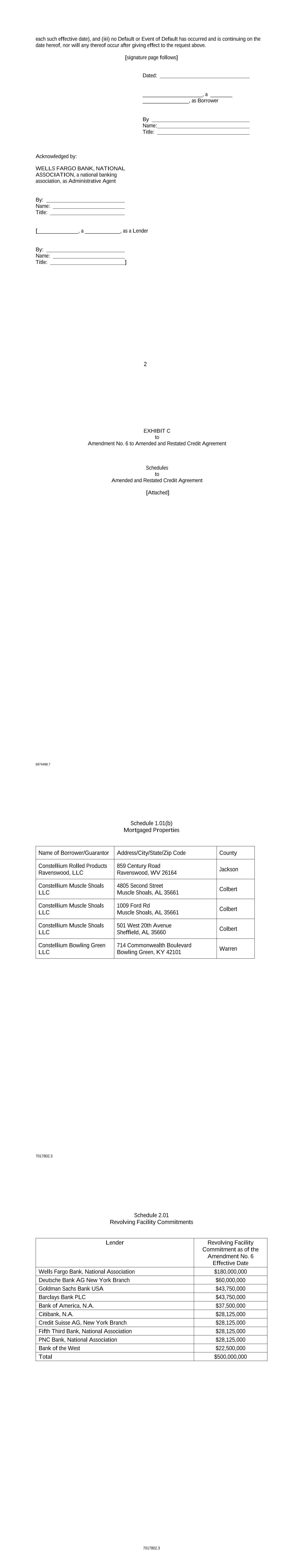 2 each such effective date), and (iii) no Default or Event of Default has occurred and is continuing on the date hereof, nor will any thereof occur after giving effect to the request above. [signature page follows] Dated: ______________________, a ________ _________________, as Borrower By Name: Title: Acknowledged by: WELLS FARGO BANK, NATIONAL ASSOCIATION, a national banking association, as Administrative Agent By: Name: Title: [_______________, a _____________, as a Lender By: Name: Title: ] 6974498.7 EXHIBIT C to Amendment No. 6 to Amended and Restated Credit Agreement Schedules to Amended and Restated Credit Agreement [Attached] 7017802.3 Schedule 1.01(b) Mortgaged Properties Name of Borrower/Guarantor Address/City/State/Zip Code County Constellium Rolled Products Ravenswood, LLC 859 Century Road Ravenswood, WV 26164 Jackson Constellium Muscle Shoals LLC 4805 Second Street Muscle Shoals, AL 35661 Colbert Constellium Muscle Shoals LLC 1009 Ford Rd Muscle Shoals, AL 35661 Colbert Constellium Muscle Shoals LLC 501 West 20th Avenue Sheffield, AL 35660 Colbert Constellium Bowling Green LLC 714 Commonwealth Boulevard Bowling Green, KY 42101 Warren 7017802.3 Schedule 2.01 Revolving Facility Commitments Lender Revolving Facility Commitment as of the Amendment No. 6 Effective Date Wells Fargo Bank, National Association $180,000,000 Deutsche Bank AG New York Branch $60,000,000 Goldman Sachs Bank USA $43,750,000 Barclays Bank PLC $43,750,000 Bank of America, N.A. $37,500,000 Citibank, N.A. $28,125,000 Credit Suisse AG, New York Branch $28,125,000 Fifth Third Bank, National Association $28,125,000 PNC Bank, National Association $28,125,000 Bank of the West $22,500,000 Total $500,000,000