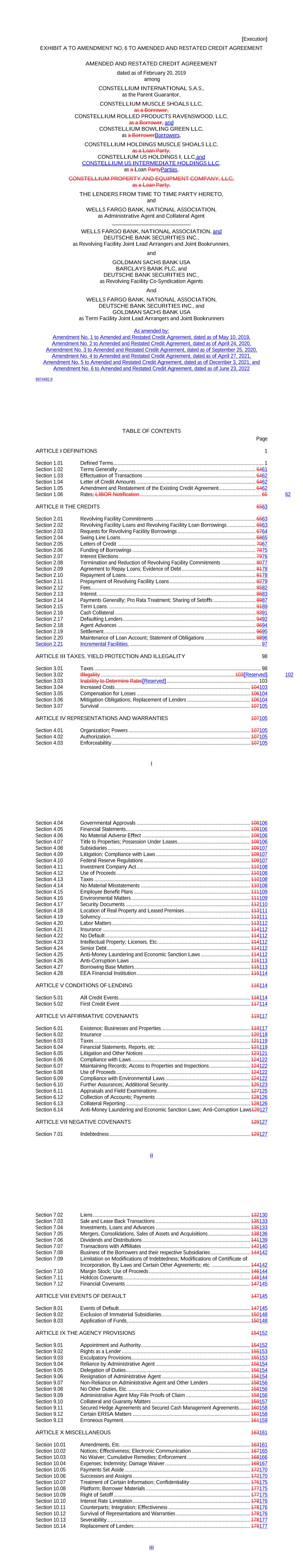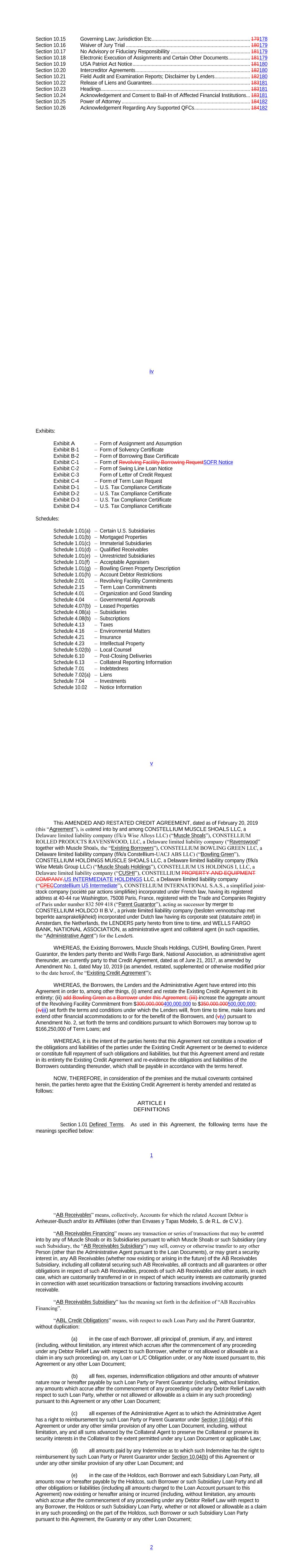 iv Section 10.15 Governing Law; Jurisdiction Etc. ....................................................................... 179178 Section 10.16 Waiver of Jury Trial ........................................................................................... 180179 Section 10.17 No Advisory or Fiduciary Responsibility .......................................................... 181179 Section 10.18 Electronic Execution of Assignments and Certain Other Documents ................ 181179 Section 10.19 USA Patriot Act Notice ...................................................................................... 181180 Section 10.20 Intercreditor Agreements .................................................................................... 182180 Section 10.21 Field Audit and Examination Reports; Disclaimer by Lenders .......................... 182180 Section 10.22 Release of Liens and Guarantees ........................................................................ 183181 Section 10.23 Headings ............................................................................................................. 183181 Section 10.24 Acknowledgement and Consent to Bail-In of Affected Financial Institutions... 183181 Section 10.25 Power of Attorney .............................................................................................. 184182 Section 10.26 Acknowledgement Regarding Any Supported QFCs ......................................... 184182 v Exhibits: Exhibit A – Form of Assignment and Assumption Exhibit B-1 – Form of Solvency Certificate Exhibit B-2 – Form of Borrowing Base Certificate Exhibit C-1 – Form of Revolving Facility Borrowing RequestSOFR Notice Exhibit C-2 – Form of Swing Line Loan Notice Exhibit C-3 Form of Letter of Credit Request Exhibit C-4 – Form of Term Loan Request Exhibit D-1 – U.S. Tax Compliance Certificate Exhibit D-2 – U.S. Tax Compliance Certificate Exhibit D-3 – U.S. Tax Compliance Certificate Exhibit D-4 – U.S. Tax Compliance Certificate Schedules: Schedule 1.01(a) – Certain U.S. Subsidiaries Schedule 1.01(b) – Mortgaged Properties Schedule 1.01(c) – Immaterial Subsidiaries Schedule 1.01(d) – Qualified Receivables Schedule 1.01(e) – Unrestricted Subsidiaries Schedule 1.01(f) – Acceptable Appraisers Schedule 1.01(g) – Bowling Green Property Description Schedule 1.01(h) – Account Debtor Restrictions Schedule 2.01 – Revolving Facility Commitments Schedule 2.15 – Term Loan Commitments Schedule 4.01 – Organization and Good Standing Schedule 4.04 – Governmental Approvals Schedule 4.07(b) – Leased Properties Schedule 4.08(a) – Subsidiaries Schedule 4.08(b) – Subscriptions Schedule 4.13 – Taxes Schedule 4.16 – Environmental Matters Schedule 4.21 – Insurance Schedule 4.23 – Intellectual Property Schedule 5.02(b) – Local Counsel Schedule 6.10 – Post-Closing Deliveries Schedule 6.13 – Collateral Reporting Information Schedule 7.01 – Indebtedness Schedule 7.02(a) – Liens Schedule 7.04 – Investments Schedule 10.02 – Notice Information 1 This AMENDED AND RESTATED CREDIT AGREEMENT, dated as of February 20, 2019 (this “Agreement”), is entered into by and among CONSTELLIUM MUSCLE SHOALS LLC, a Delaware limited liability company (f/k/a Wise Alloys LLC) (“Muscle Shoals”), CONSTELLIUM ROLLED PRODUCTS RAVENSWOOD, LLC, a Delaware limited liability company (“Ravenswood” together with Muscle Shoals, the “Existing Borrowers”), CONSTELLIUM BOWLING GREEN LLC, a Delaware limited liability company (f/k/a Constellium-UACJ ABS LLC) (“Bowling Green”), CONSTELLIUM HOLDINGS MUSCLE SHOALS LLC, a Delaware limited liability company (f/k/a Wise Metals Group LLC) (“Muscle Shoals Holdings”), CONSTELLIUM US HOLDINGS I, LLC, a Delaware limited liability company (“CUSHI”), CONSTELLIUM PROPERTY AND EQUIPMENT COMPANY,US INTERMEDIATE HOLDINGS LLC, a Delaware limited liability company (“CPECConstellium US Intermediate”), CONSTELLIUM INTERNATIONAL S.A.S., a simplified joint- stock company (société par actions simplifiée) incorporated under French law, having its registered address at 40-44 rue Washington, 75008 Paris, France, registered with the Trade and Companies Registry of Paris under number 832 509 418 (“Parent Guarantor”), acting as successor by merger to CONSTELLIUM HOLDCO II B.V., a private limited liability company (besloten vennootschap met beperkte aansprakelijkheid) incorporated under Dutch law having its corporate seat (statutaire zetel) in Amsterdam, the Netherlands, the LENDERS party hereto from time to time, and WELLS FARGO BANK, NATIONAL ASSOCIATION, as administrative agent and collateral agent (in such capacities, the “Administrative Agent”) for the Lenders. WHEREAS, the Existing Borrowers, Muscle Shoals Holdings, CUSHI, Bowling Green, Parent Guarantor, the lenders party thereto and Wells Fargo Bank, National Association, as administrative agent thereunder, are currently party to that Credit Agreement, dated as of June 21, 2017, as amended by Amendment No. 1, dated May 10, 2019 (as amended, restated, supplemented or otherwise modified prior to the date hereof, the “Existing Credit Agreement”); WHEREAS, the Borrowers, the Lenders and the Administrative Agent have entered into this Agreement in order to, among other things, (i) amend and restate the Existing Credit Agreement in its entirety; (ii) add Bowling Green as a Borrower under this Agreement; (iii) increase the aggregate amount of the Revolving Facility Commitment from $300,000,000400,000,000 to $350,000,000500,000,000; (iviii) set forth the terms and conditions under which the Lenders will, from time to time, make loans and extend other financial accommodations to or for the benefit of the Borrowers, and (viv) pursuant to Amendment No. 2, set forth the terms and conditions pursuant to which Borrowers may borrow up to $166,250,000 of Term Loans; and WHEREAS, it is the intent of the parties hereto that this Agreement not con