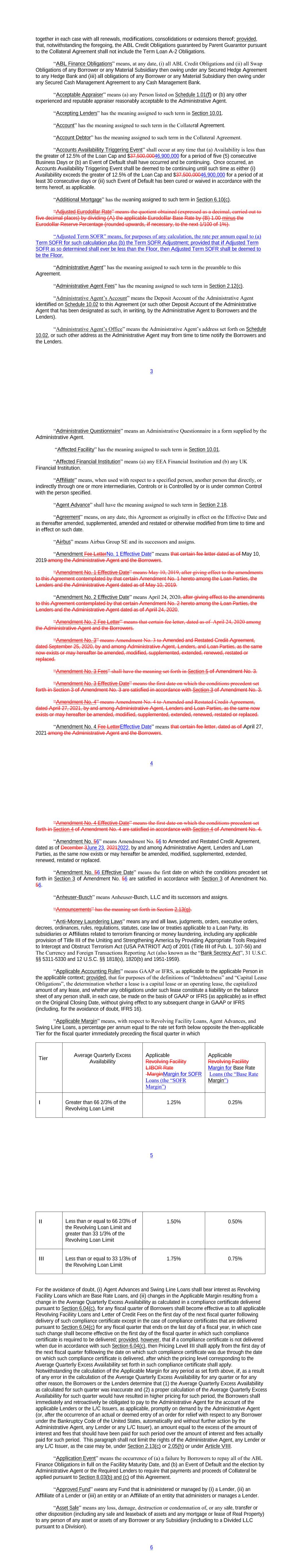 3 together in each case with all renewals, modifications, consolidations or extensions thereof; provided, that, notwithstanding the foregoing, the ABL Credit Obligations guaranteed by Parent Guarantor pursuant to the Collateral Agreement shall not include the Term Loan A-2 Obligations. “ABL Finance Obligations” means, at any date, (i) all ABL Credit Obligations and (ii) all Swap Obligations of any Borrower or any Material Subsidiary then owing under any Secured Hedge Agreement to any Hedge Bank and (iii) all obligations of any Borrower or any Material Subsidiary then owing under any Secured Cash Management Agreement to any Cash Management Bank. “Acceptable Appraiser” means (a) any Person listed on Schedule 1.01(f) or (b) any other experienced and reputable appraiser reasonably acceptable to the Administrative Agent. “Accepting Lenders” has the meaning assigned to such term in Section 10.01. “Account” has the meaning assigned to such term in the Collateral Agreement. “Account Debtor” has the meaning assigned to such term in the Collateral Agreement. “Accounts Availability Triggering Event” shall occur at any time that (a) Availability is less than the greater of 12.5% of the Loan Cap and $37,500,00046,900,000 for a period of five (5) consecutive Business Days or (b) an Event of Default shall have occurred and be continuing. Once occurred, an Accounts Availability Triggering Event shall be deemed to be continuing until such time as either (i) Availability exceeds the greater of 12.5% of the Loan Cap and $37,500,00046,900,000 for a period of at least 30 consecutive days or (ii) such Event of Default has been cured or waived in accordance with the terms hereof, as applicable. “Additional Mortgage” has the meaning assigned to such term in Section 6.10(c). “Adjusted Eurodollar Rate” means the quotient obtained (expressed as a decimal, carried out to five decimal places) by dividing (A) the applicable Eurodollar Base Rate by (B) 1.00 minus the Eurodollar Reserve Percentage (rounded upwards, if necessary, to the next 1/100 of 1%). “Adjusted Term SOFR” means, for purposes of any calculation, the rate per annum equal to (a) Term SOFR for such calculation plus (b) the Term SOFR Adjustment; provided that if Adjusted Term SOFR as so determined shall ever be less than the Floor, then Adjusted Term SOFR shall be deemed to be the Floor. “Administrative Agent” has the meaning assigned to such term in the preamble to this Agreement. “Administrative Agent Fees” has the meaning assigned to such term in Section 2.12(c). “Administrative Agent’s Account” means the Deposit Account of the Administrative Agent identified on Schedule 10.02 to this Agreement (or such other Deposit Account of the Administrative Agent that has been designated as such, in writing, by the Administrative Agent to Borrowers and the Lenders). “Administrative Agent’s Office” means the Administrative Agent’s address set forth on Schedule 10.02, or such other address as the Administrative Agent may from time to time notify the Borrowers and the Lenders. 4 “Administrative Questionnaire” means an Administrative Questionnaire in a form supplied by the Administrative Agent. “Affected Facility” has the meaning assigned to such term in Section 10.01. “Affected Financial Institution” means (a) any EEA Financial Institution and (b) any UK Financial Institution. “Affiliate” means, when used with respect to a specified person, another person that directly, or indirectly through one or more intermediaries, Controls or is Controlled by or is under common Control with the person specified. “Agent Advance” shall have the meaning assigned to such term in Section 2.18. “Agreement” means, on any date, this Agreement as originally in effect on the Effective Date and as thereafter amended, supplemented, amended and restated or otherwise modified from time to time and in effect on such date. “Airbus” means Airbus Group SE and its successors and assigns. “Amendment Fee LetterNo. 1 Effective Date” means that certain fee letter dated as of May 10, 2019 among the Administrative Agent and the Borrowers. “Amendment No. 1 Effective Date” means May 10, 2019, after giving effect to the amendments to this Agreement contemplated by that certain Amendment No. 1 hereto among the Loan Parties, the Lenders and the Administrative Agent dated as of May 10, 2019. “Amendment No. 2 Effective Date” means April 24, 2020, after giving effect to the amendments to this Agreement contemplated by that certain Amendment No. 2 hereto among the Loan Parties, the Lenders and the Administrative Agent dated as of April 24, 2020. “Amendment No. 2 Fee Letter” means that certain fee letter, dated as of April 24, 2020 among the Administrative Agent and the Borrowers. “Amendment No. 3” means Amendment No. 3 to Amended and Restated Credit Agreement, dated September 25, 2020, by and among Administrative Agent, Lenders, and Loan Parties, as the same now exists or may hereafter be amended, modified, supplemented, extended, renewed, restated or replaced. “Amendment No. 3 Fees” shall have the meaning set forth in Section 5 of Amendment No. 3. “Amendment No. 3 Effective Date” means the first date on which the conditions precedent set forth in Section 3 of Amendment No. 3 are satisfied in accordance with Section 3 of Amendment No. 3. “Amendment No. 4” means Amendment No. 4 to Amended and Restated Credit Agreement, dated April 27, 2021, by and among Administrative Agent, Lenders and Loan Parties, as the same now exists or may hereafter be amended, modified, supplemented, extended, renewed, restated or replaced. “Amendment No. 4 Fee LetterEffective Date” means that certain fee letter, dated as of April 27, 2021 among the Administrative Agent and the Borrowers. 5 “Amendment No. 4 Effective Date” means the first date on which the conditions precedent set forth in Section 4 of Amendment 